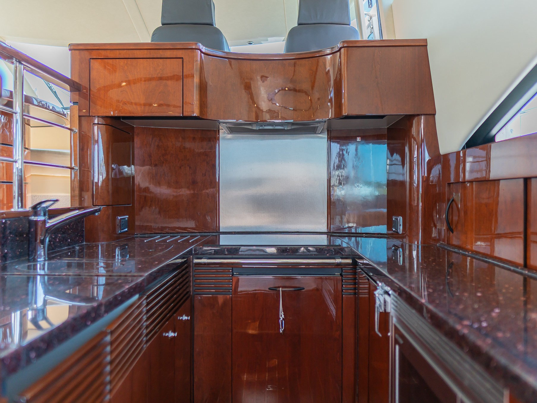 Flybridge wet bar with ice maker, sink, fridge, BBQ & bin.