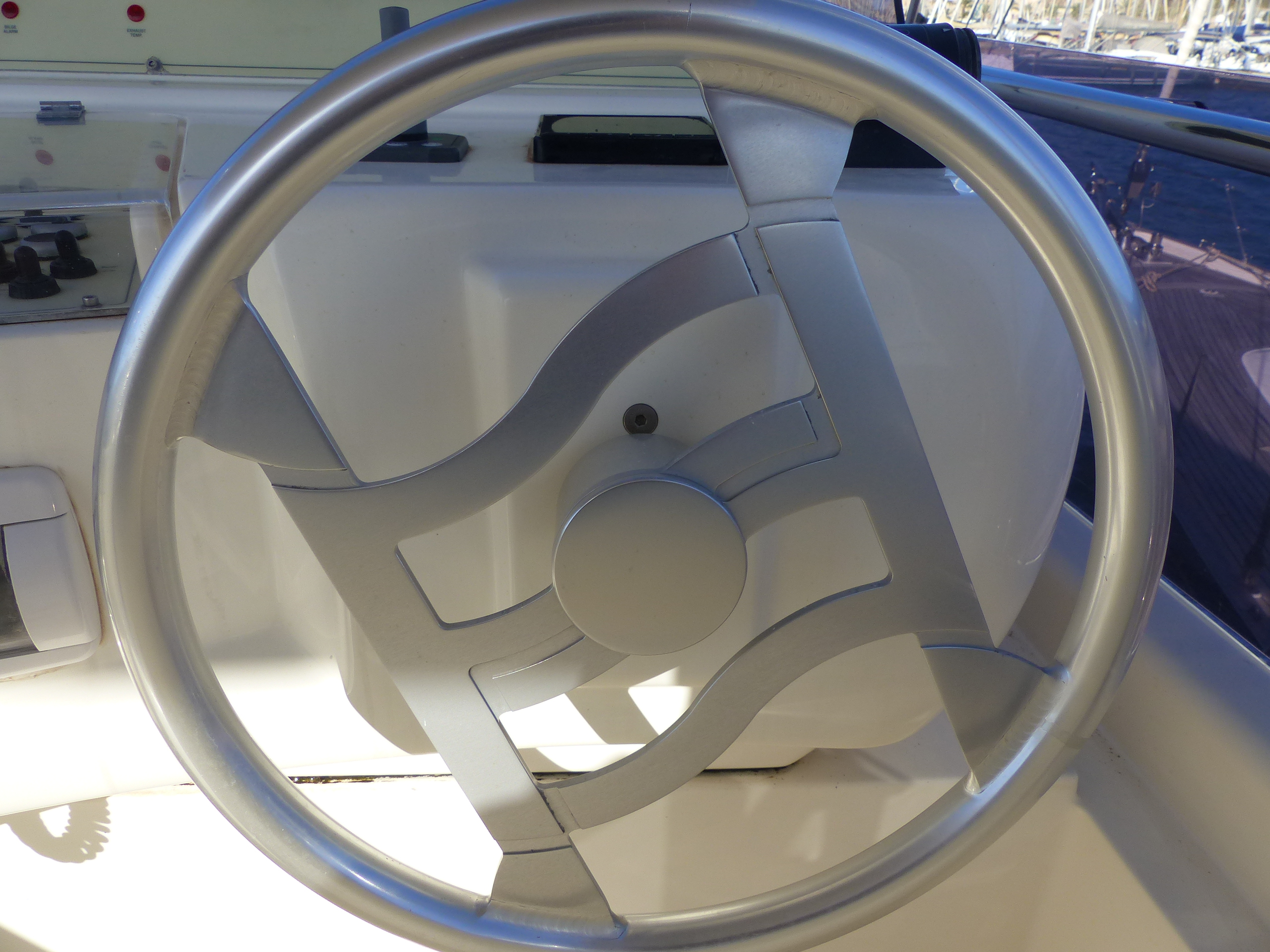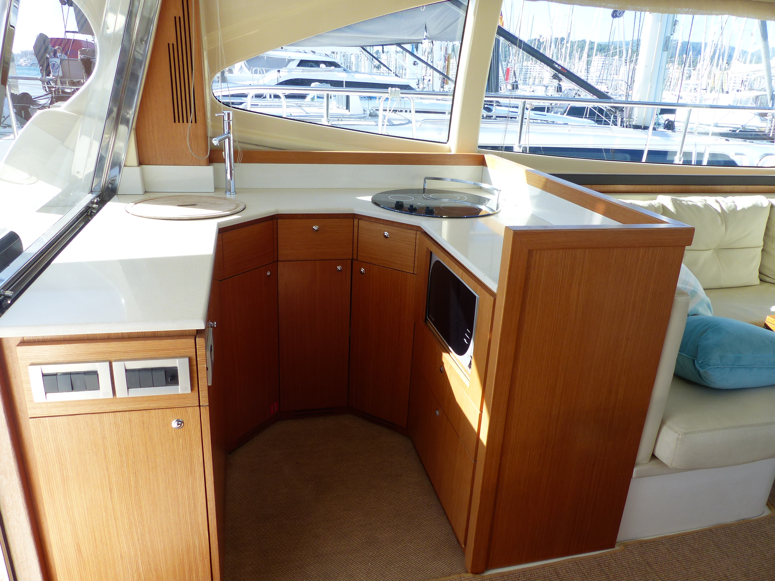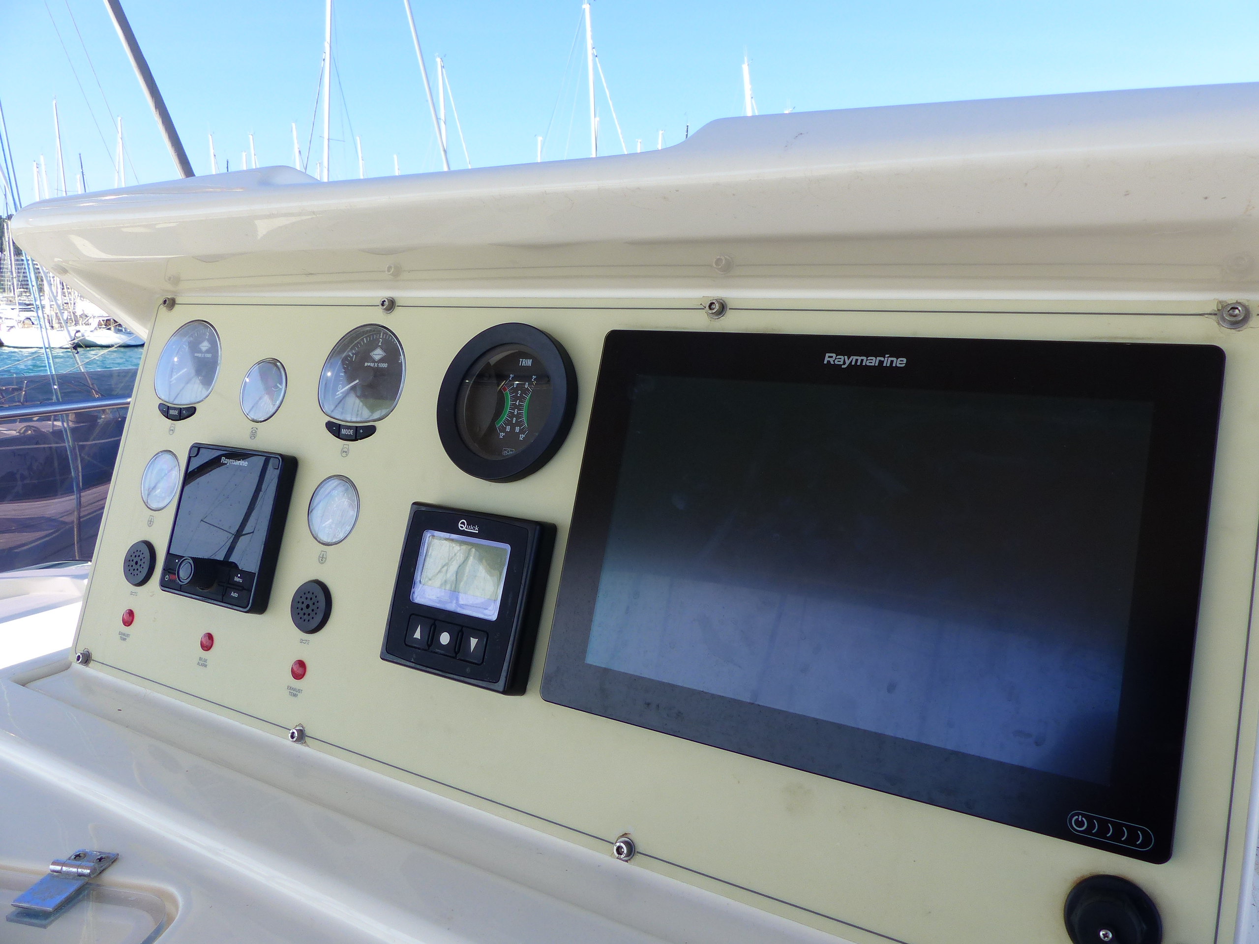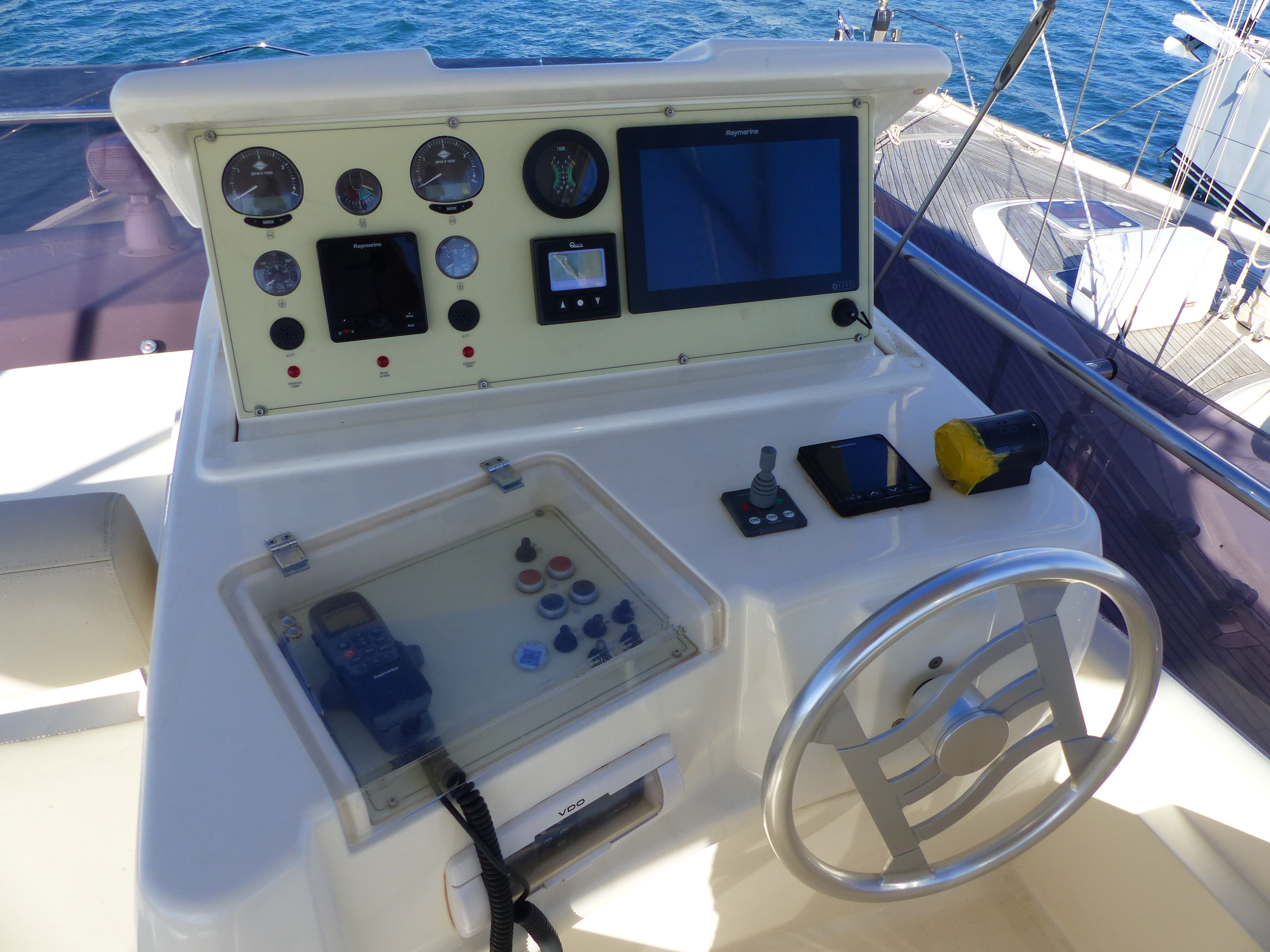 The flybridge benefits from an electric drop down navigation station to starboard where one also finds the steering consul.