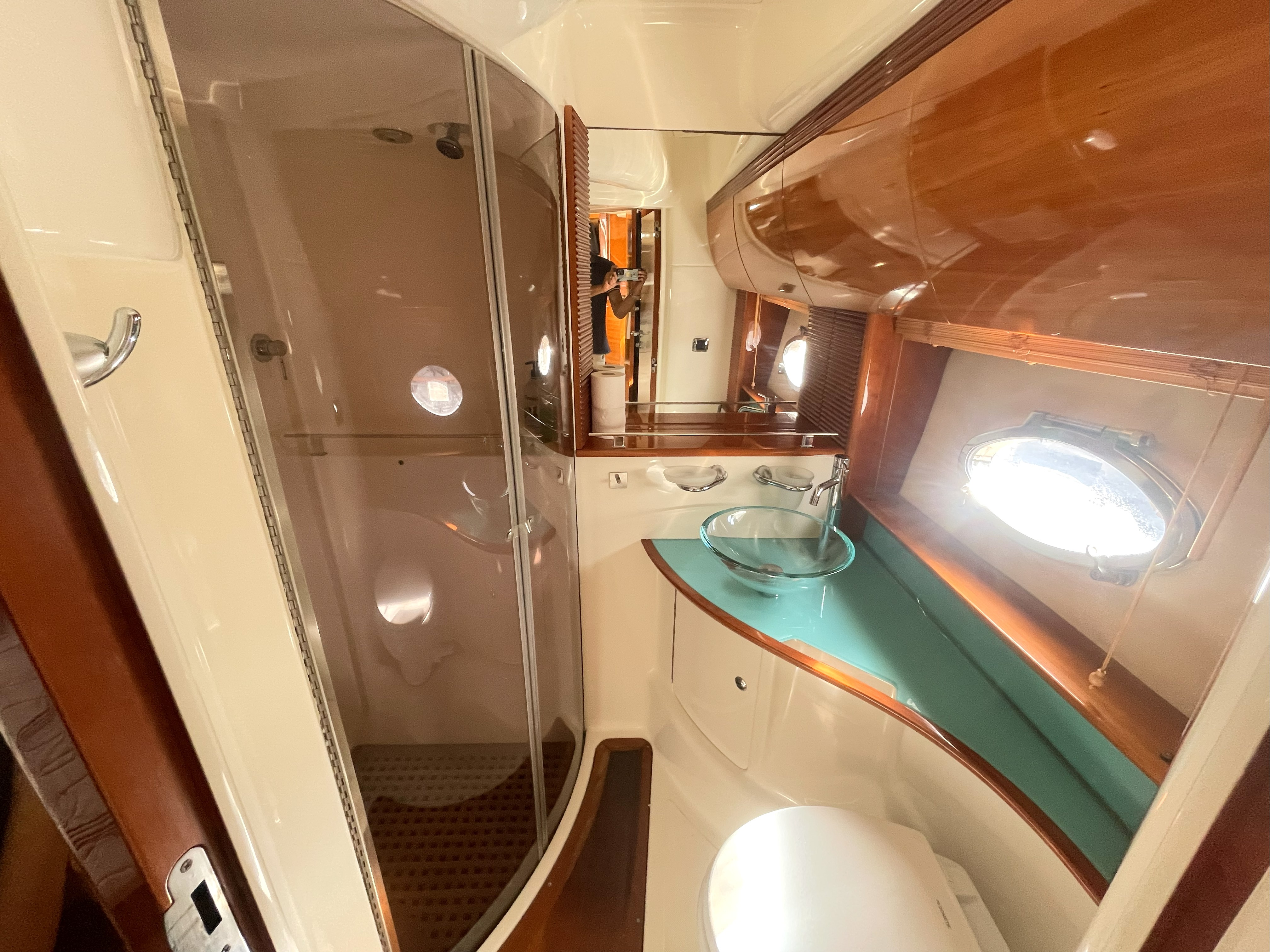 Owners cabin with double berth, plenty of storage and opening port holes. Attached onto an ensuite with a toilet, separate shower, countertop and glass washbasin and plenty of storage cabinets.