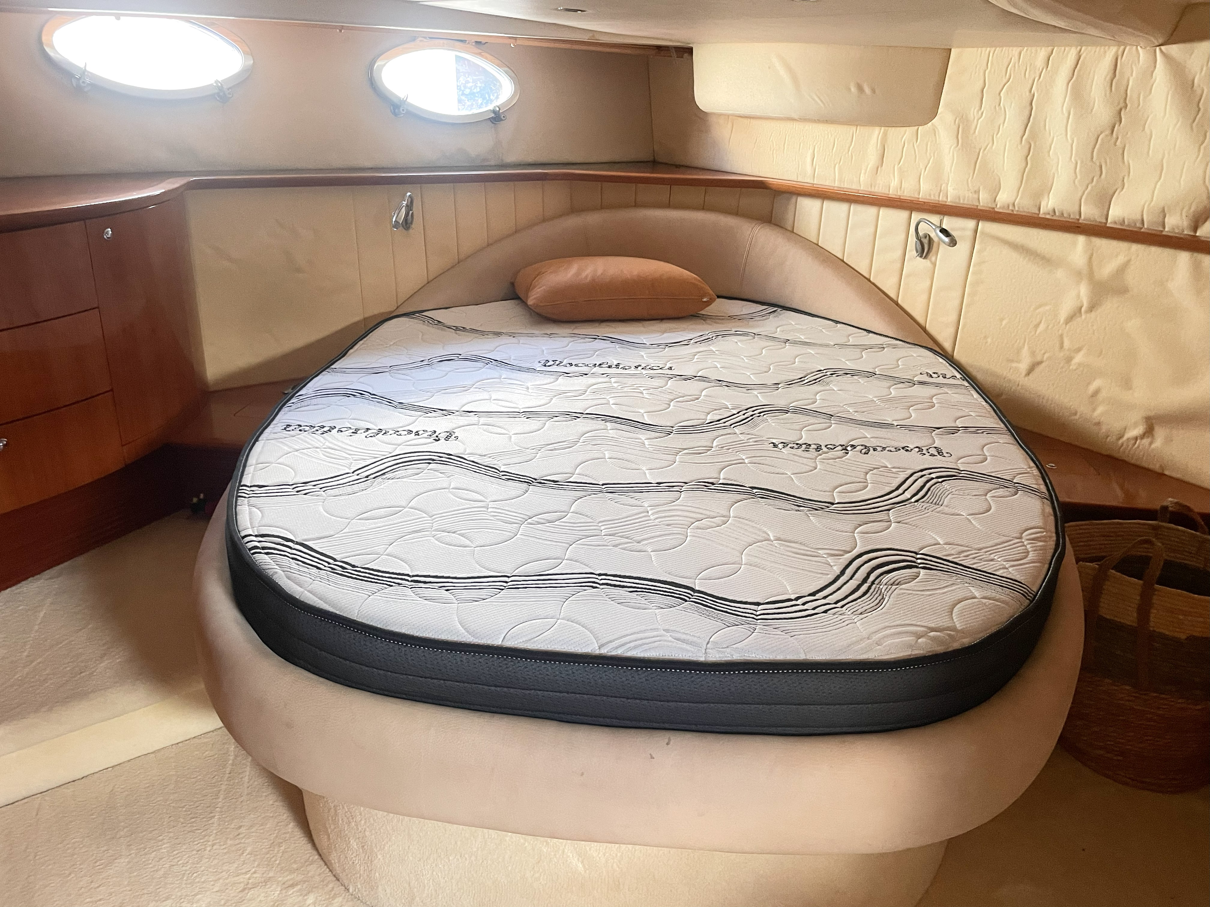 A two person berth in forward cabin with wardrobe and cabinet storage space and opening port holes.