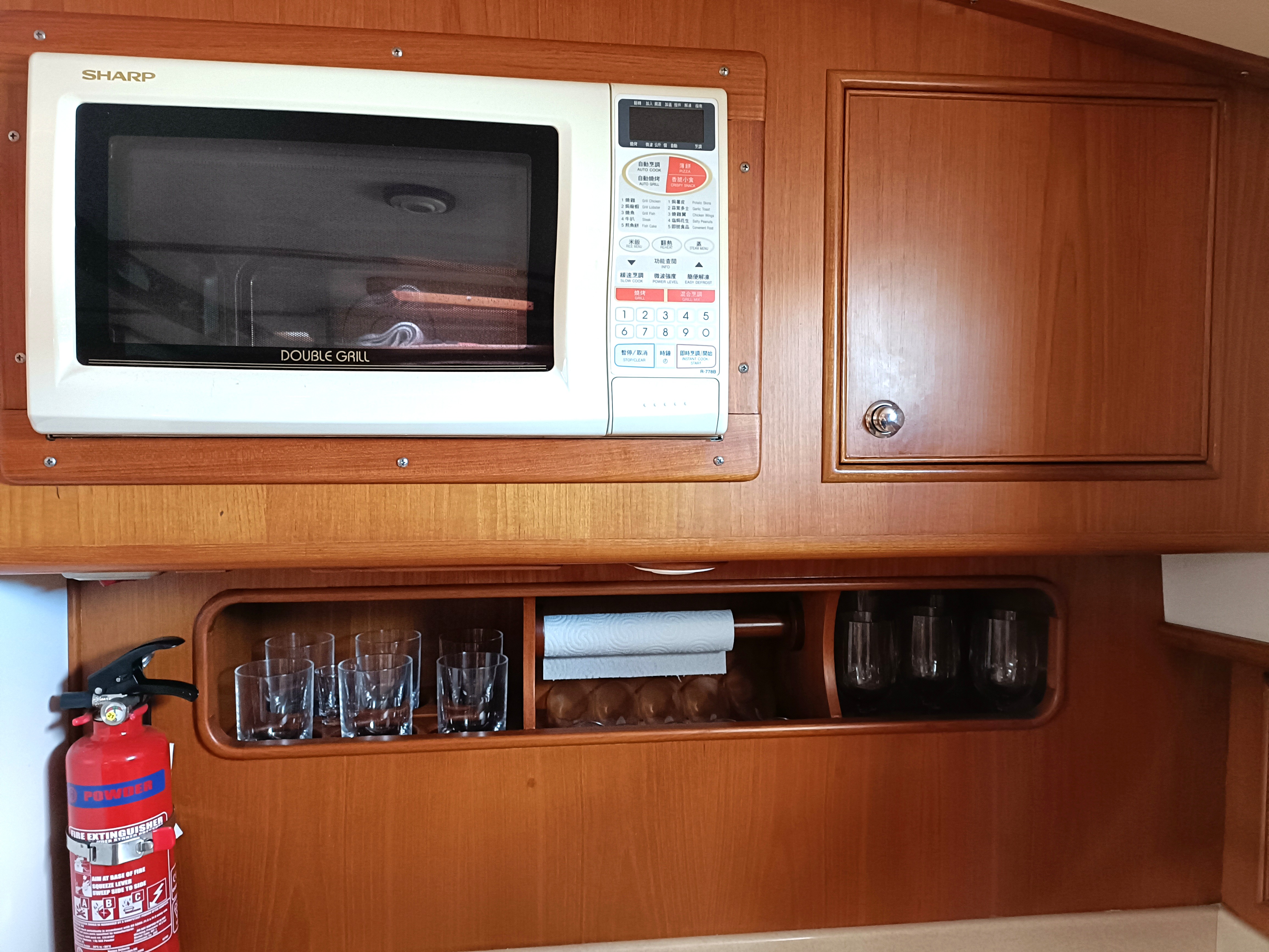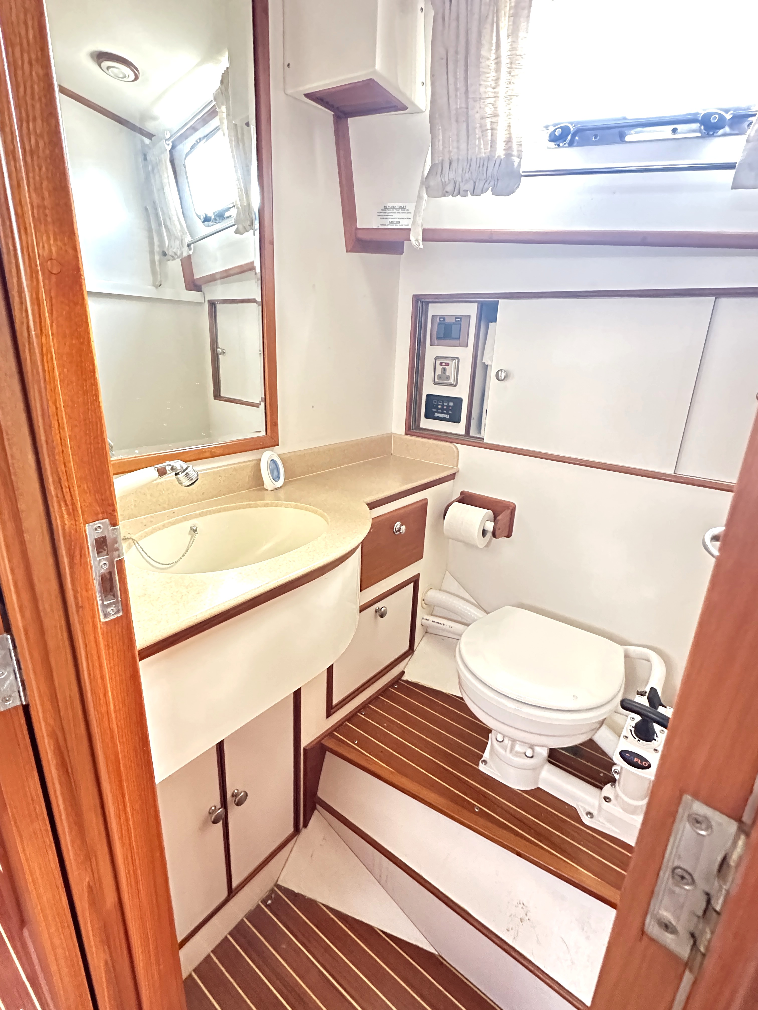 Separate shower unit to port- with teak seat- keeps the heads dry