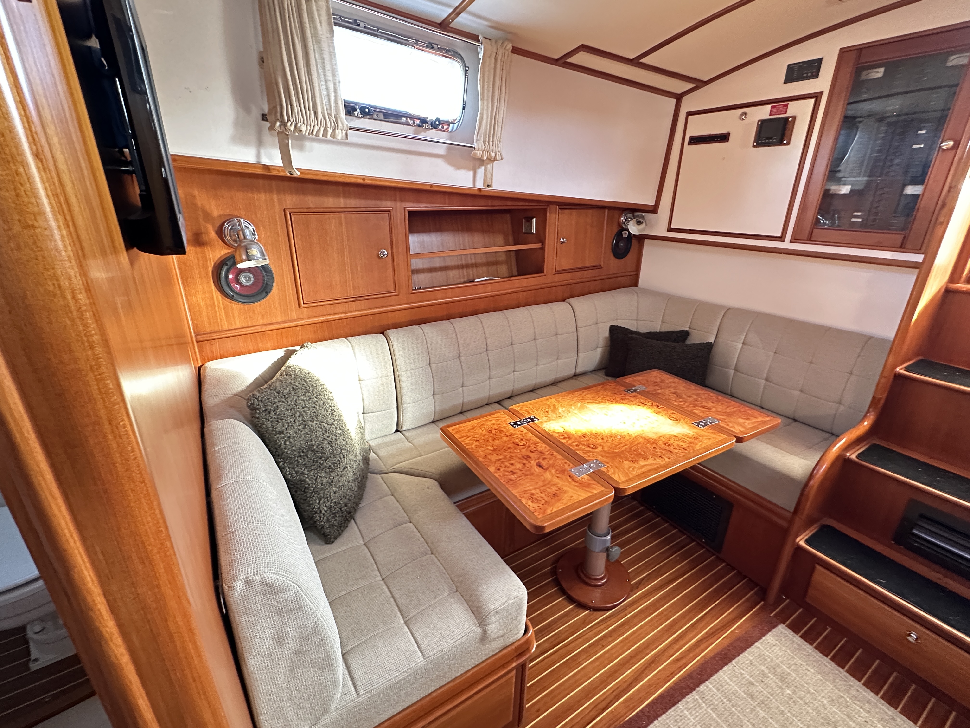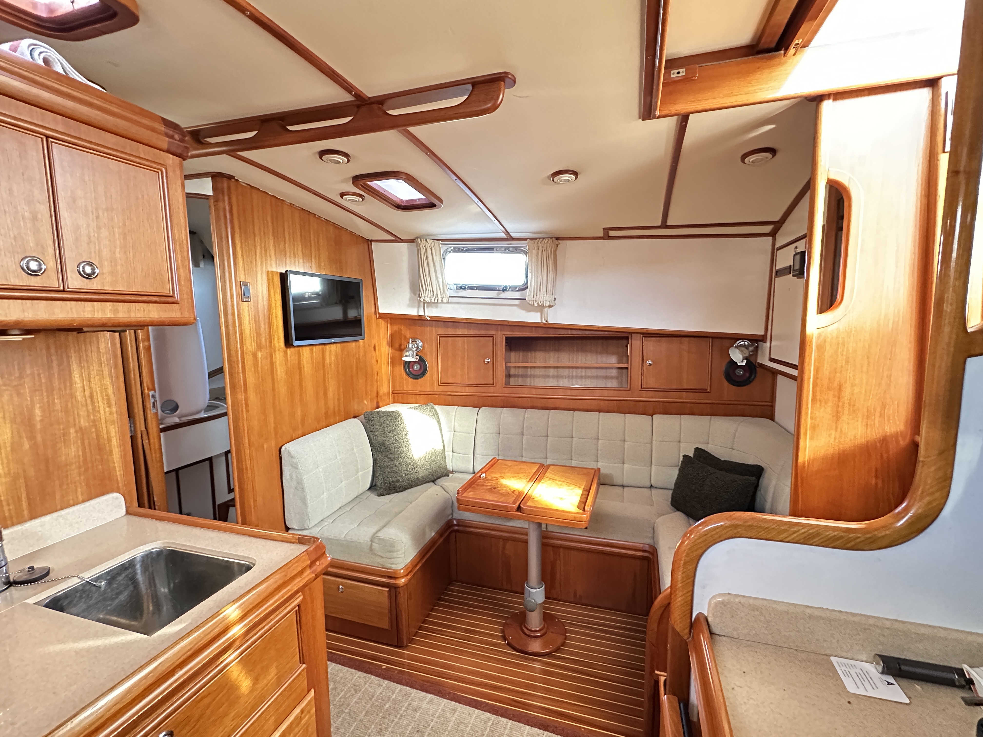 Drop down leafed table converts to double berth, U-shaped settee, curtains and blinds
