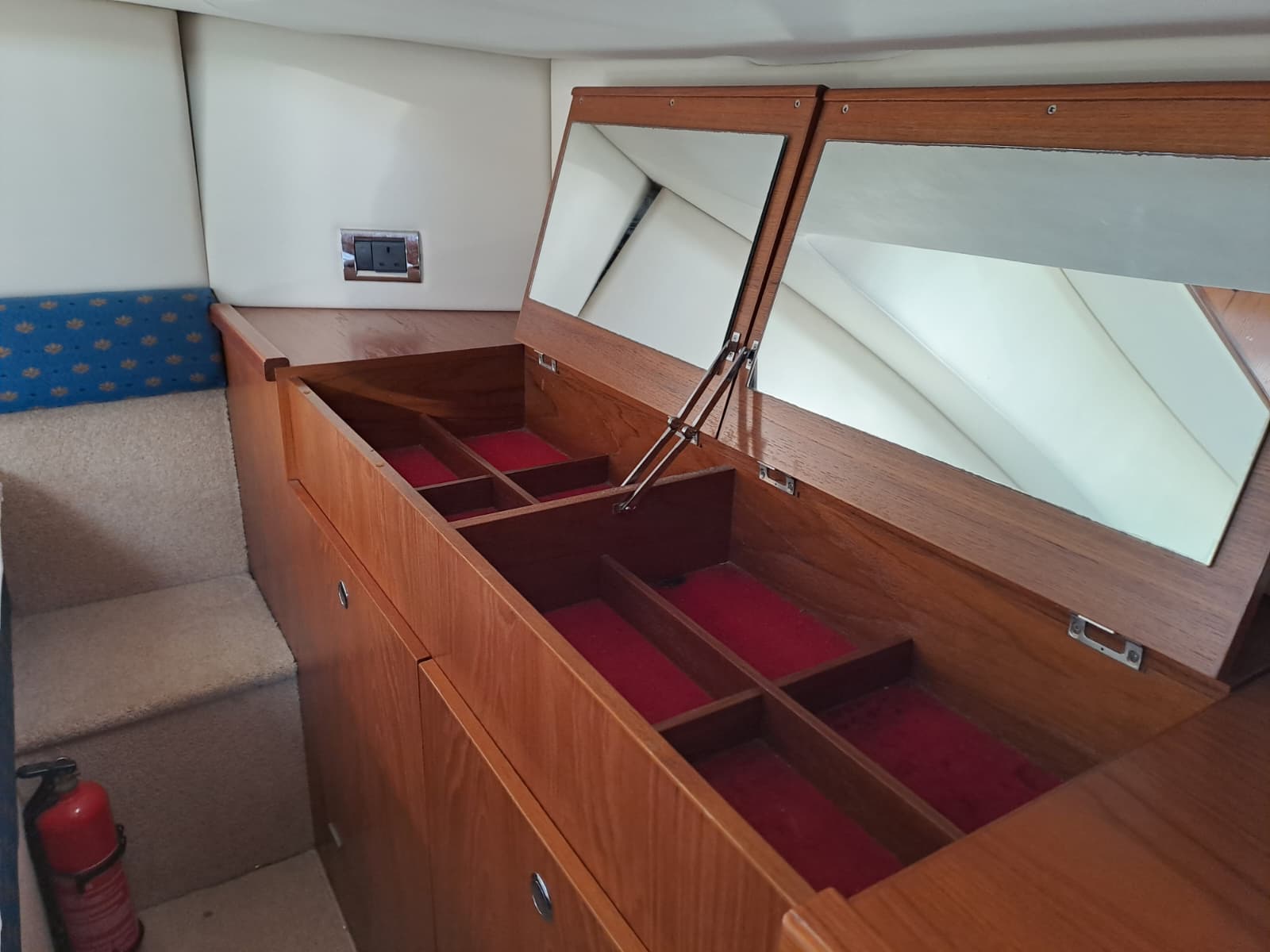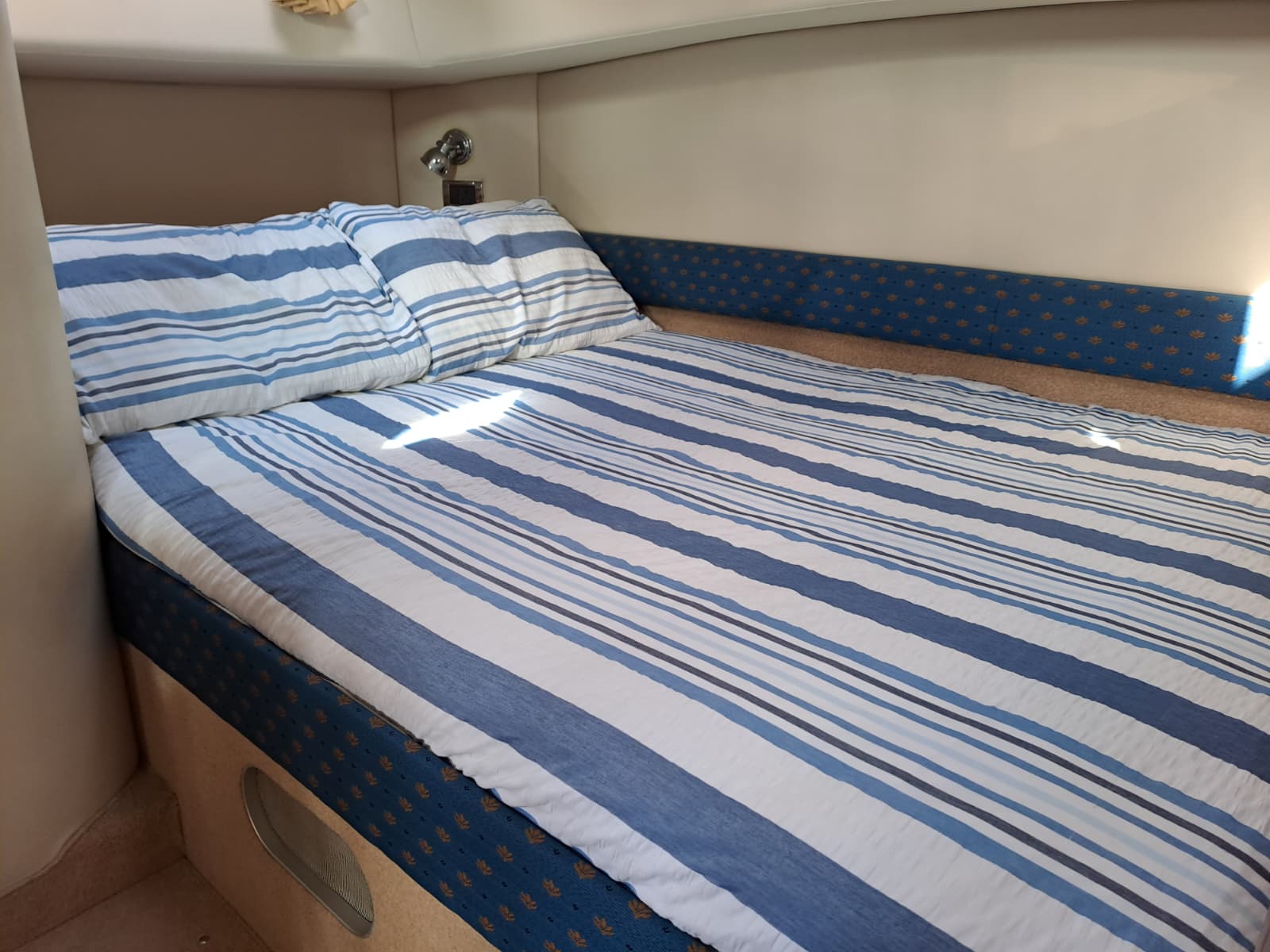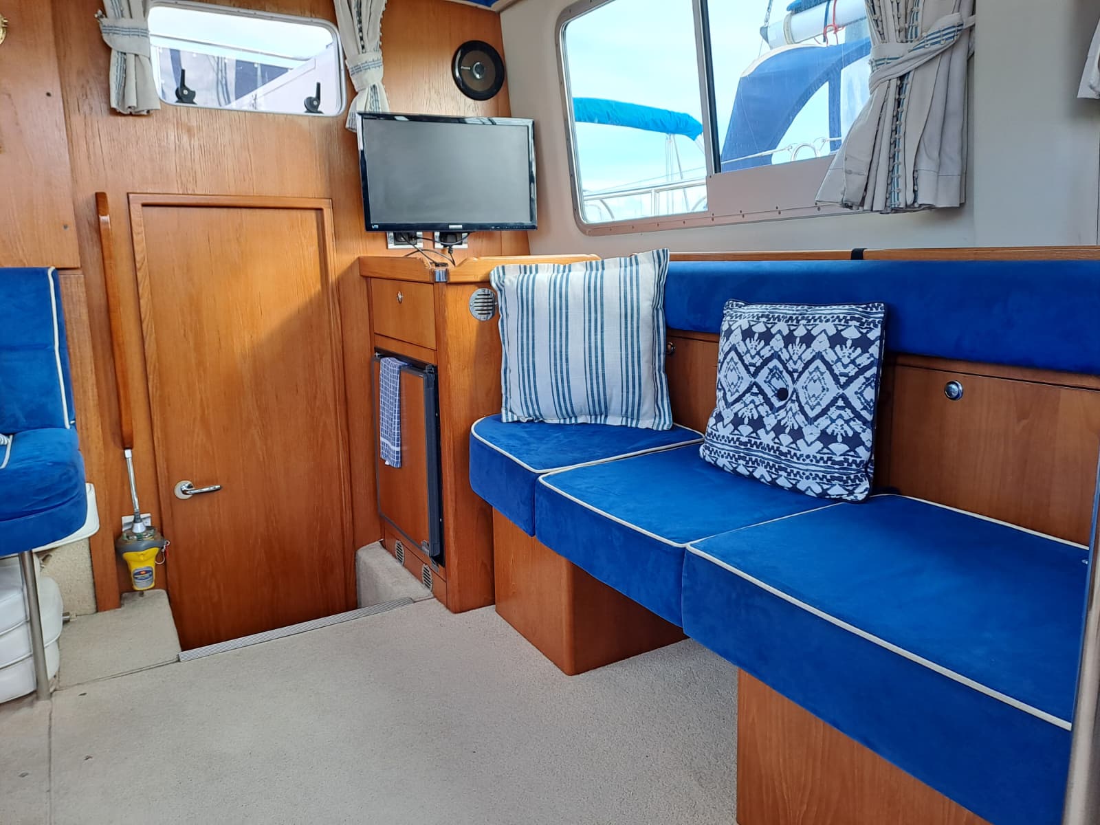 'Jalina' is fitted out with comfortable accommodation across two cabins and a saloon conversion, a guest cabin located forward with a V berth that converts to a double and the full beam owners cabin aft equipped with ample storage and a private en-suite, a suitable arrangement for prolonged time spent onboard.