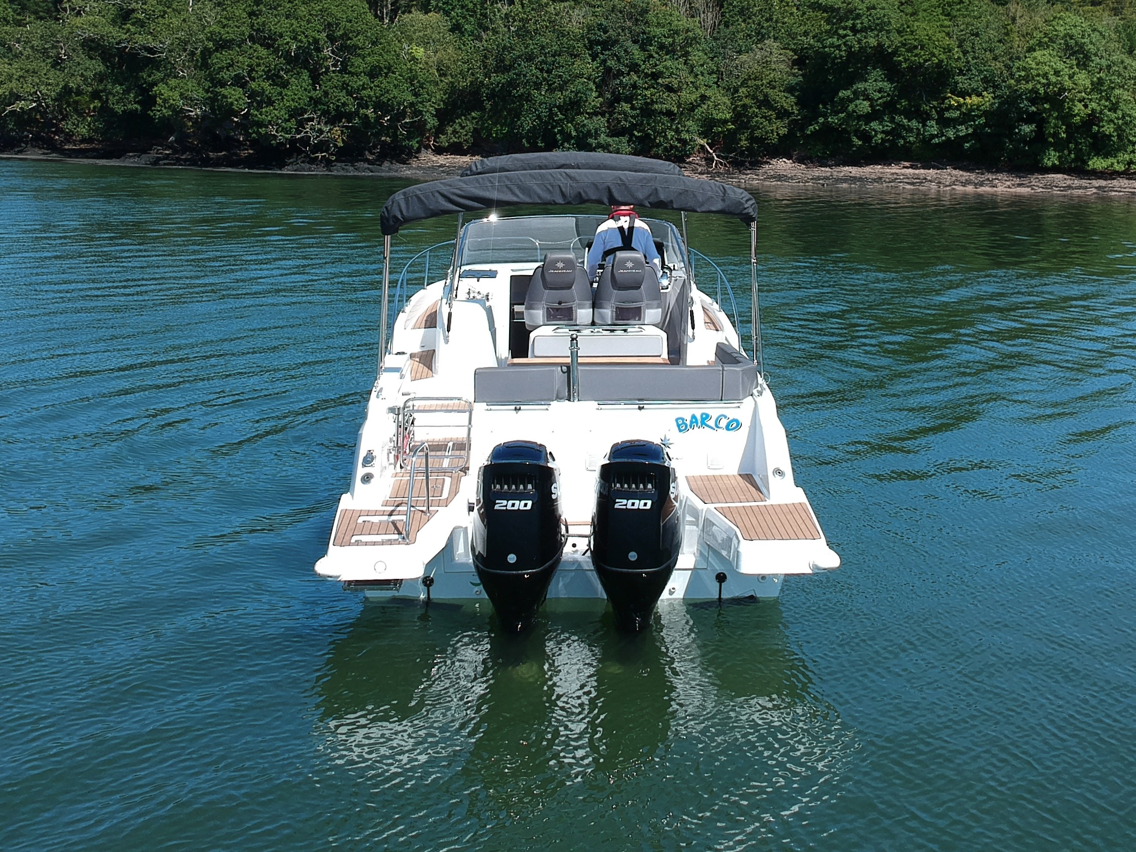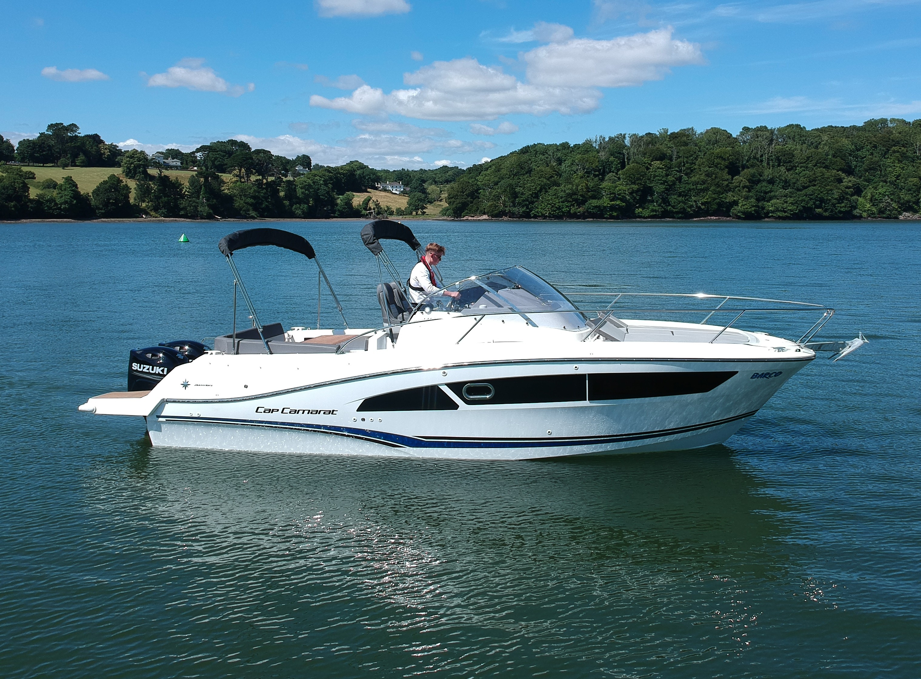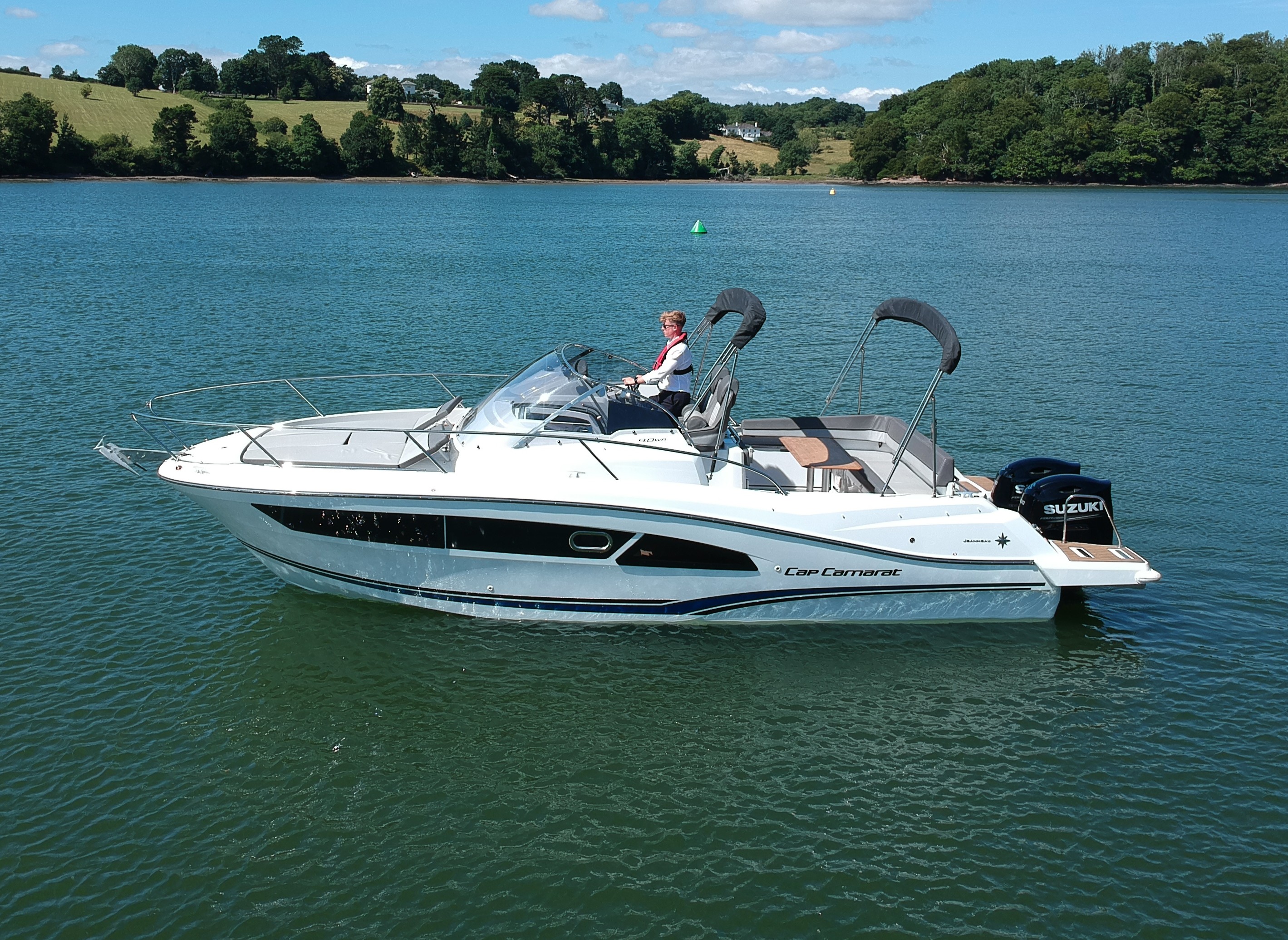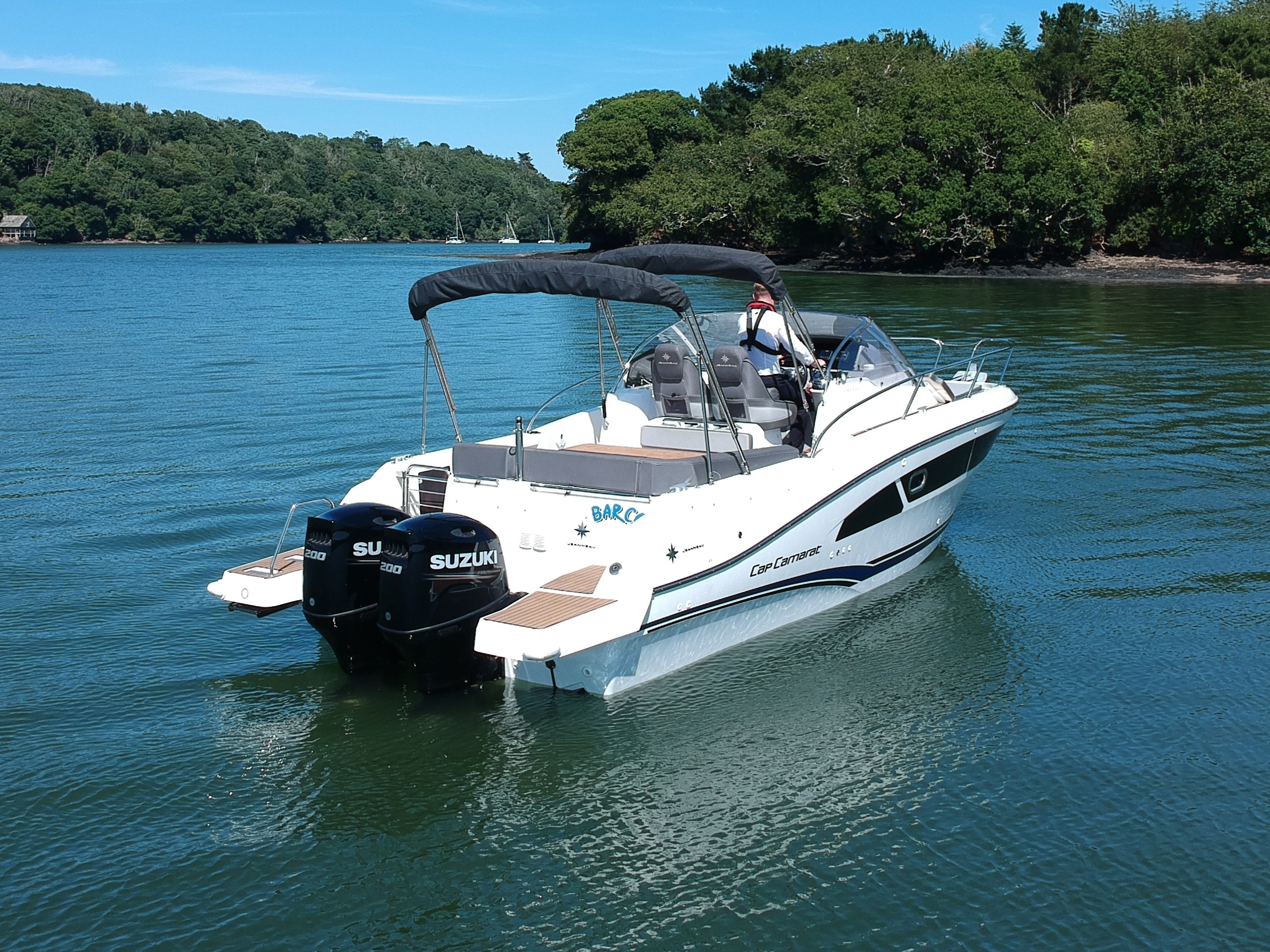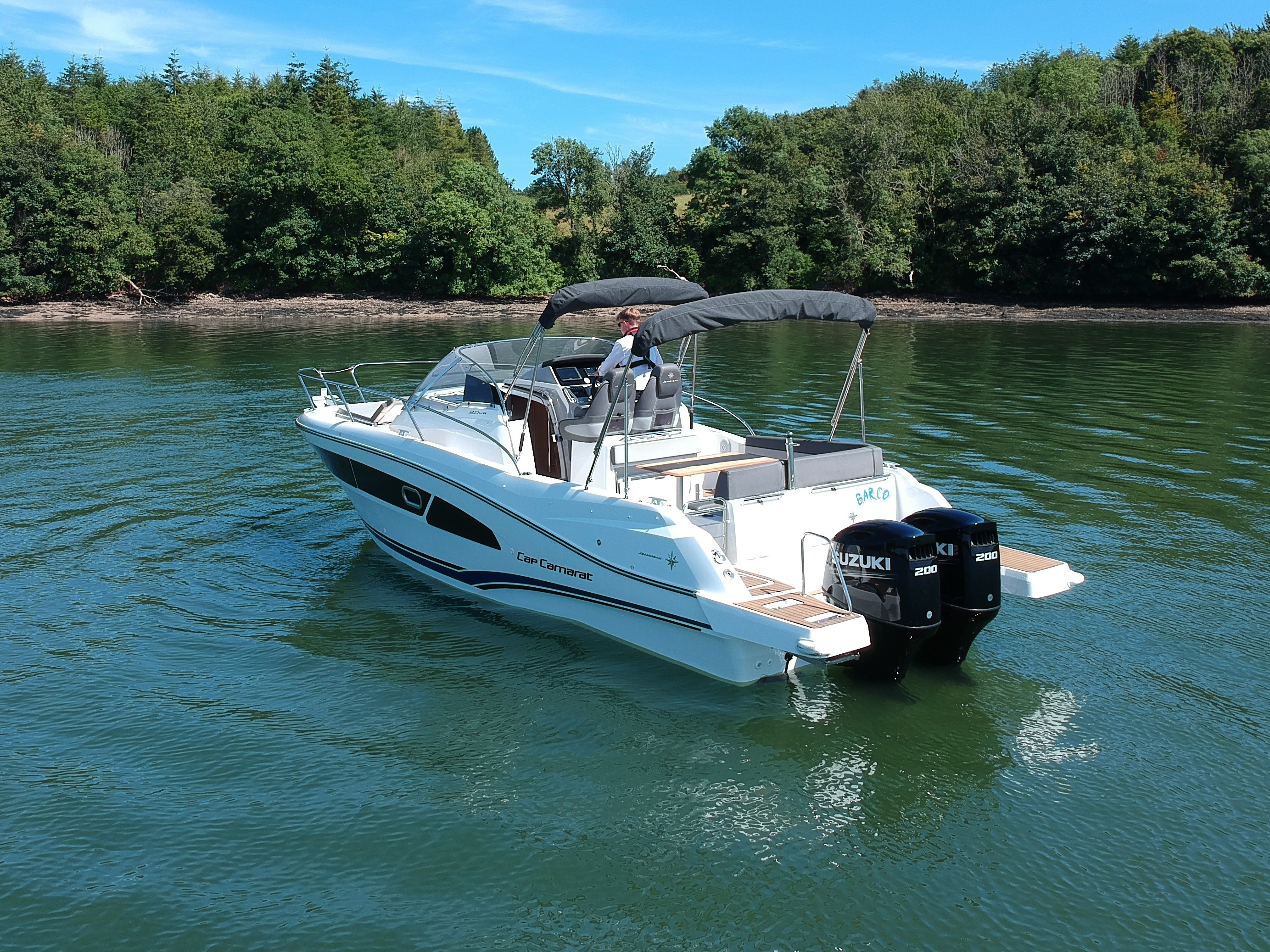 The Cap Camarat range from Jeanneau are excellent everyday cruisers with great performance, safety and fun paramount in their design. The 9.0 is the flagship model, offering unrivalled comfort and contemporary style, the large cockpit area is well protected by the large wrap around windscreen with plenty of seating and raised helm position allowing all round views of the boat and environment. The interior sleeps four and includes a galley and heads. 'Barco' is powered by twin Suzuki 200HP outboards and the bow thruster makes manoeuvres simple and controlled. The full cockpit or the two bimini options provide choice in keeping the weather out. This is a great boat for couples or families looking to extend their day trips with the convenience of overnighting when desired.