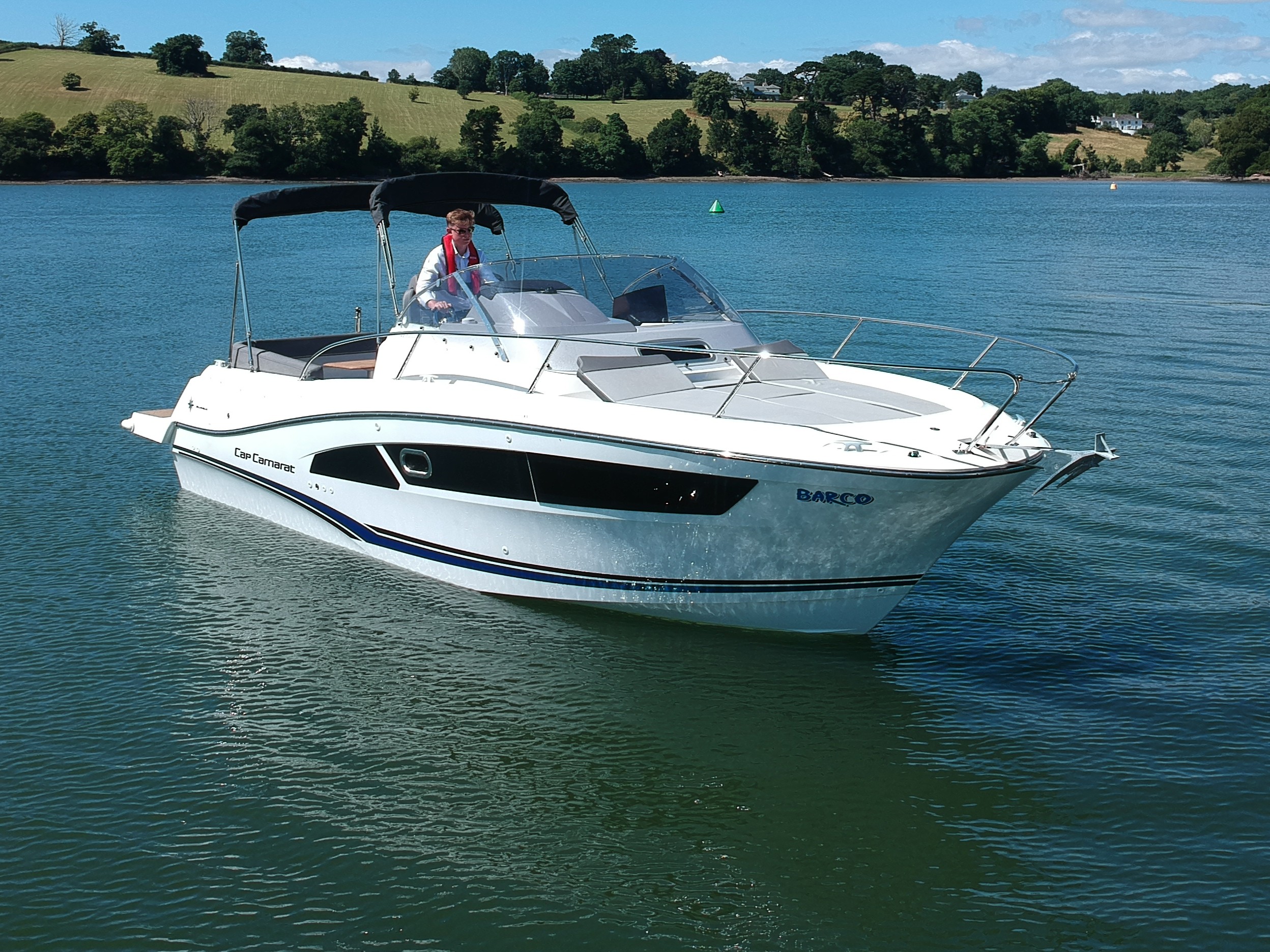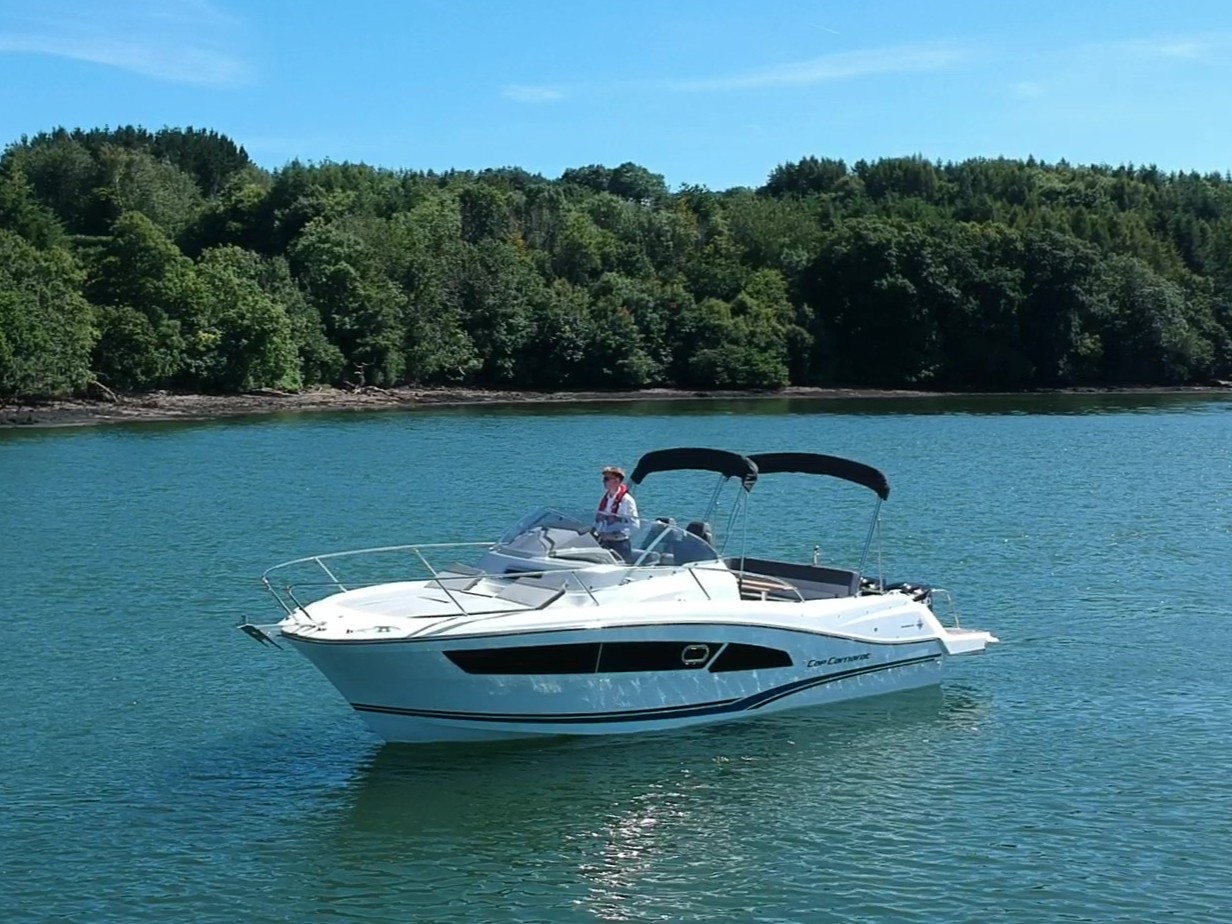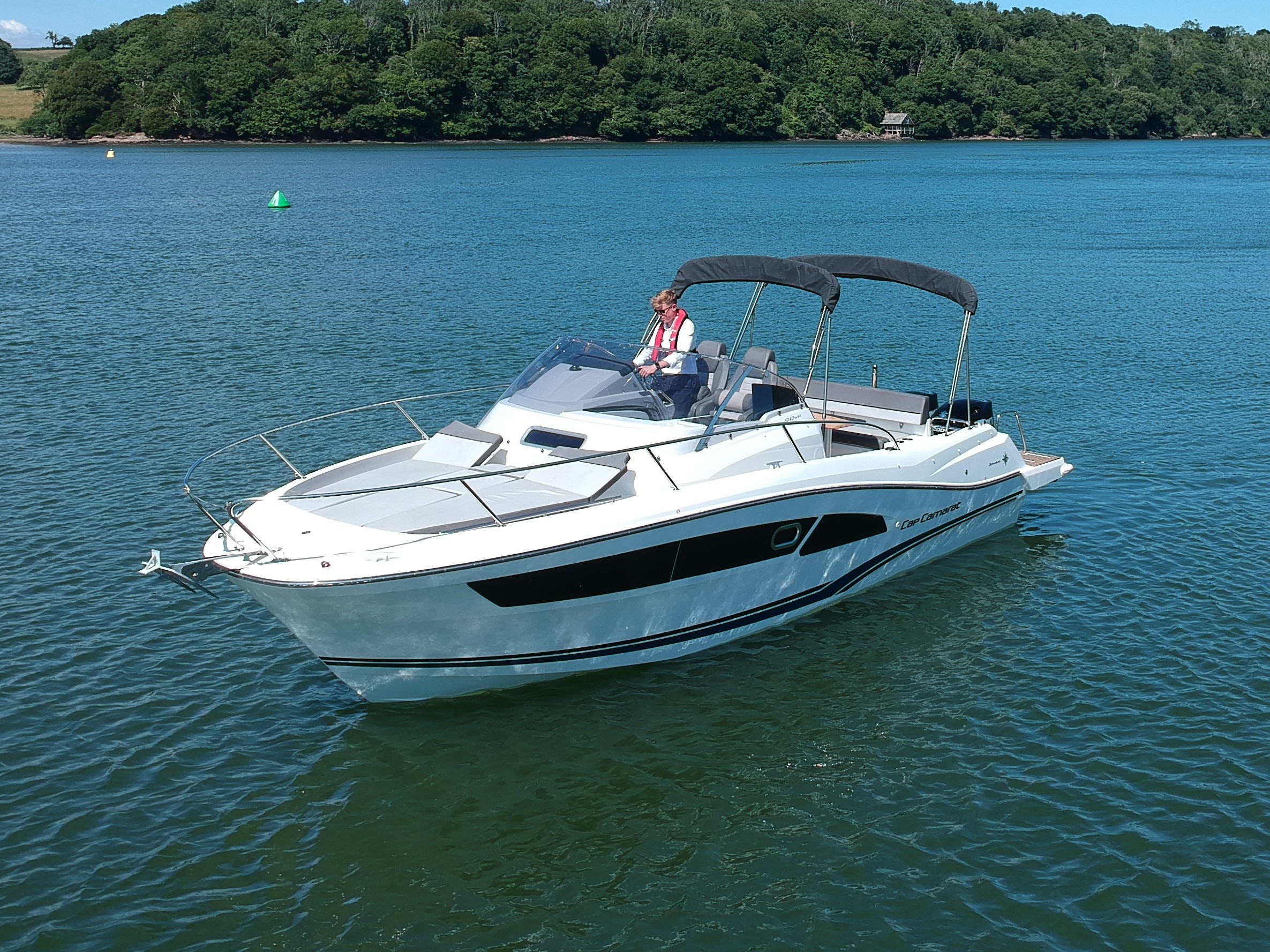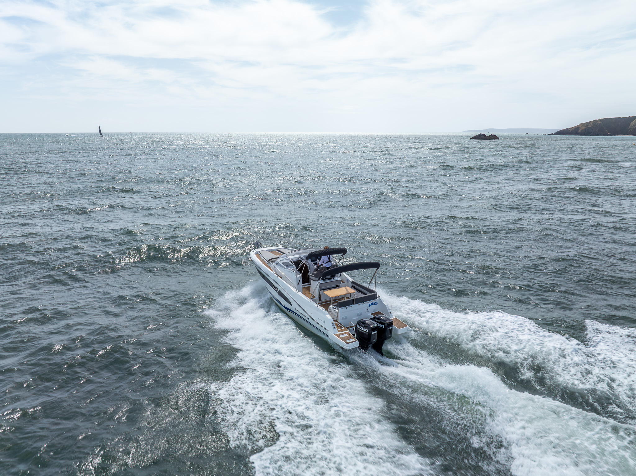 The Cap Camarat range from Jeanneau are excellent everyday cruisers with great performance, safety and fun paramount in their design. The 9.0 is the flagship model, offering unrivalled comfort and contemporary style, the large cockpit area is well protected by the large wrap around windscreen with plenty of seating and raised helm position allowing all round views of the boat and environment. The interior sleeps four and includes a galley and heads. 'Barco' is powered by twin Suzuki 200HP outboards and the bow thruster makes manoeuvres simple and controlled. The full cockpit or the two bimini options provide choice in keeping the weather out. This is a great boat for couples or families looking to extend their day trips with the convenience of overnighting when desired.