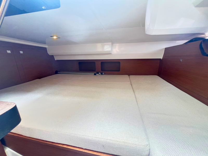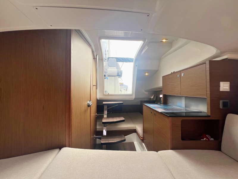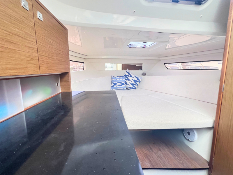 U shaped seating at the bow with a large table in the middle that can be lowered to create a double berth with infill cushions