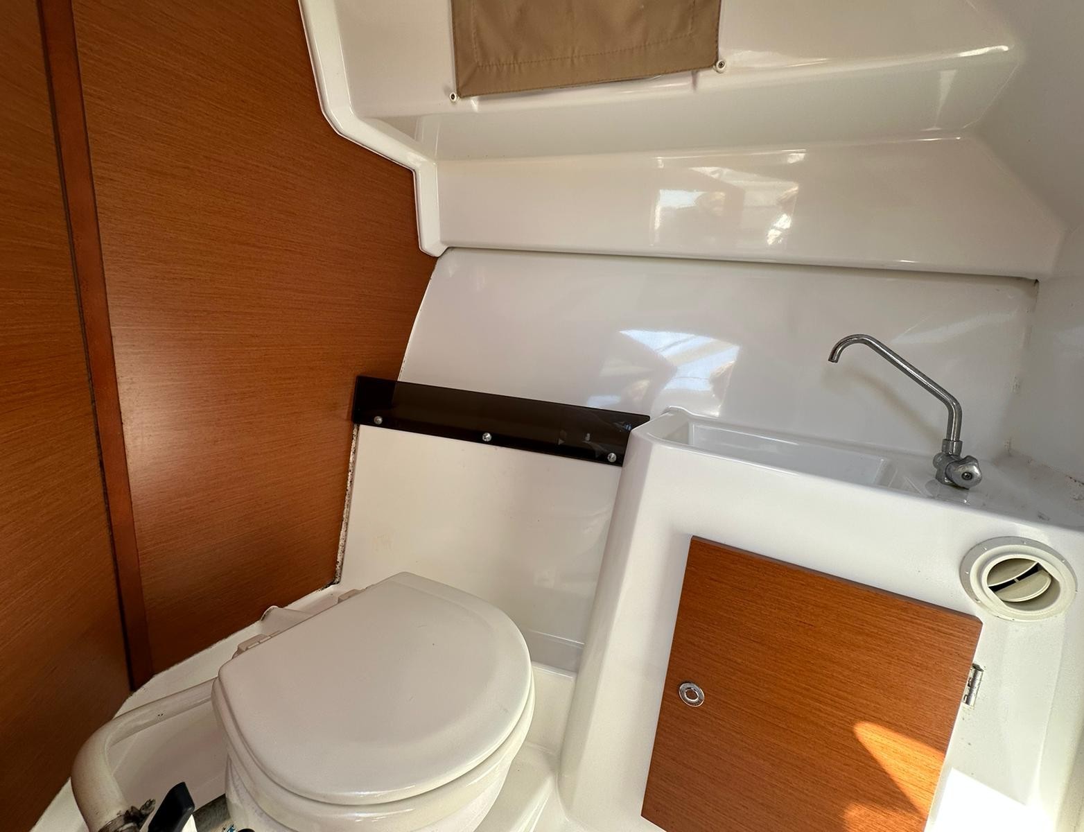 Heads under helm to starboard with manual sea toilet with holding tank, sink with cold water and storage cupboard beneath