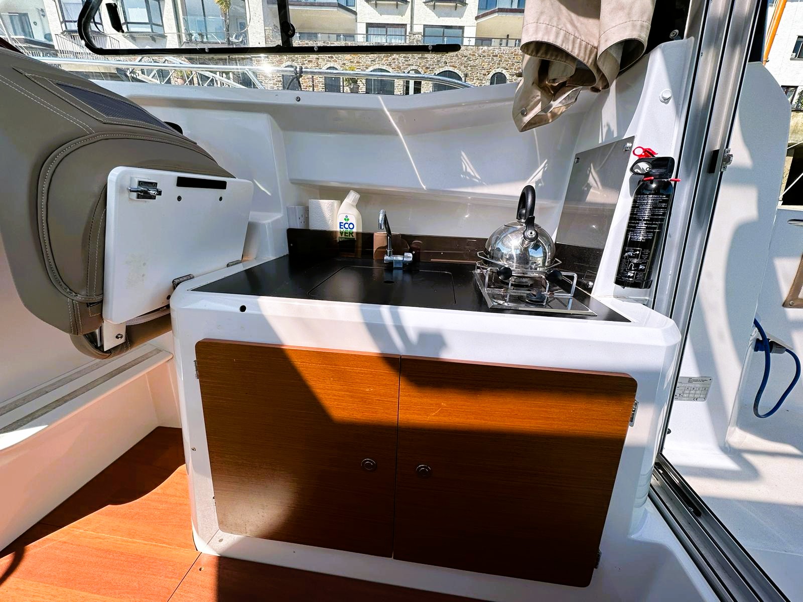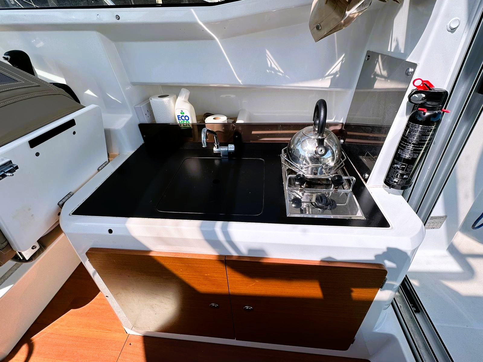 Galley behind helm, fitted with sink, cold water tap, single gas burner