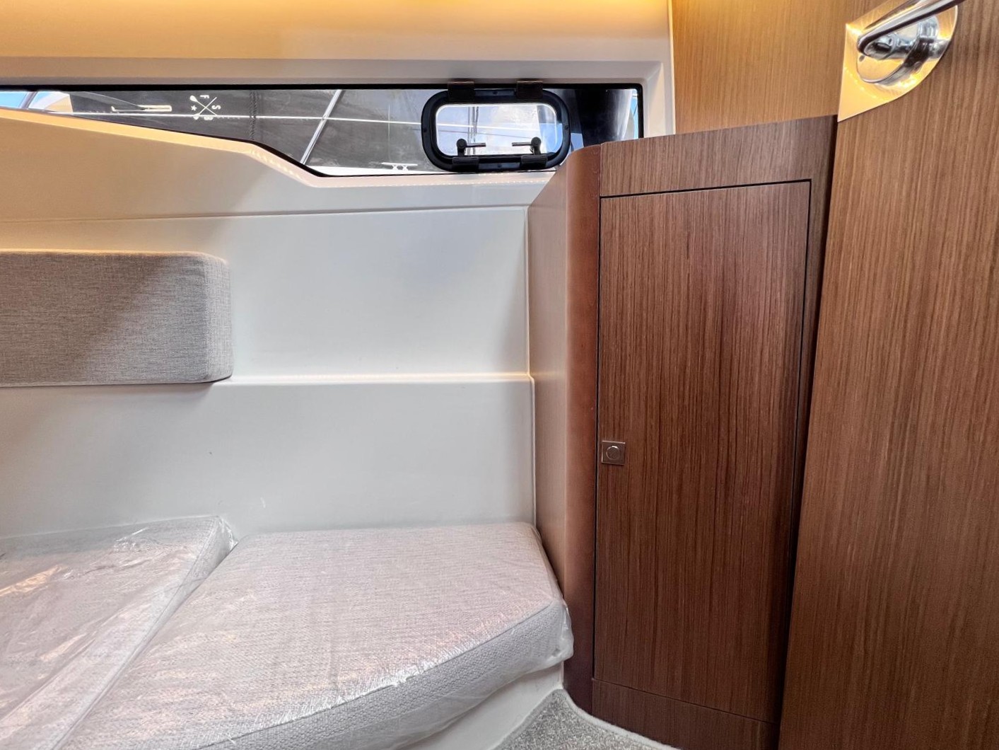 Guest cabin to port with large double berth (still in plastic wrappers) and storage