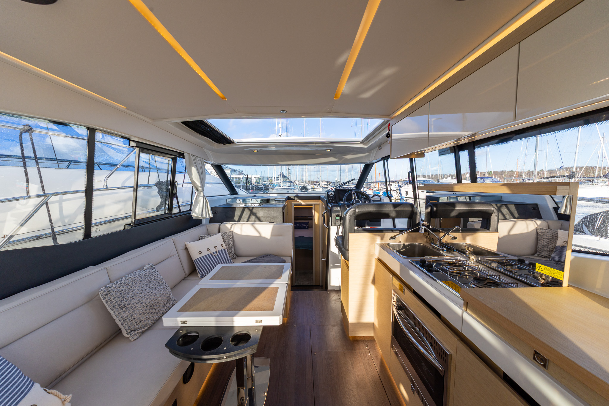 The interior joinery of white oak is also an upgrade from standard plus with the optional electric sliding sun roof, the saloon is a wonderfully light and airy place to be.