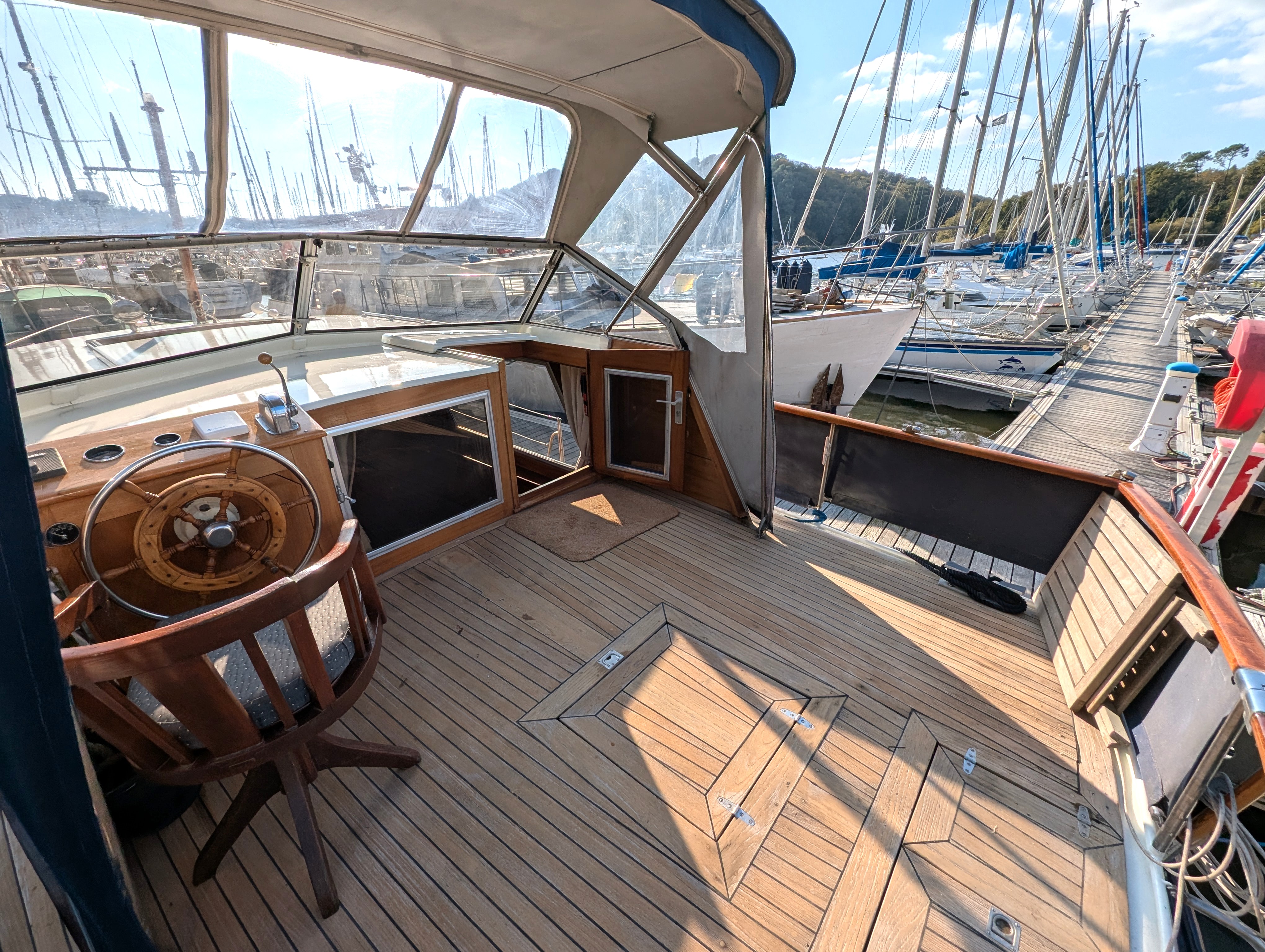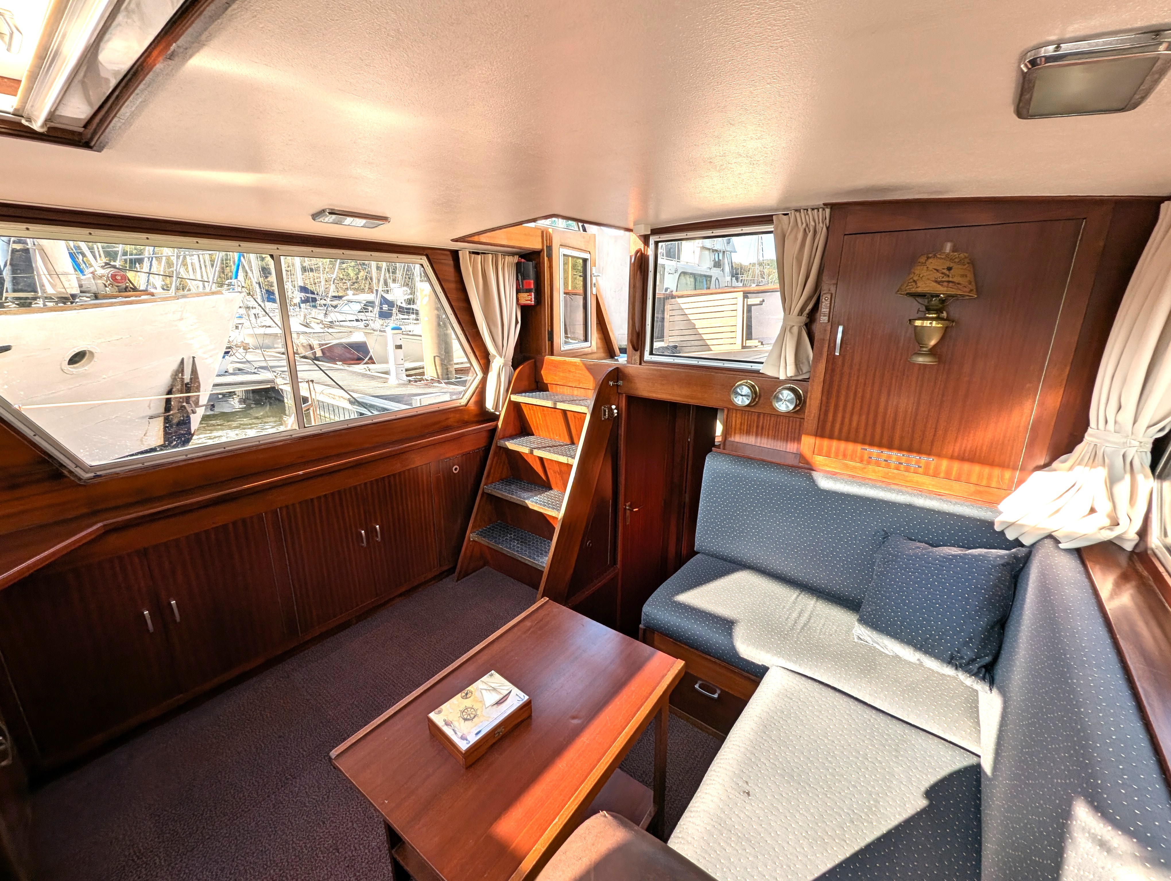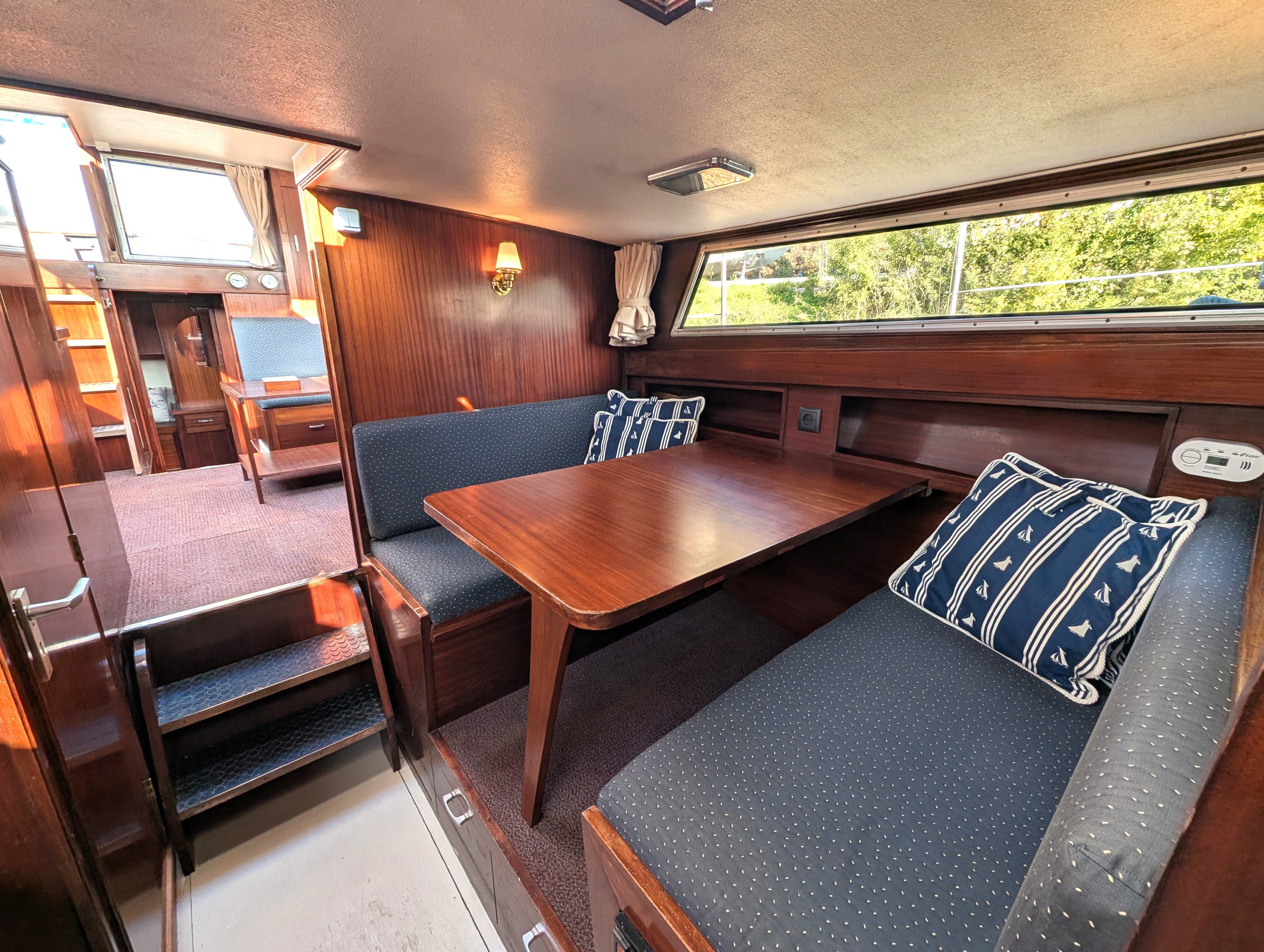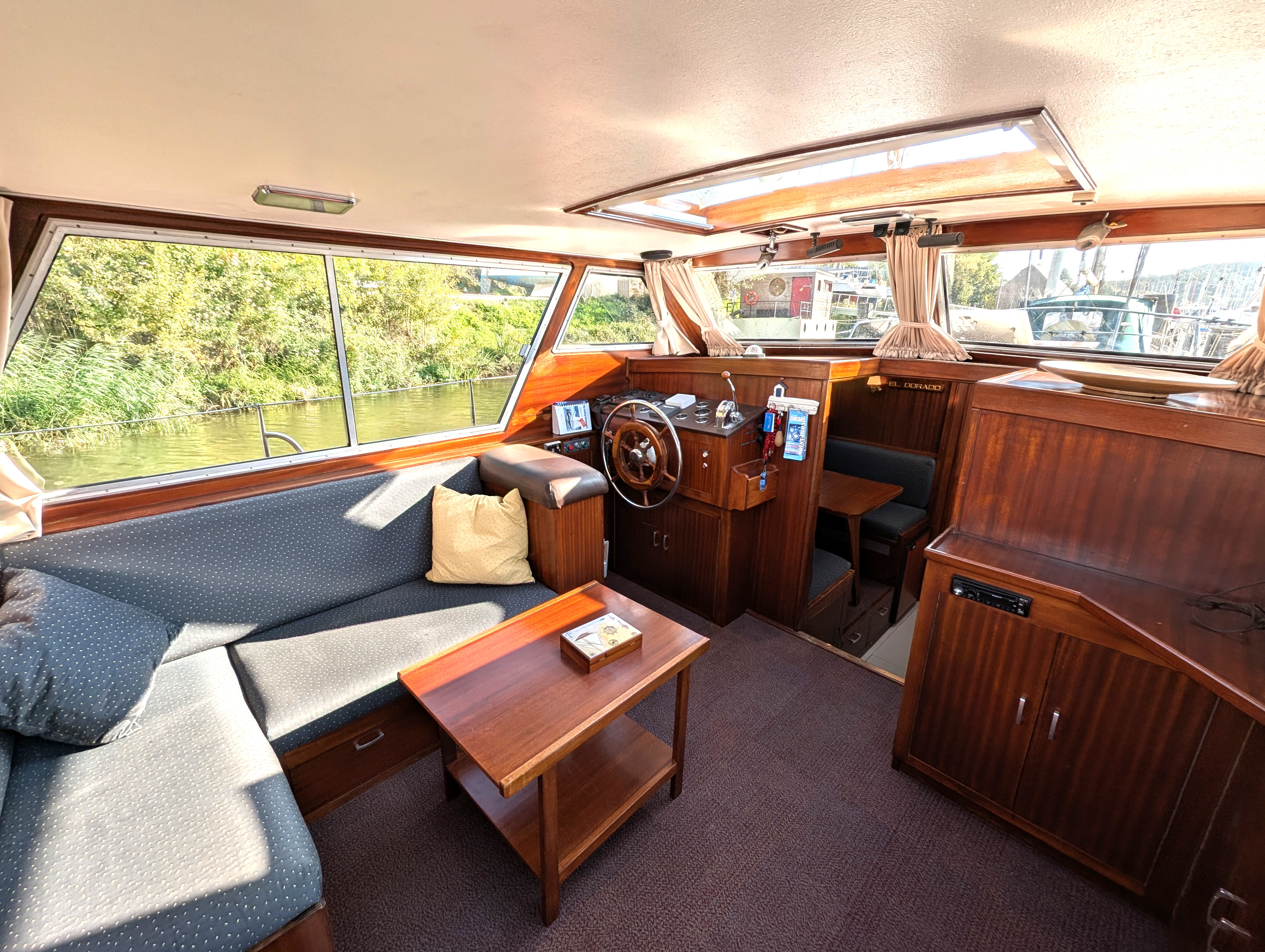 Nicely finished solid teak interior, saloon with steering position and L-shaped settee,. Steps to dinette which converts to double berth, v cabin forward with twin berth, Large owners cabin aft with double bed and lots of storage. WC aft and shower room forward.