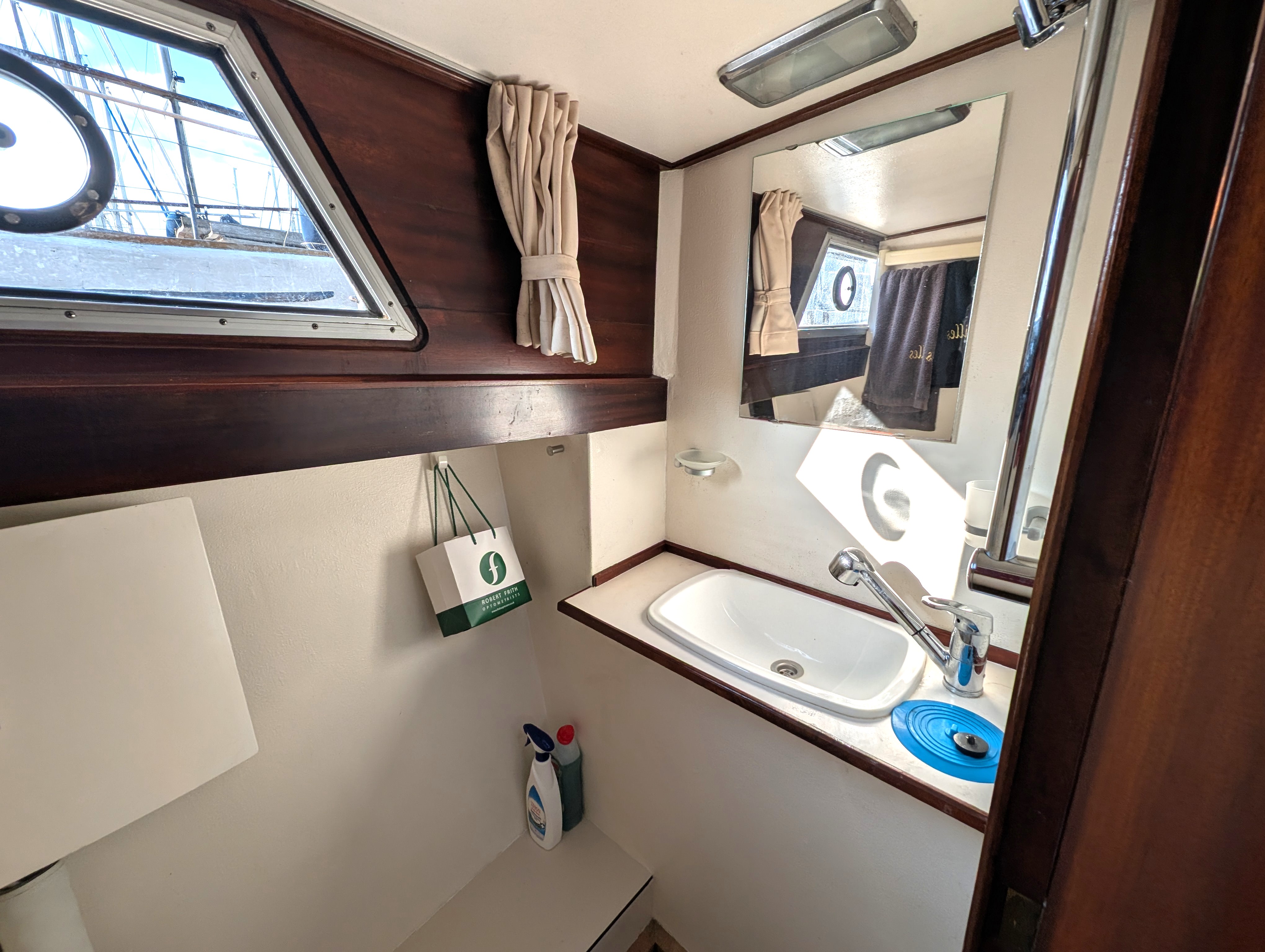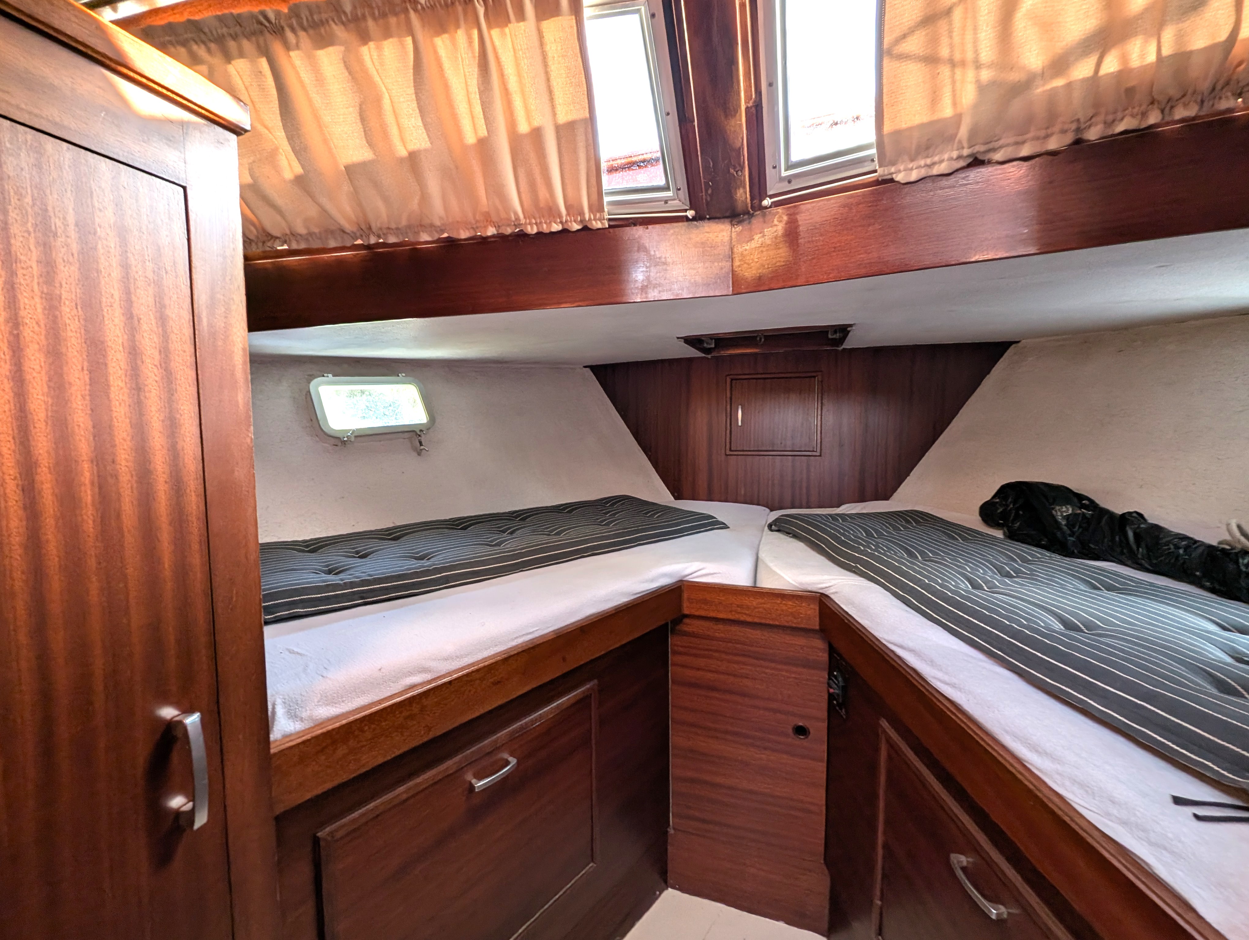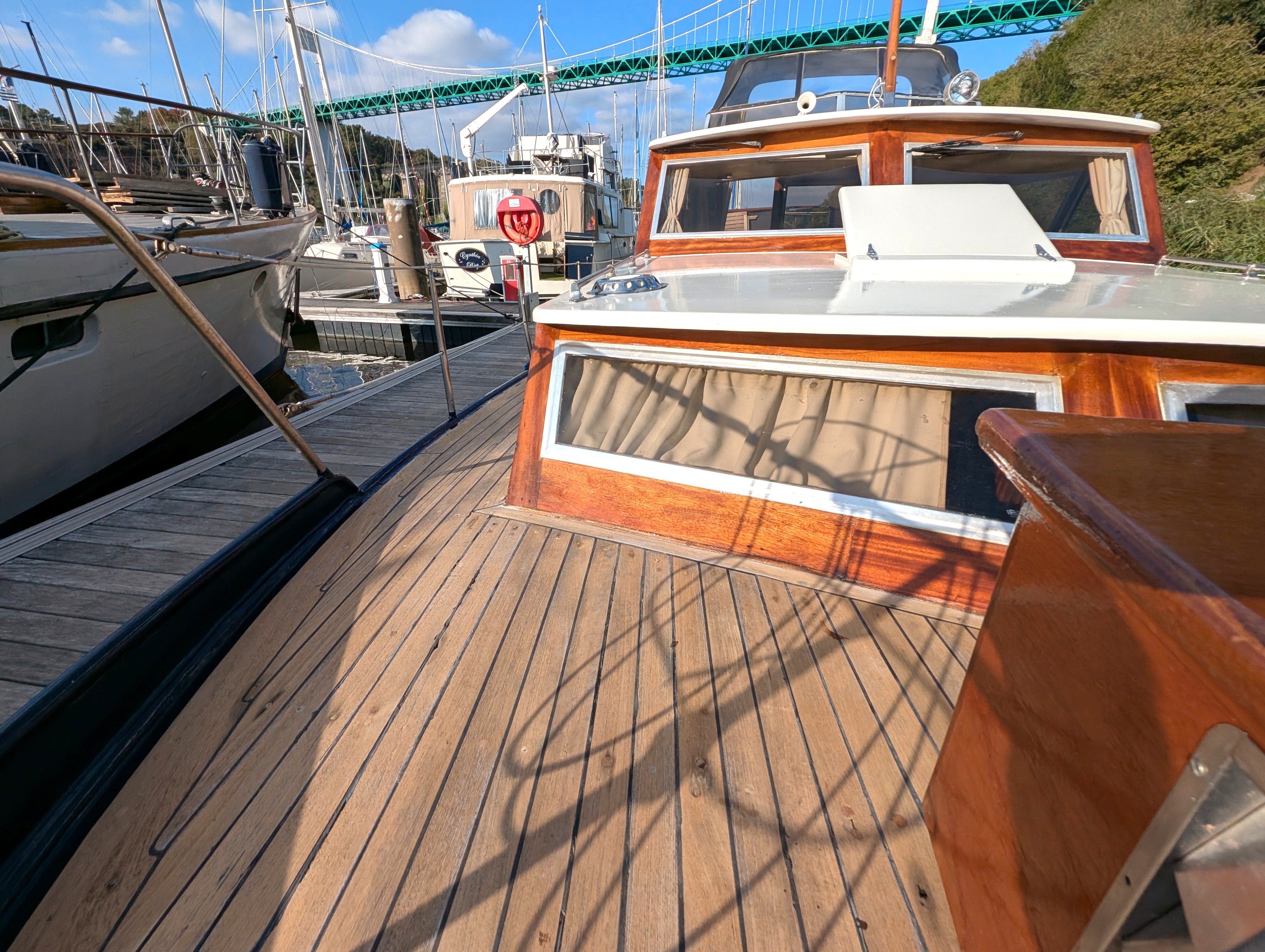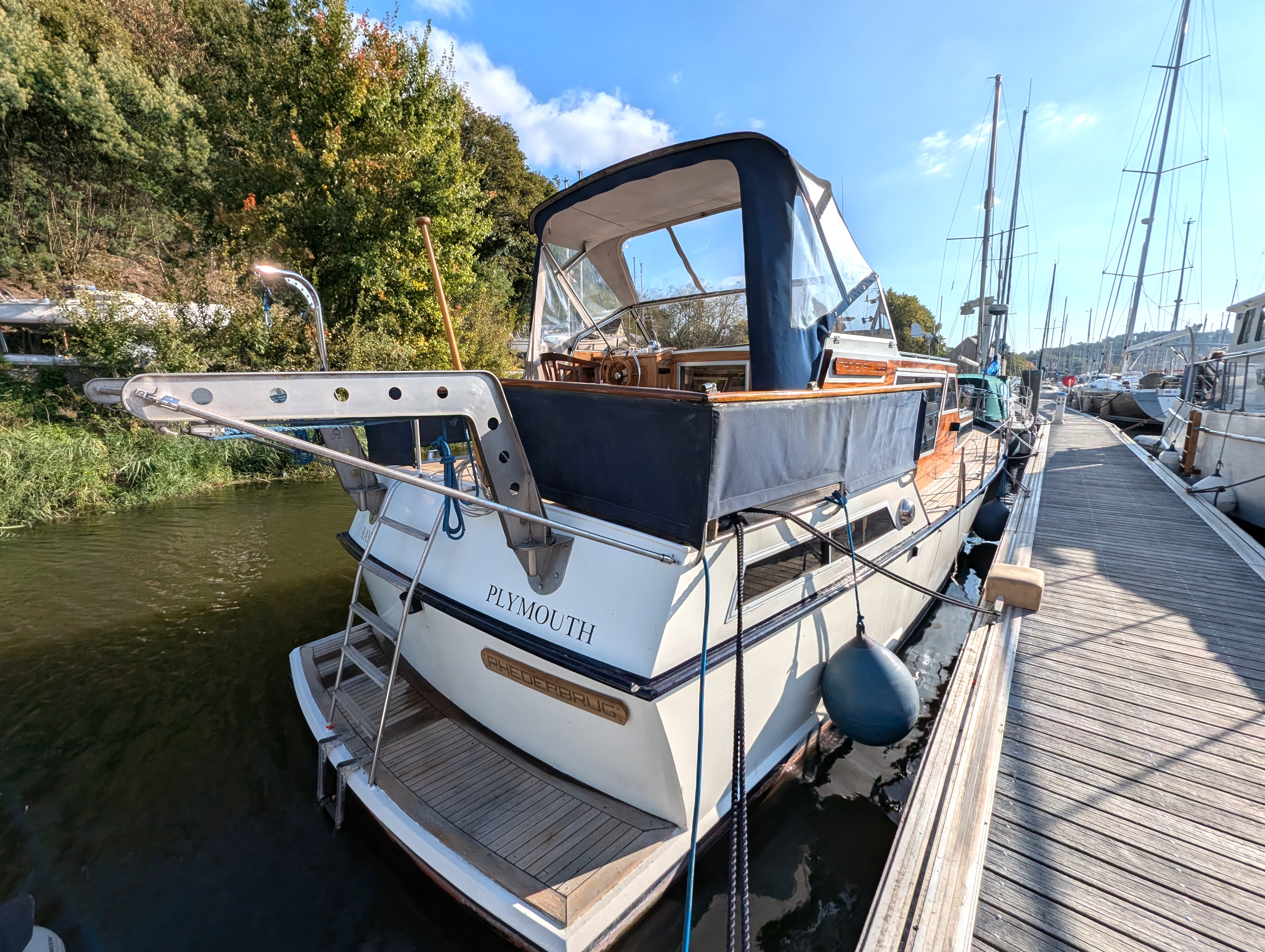 Nicely finished solid teak interior, saloon with steering position and L-shaped settee,. Steps to dinette which converts to double berth, v cabin forward with twin berth, Large owners cabin aft with double bed and lots of storage. WC aft and shower room forward.
