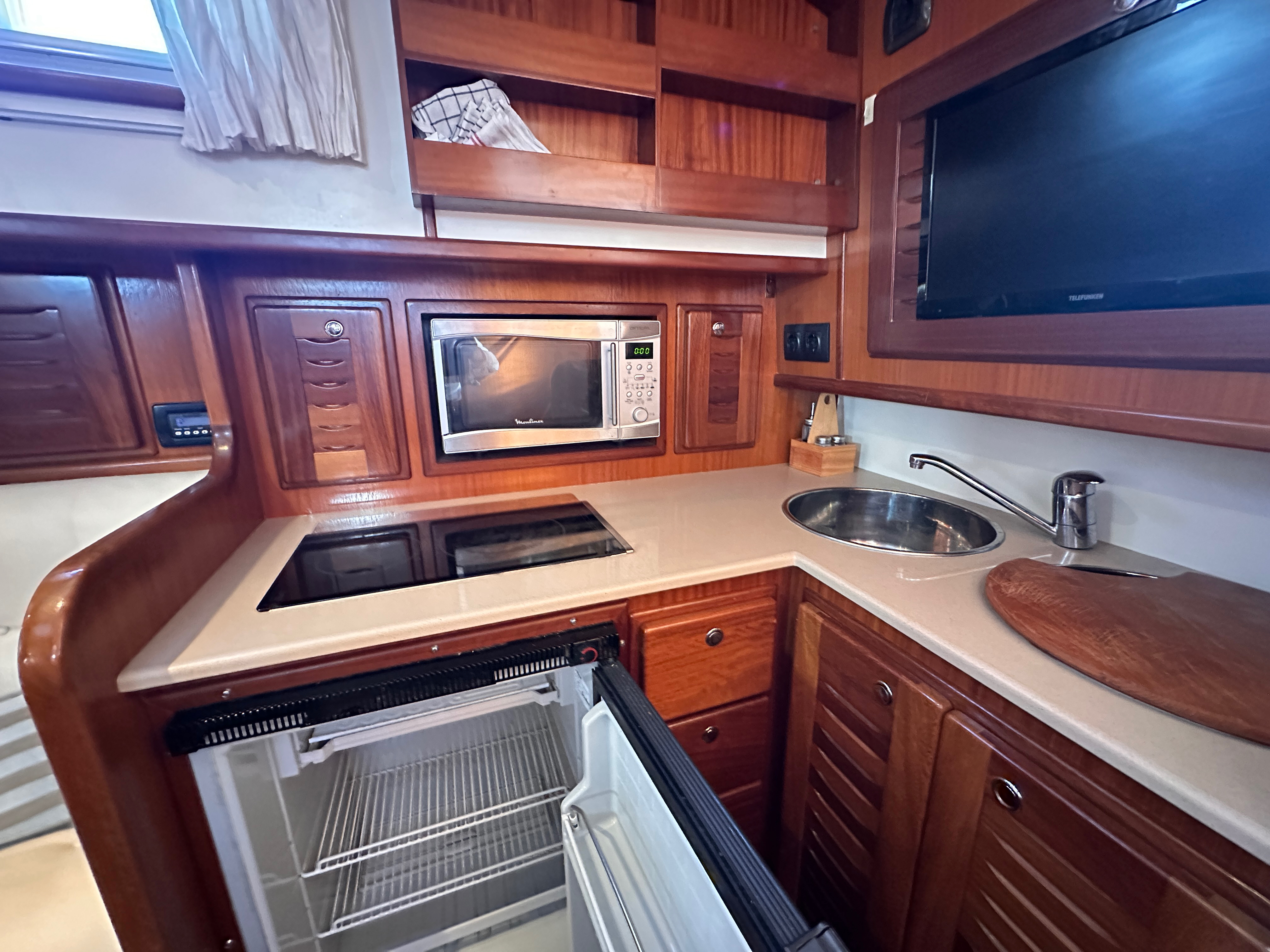 El Menorquin 120 es un crucero de semidesplazamiento potente, cómodo y seguro. Muy bien equipado con pasarela hidráulica, generador y aire acondicionado.