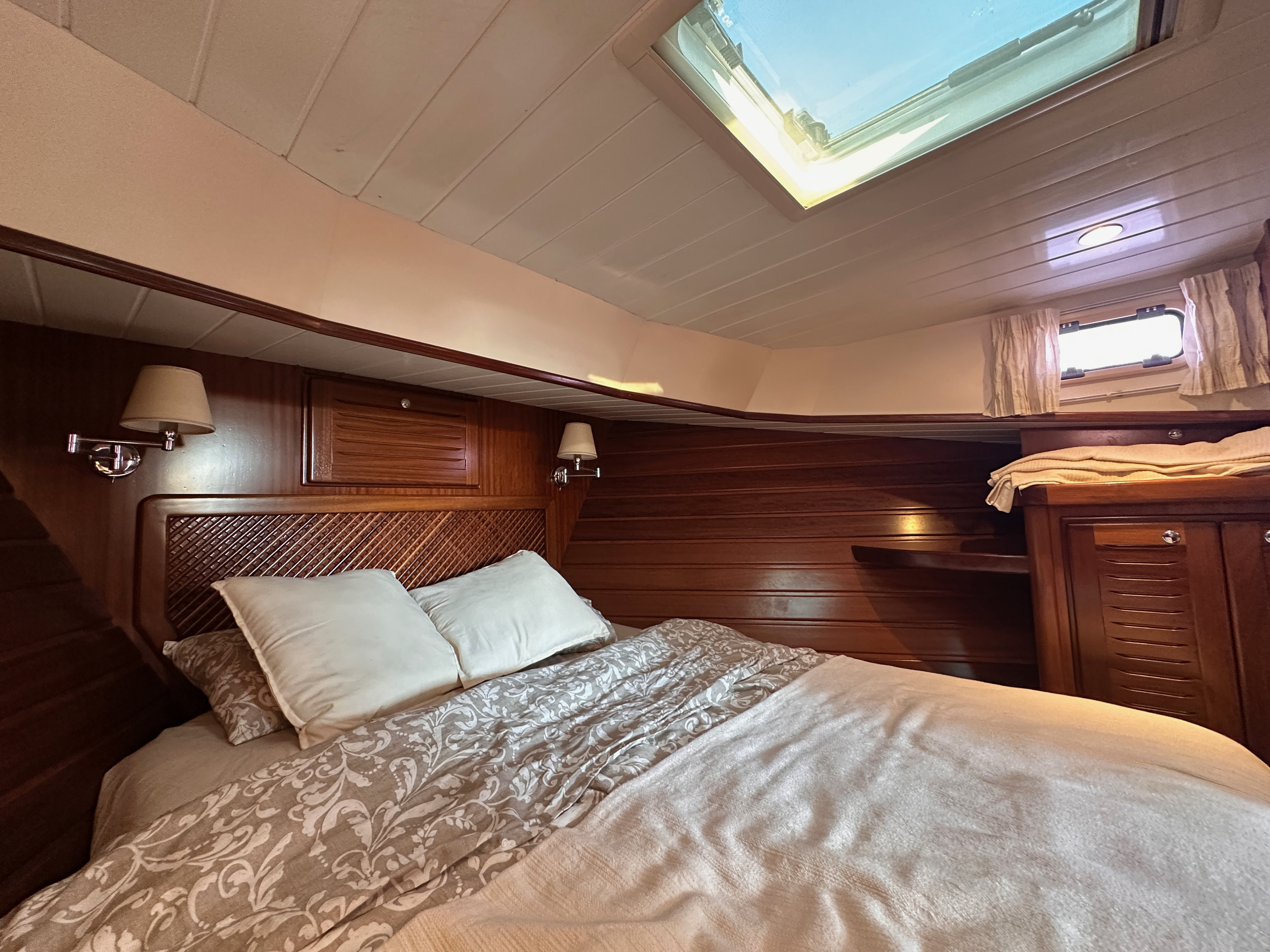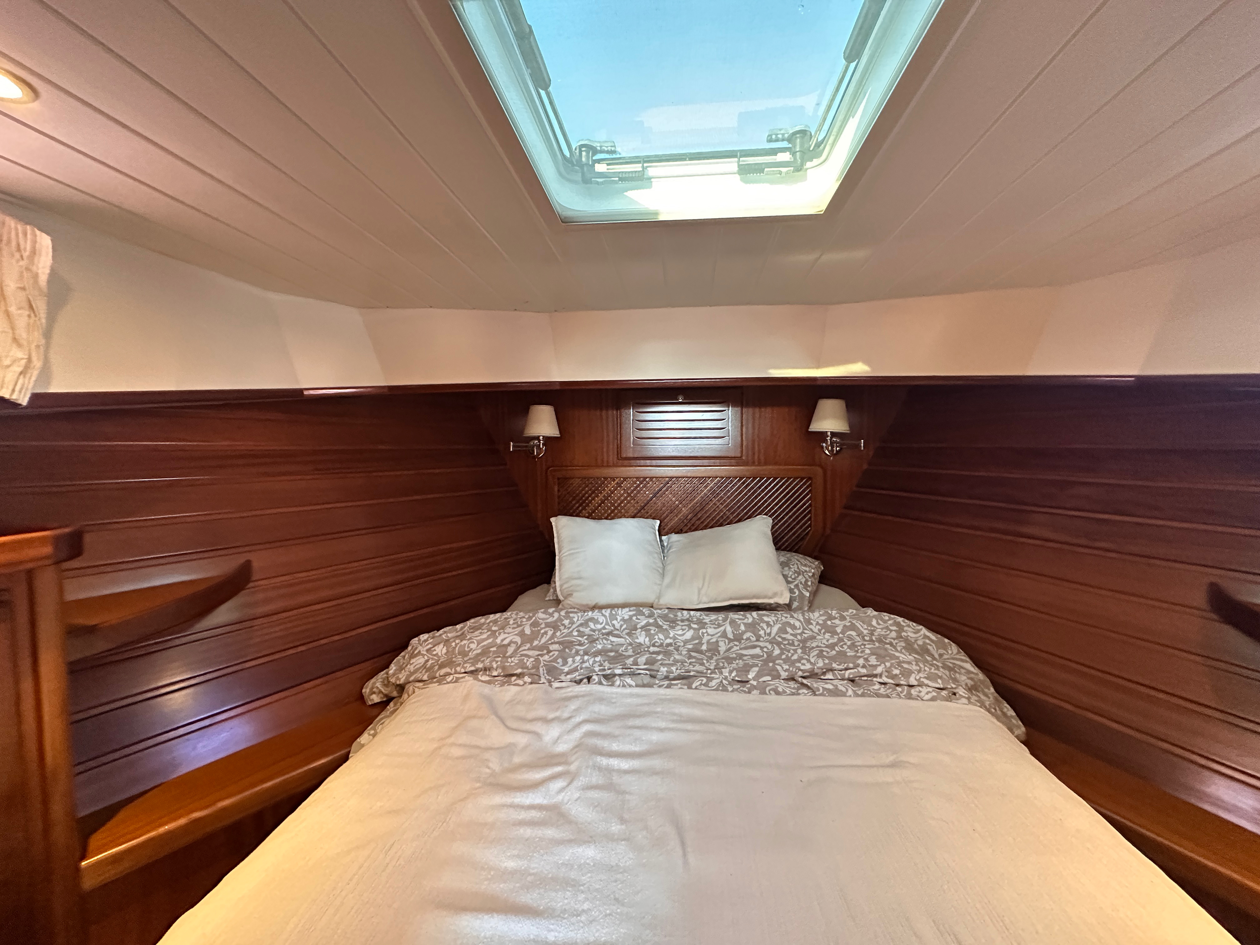 FORWARD CABIN - Master cabin with double berth ( storage below ) with reading lamps, 220v sockets, two wardrobes, access to anchor locker .