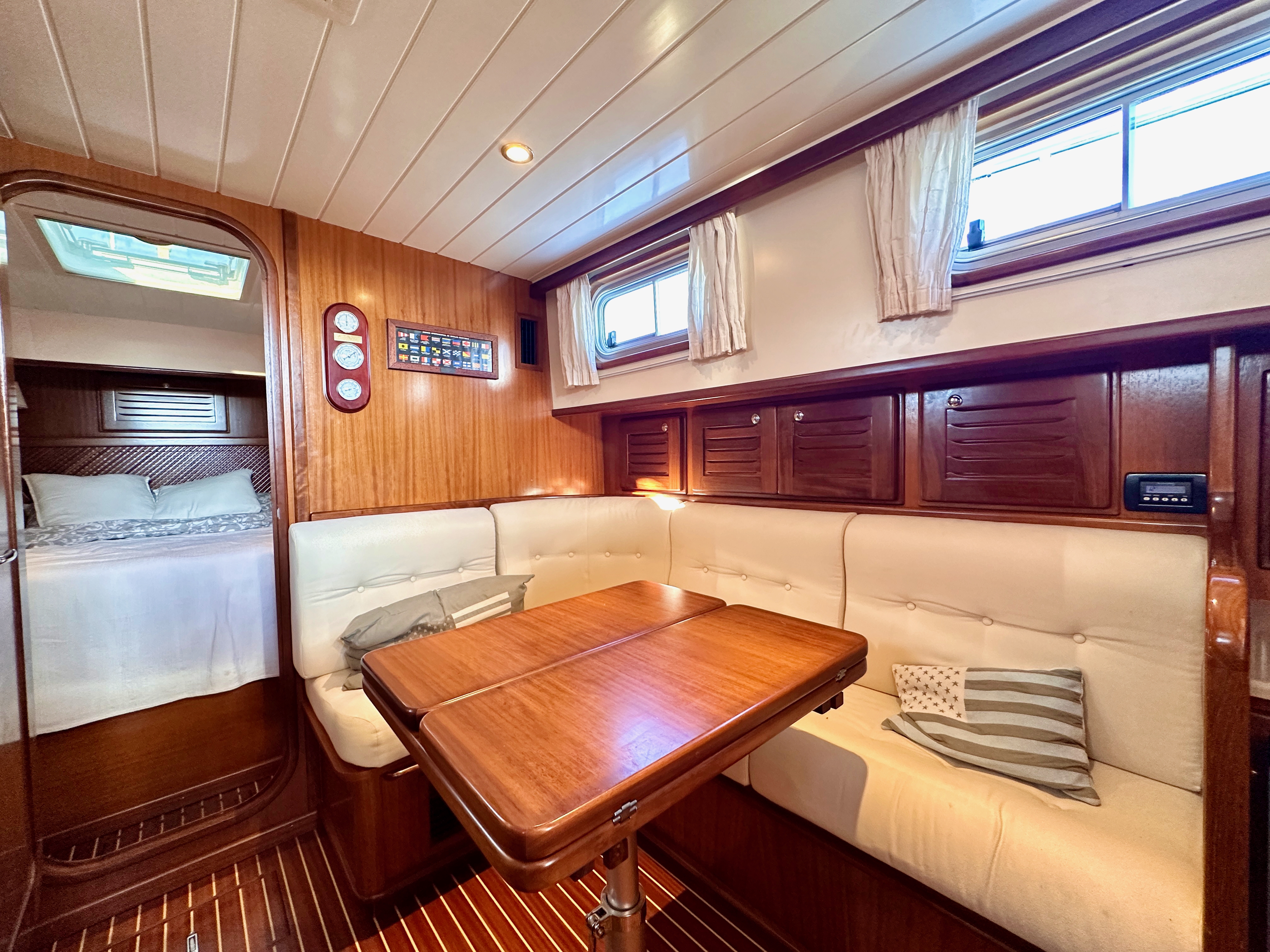 SALOON - L-shaped sofa with table, ( convertible into bed ) portholes to open, storage lockers, CD/DVD/MP3.