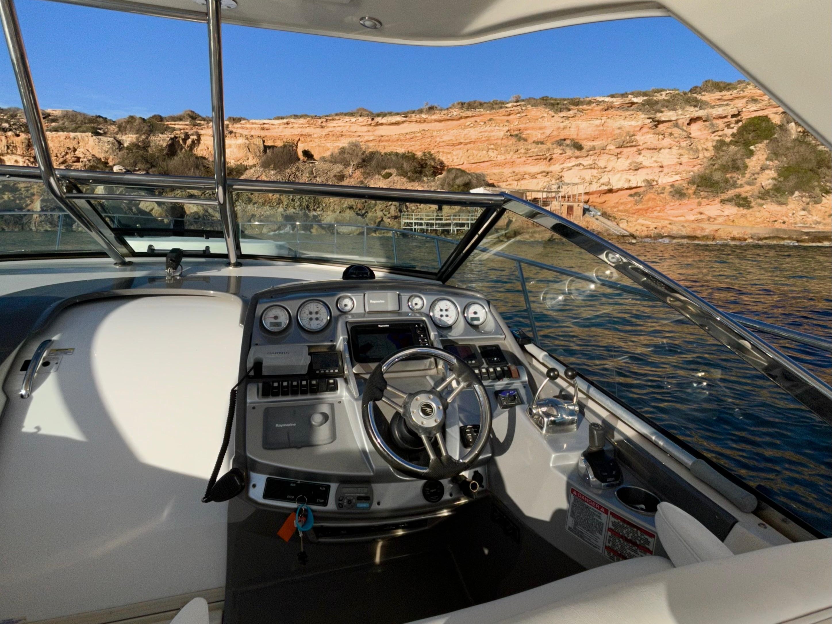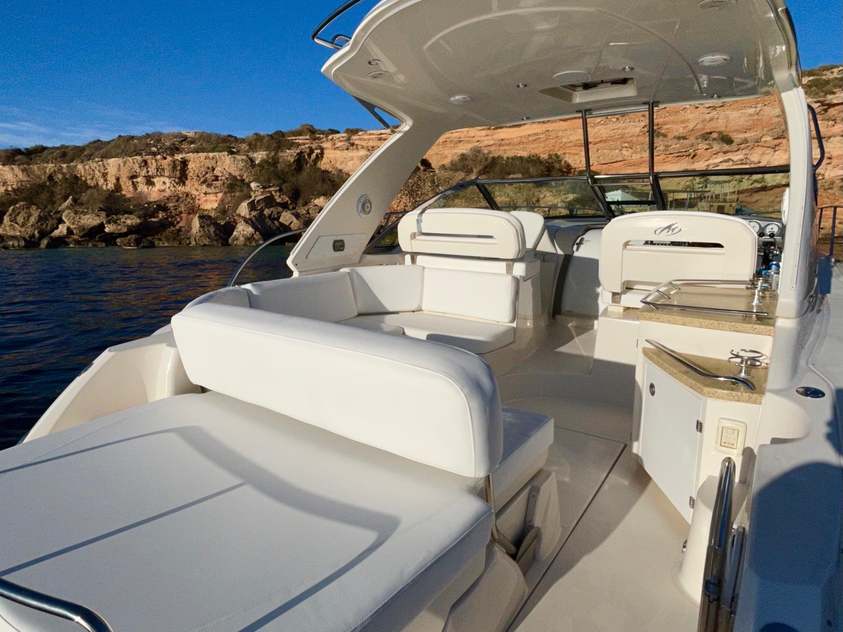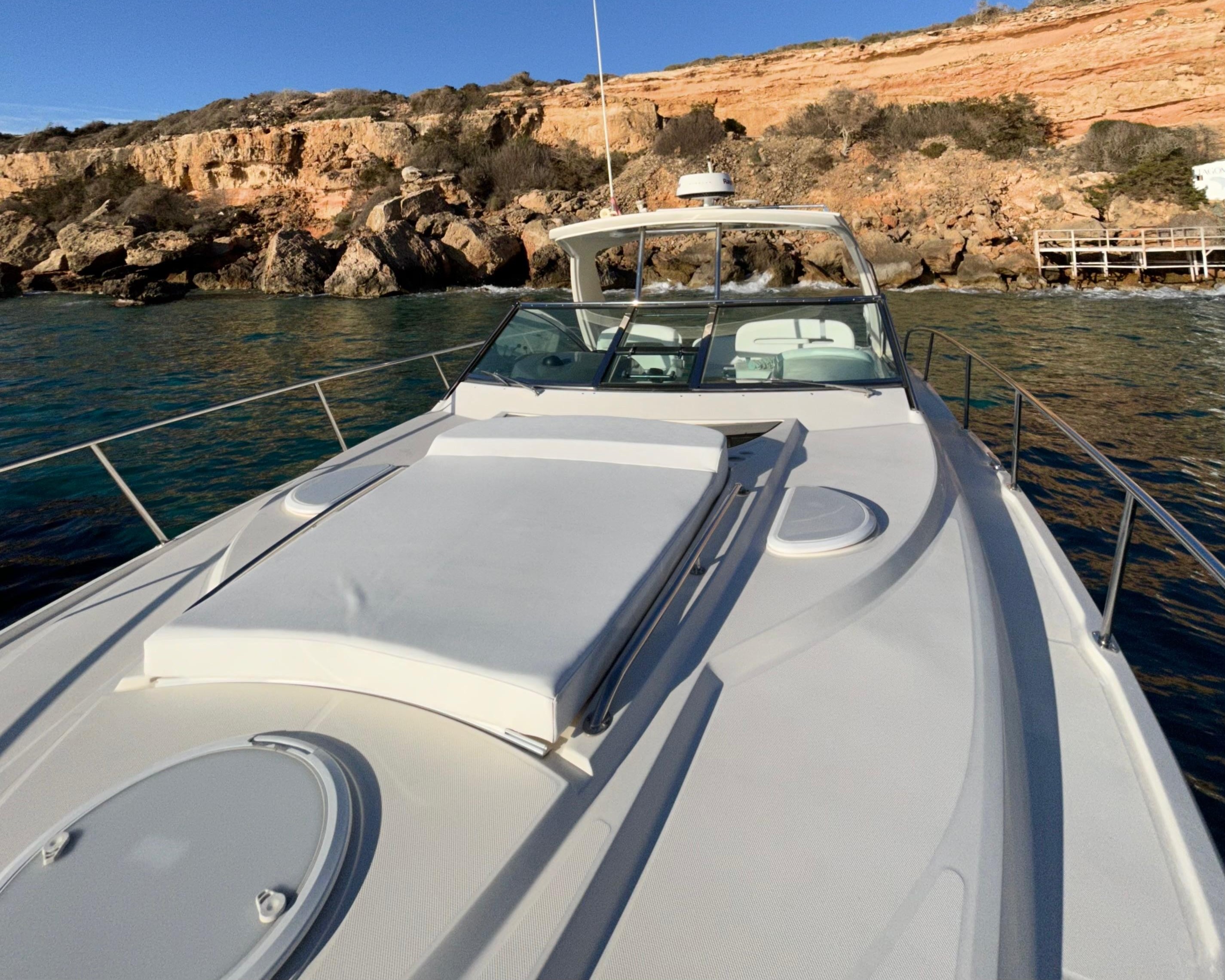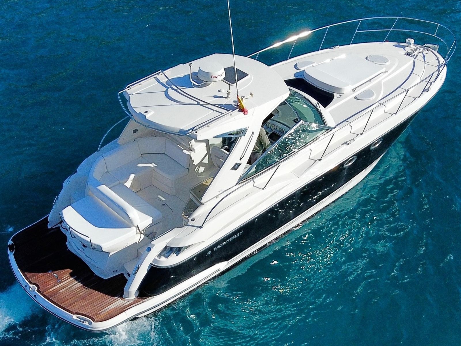 Monterey 415 Sport with sleek design, twin Volvo Penta D6 IPS engines, and bow thruster. Spacious cockpit and foredeck, two cabins below. Excellent condition, minor upgrades possible. Comes with transferable Ibiza mooring.