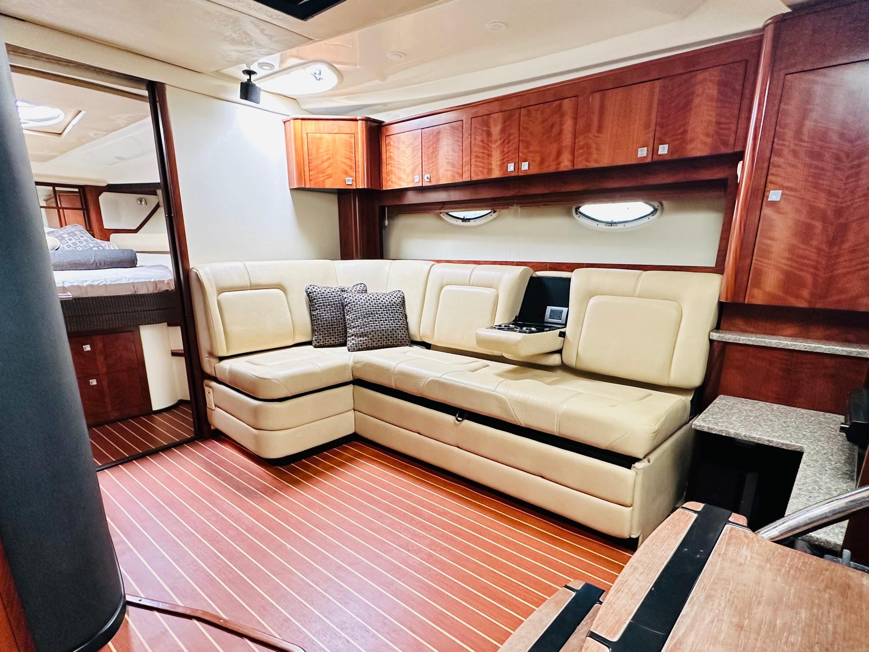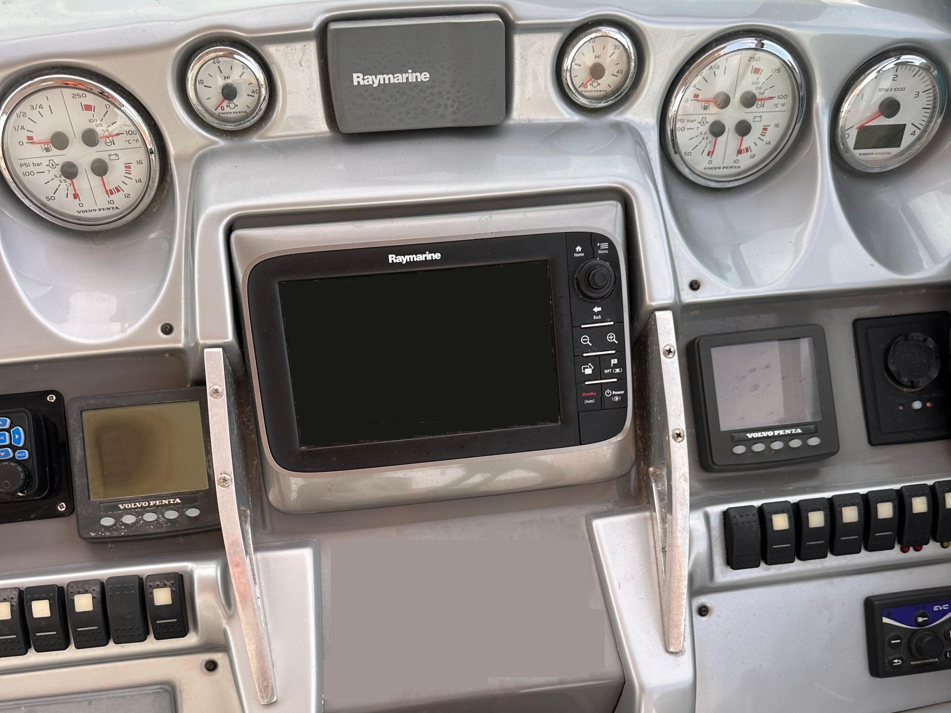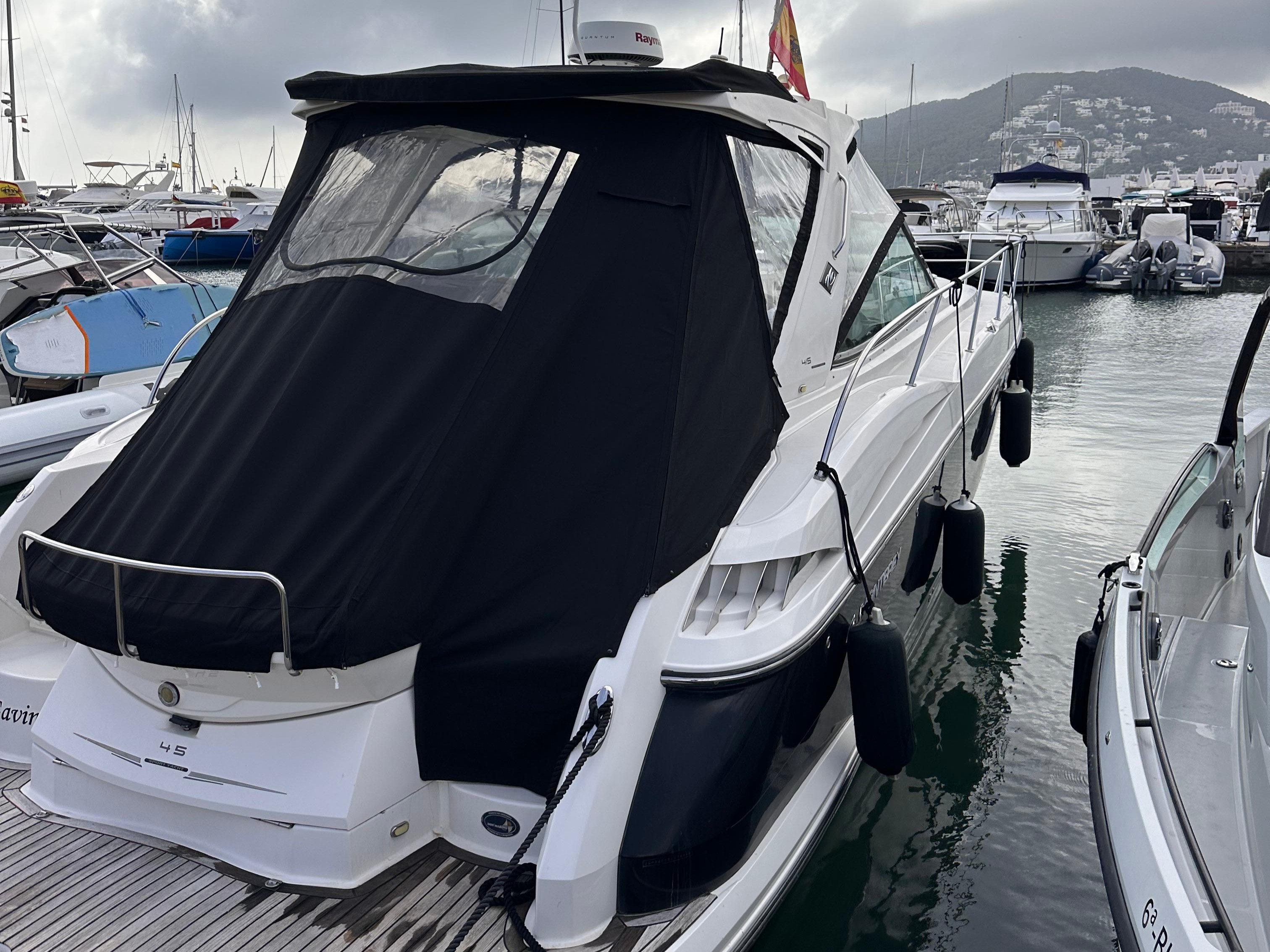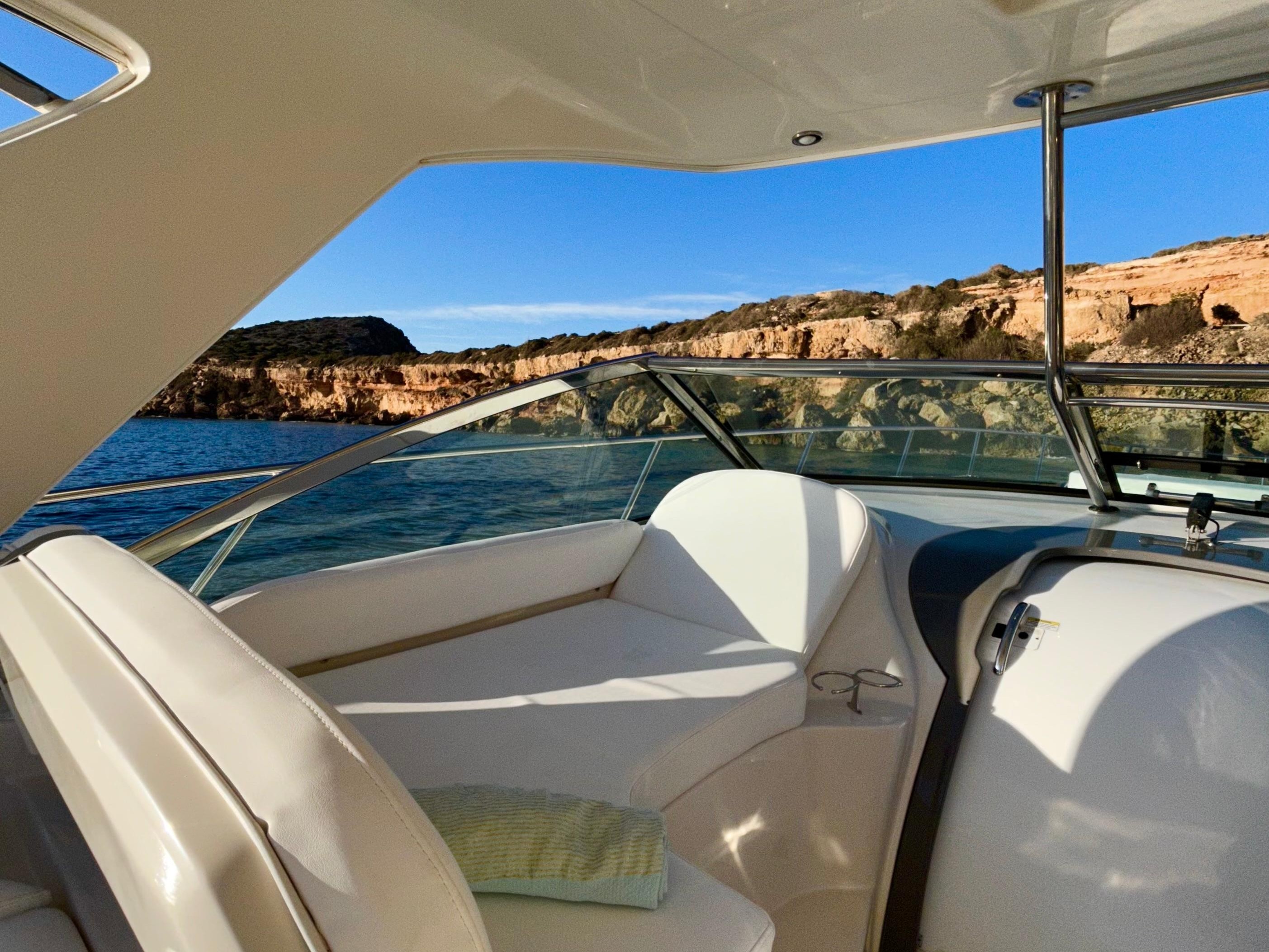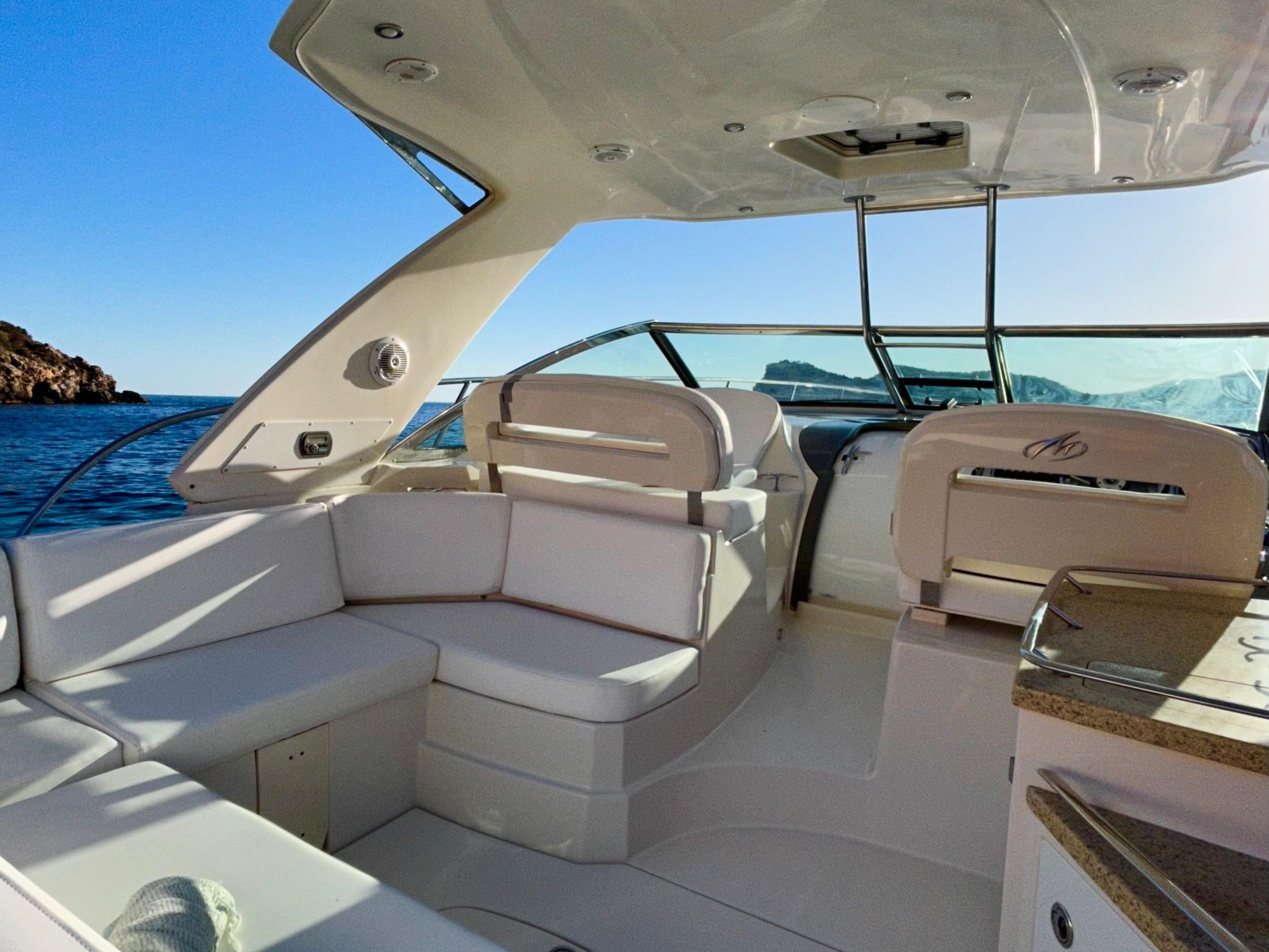 Monterey 415 Sport with sleek design, twin Volvo Penta D6 IPS engines, and bow thruster. Spacious cockpit and foredeck, two cabins below. Excellent condition, minor upgrades possible. Comes with transferable Ibiza mooring.