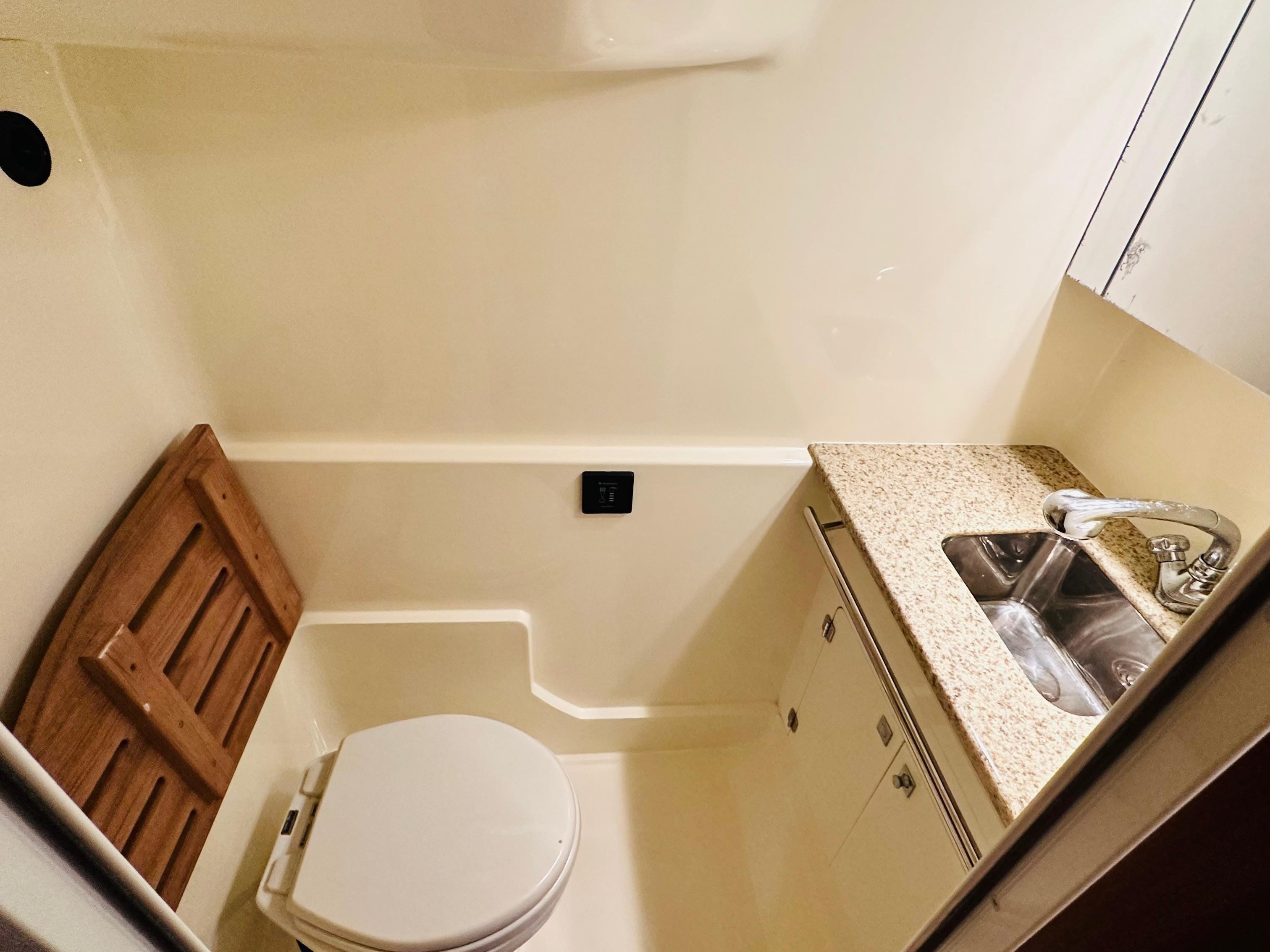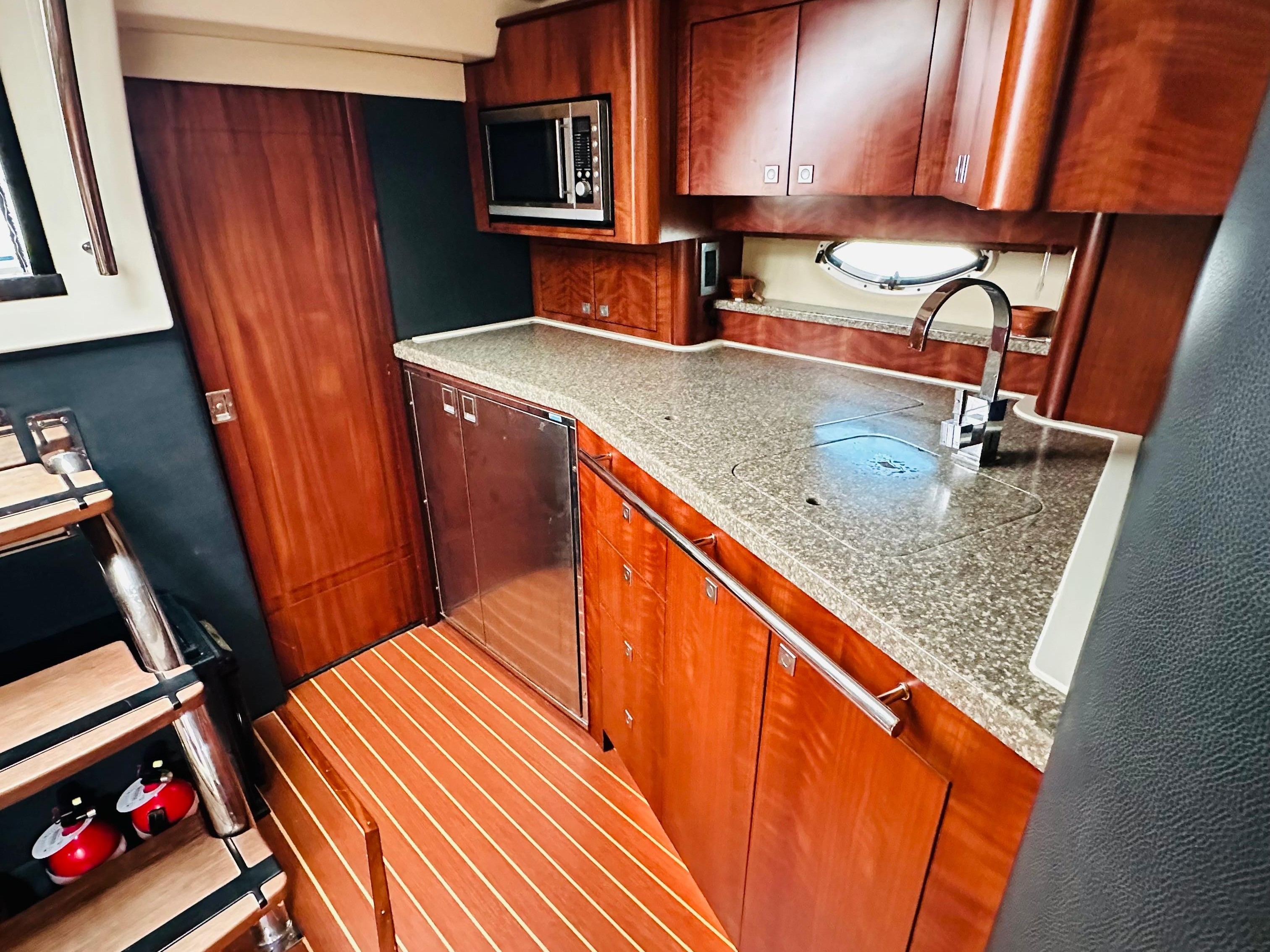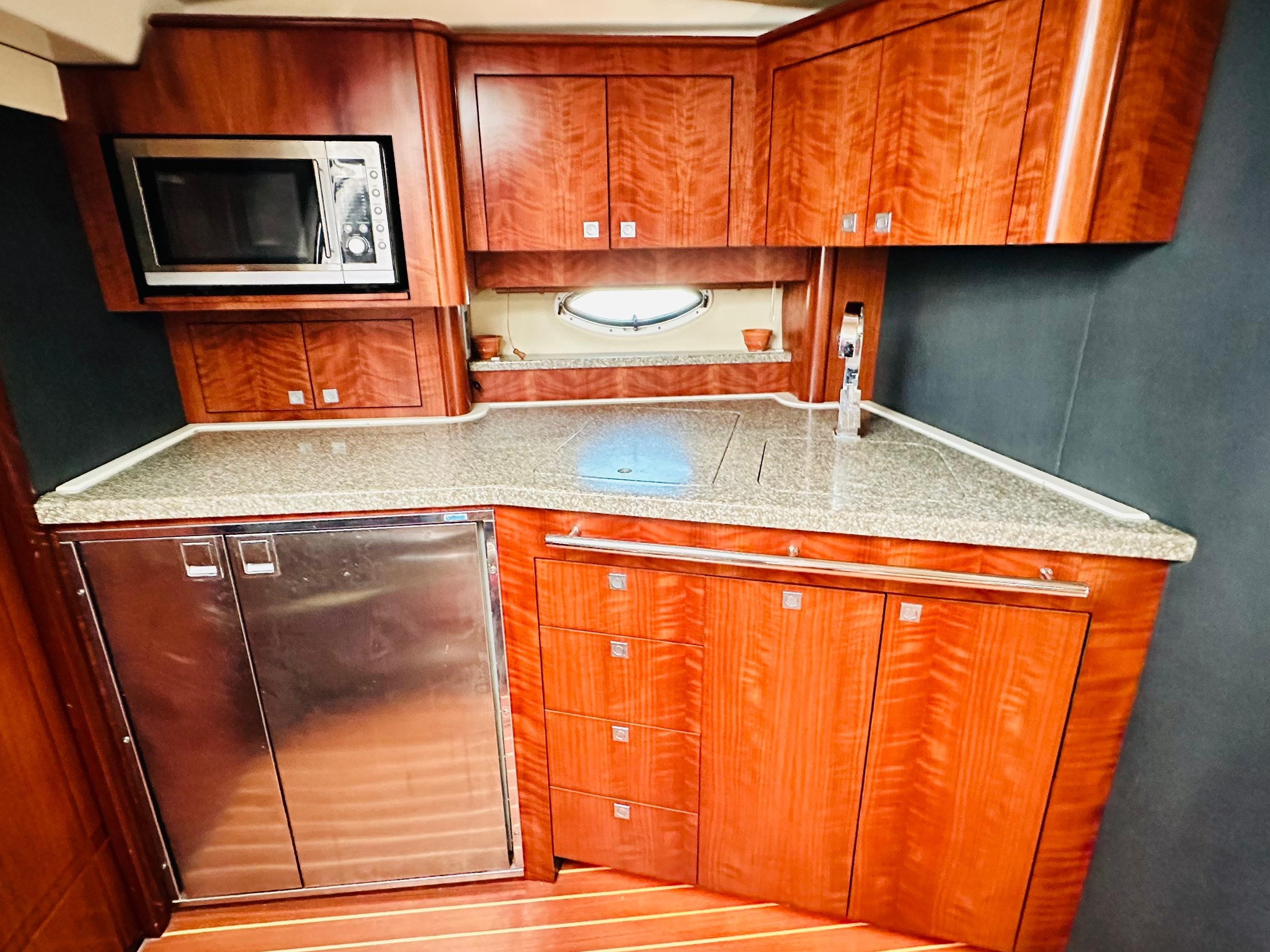Located to port and fully equipped with large refrigerator, microwave oven, and electric hob.