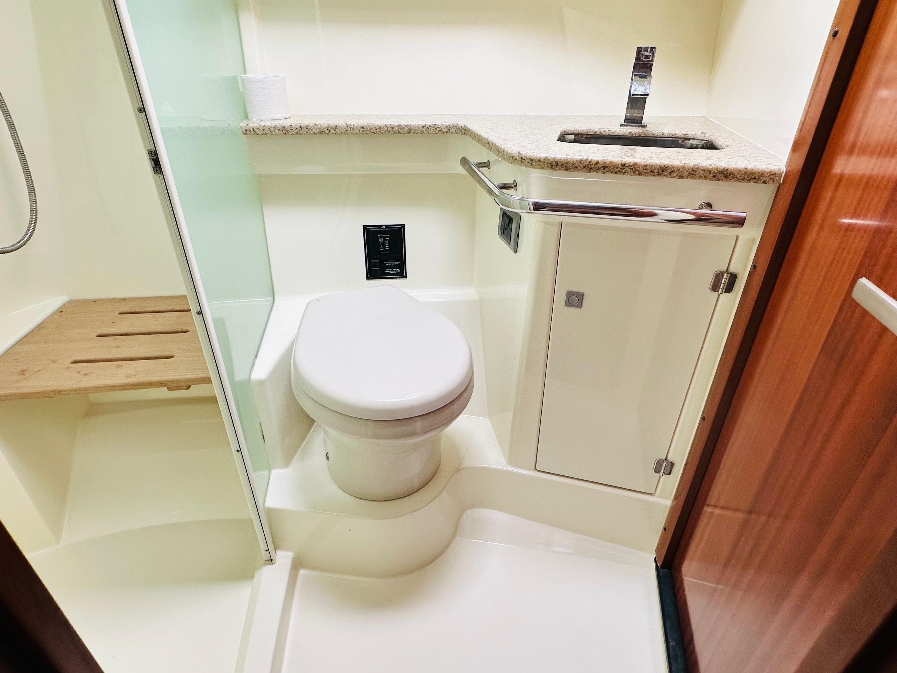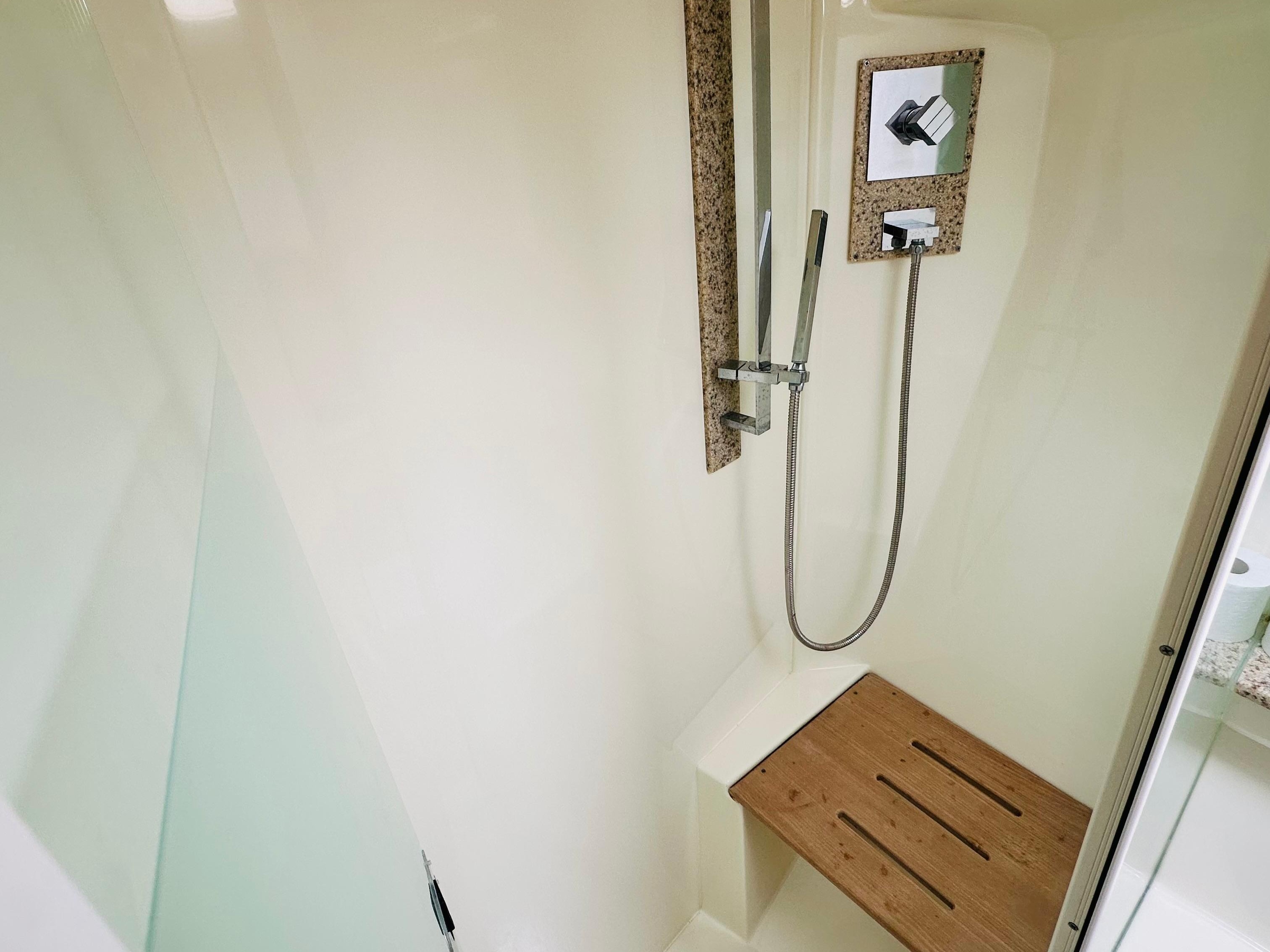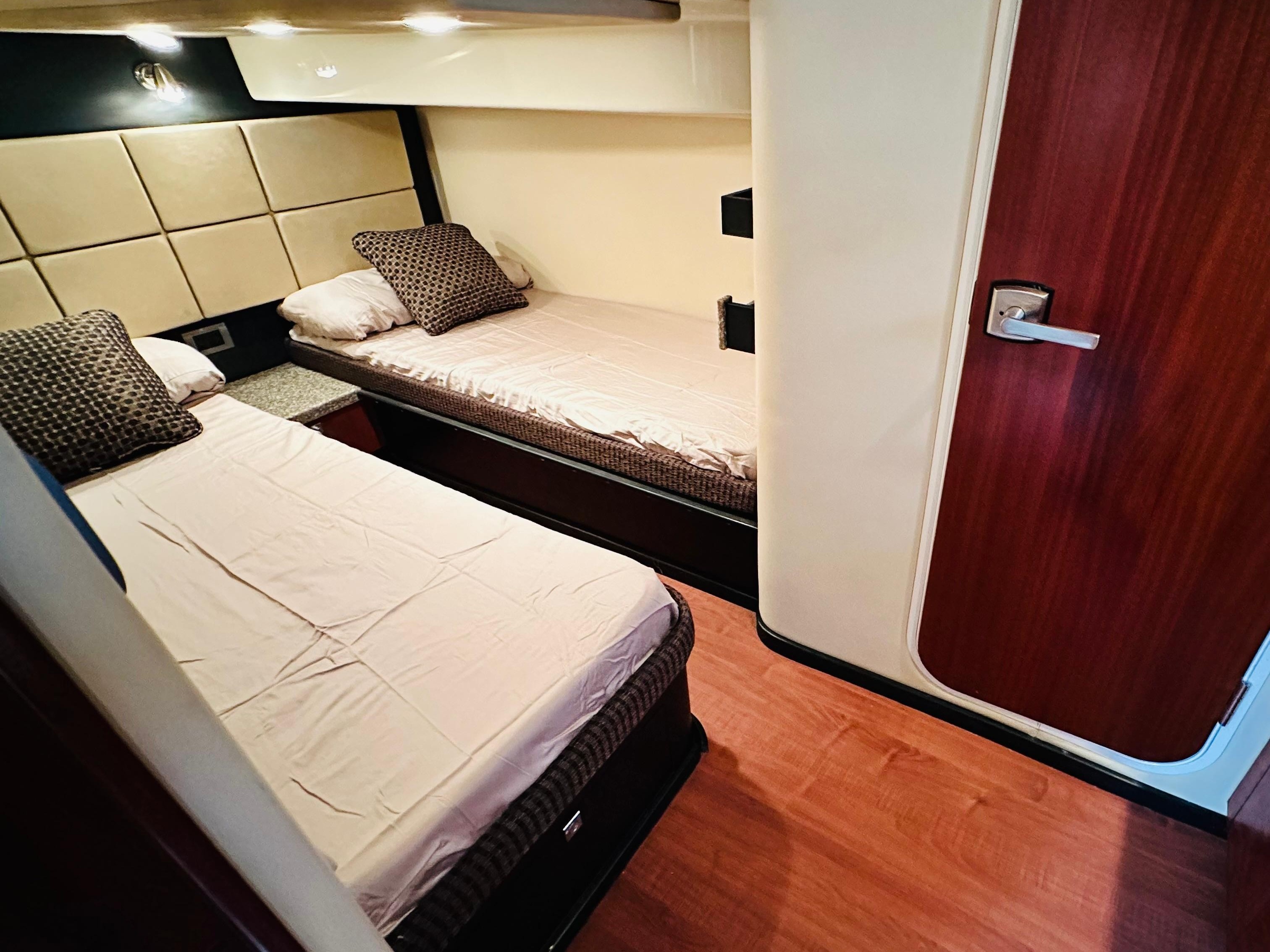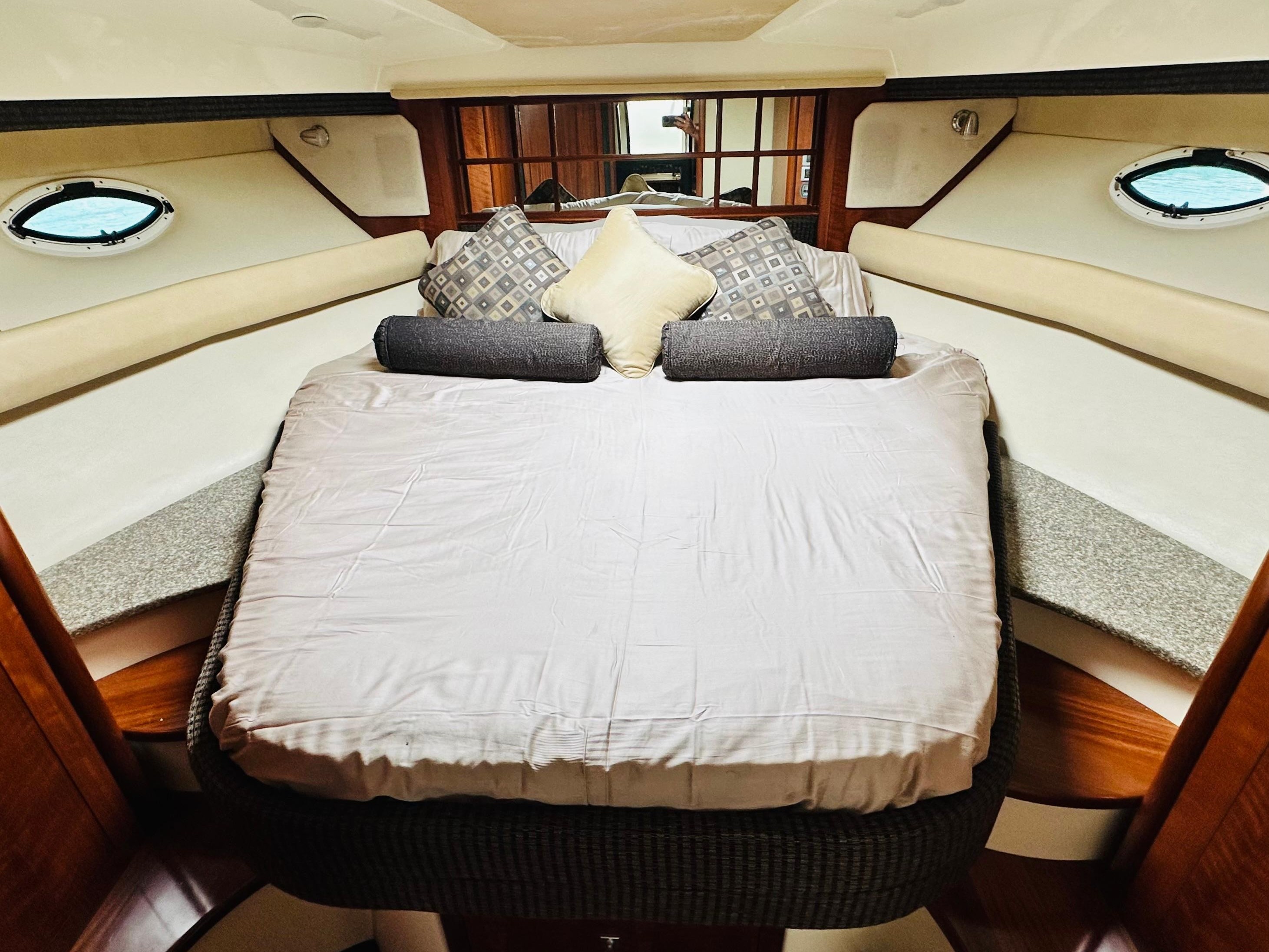 Spacious master cabin with queen-size island berth, storage cupboards on both sides, and en-suite bathroom with separate shower.