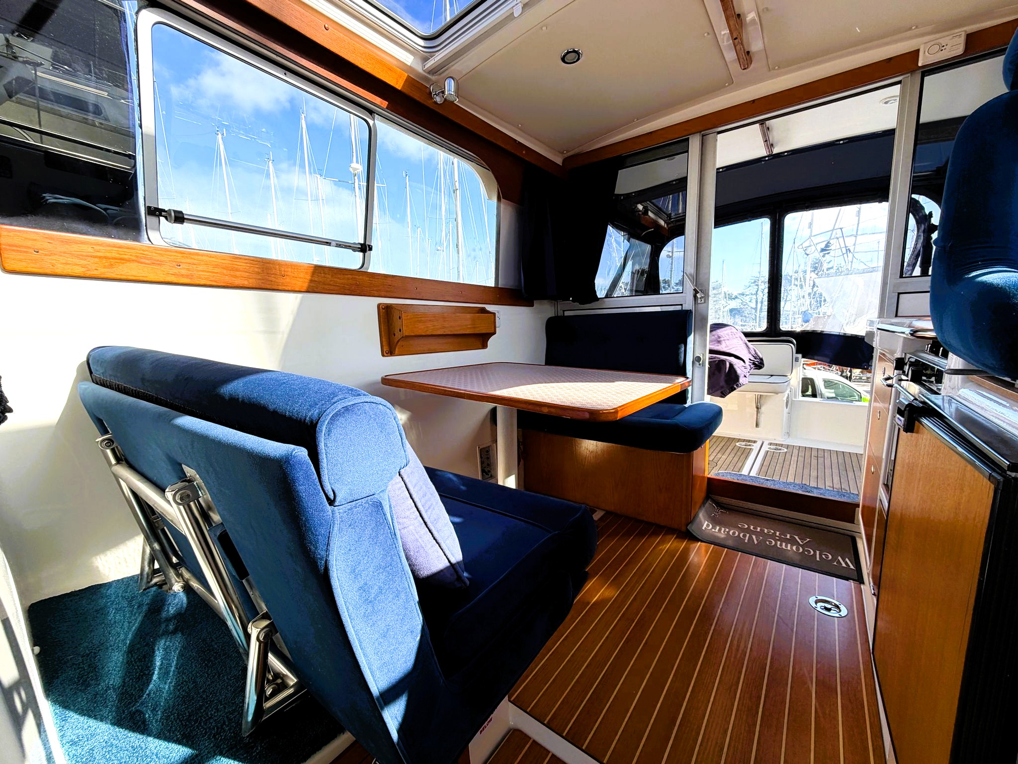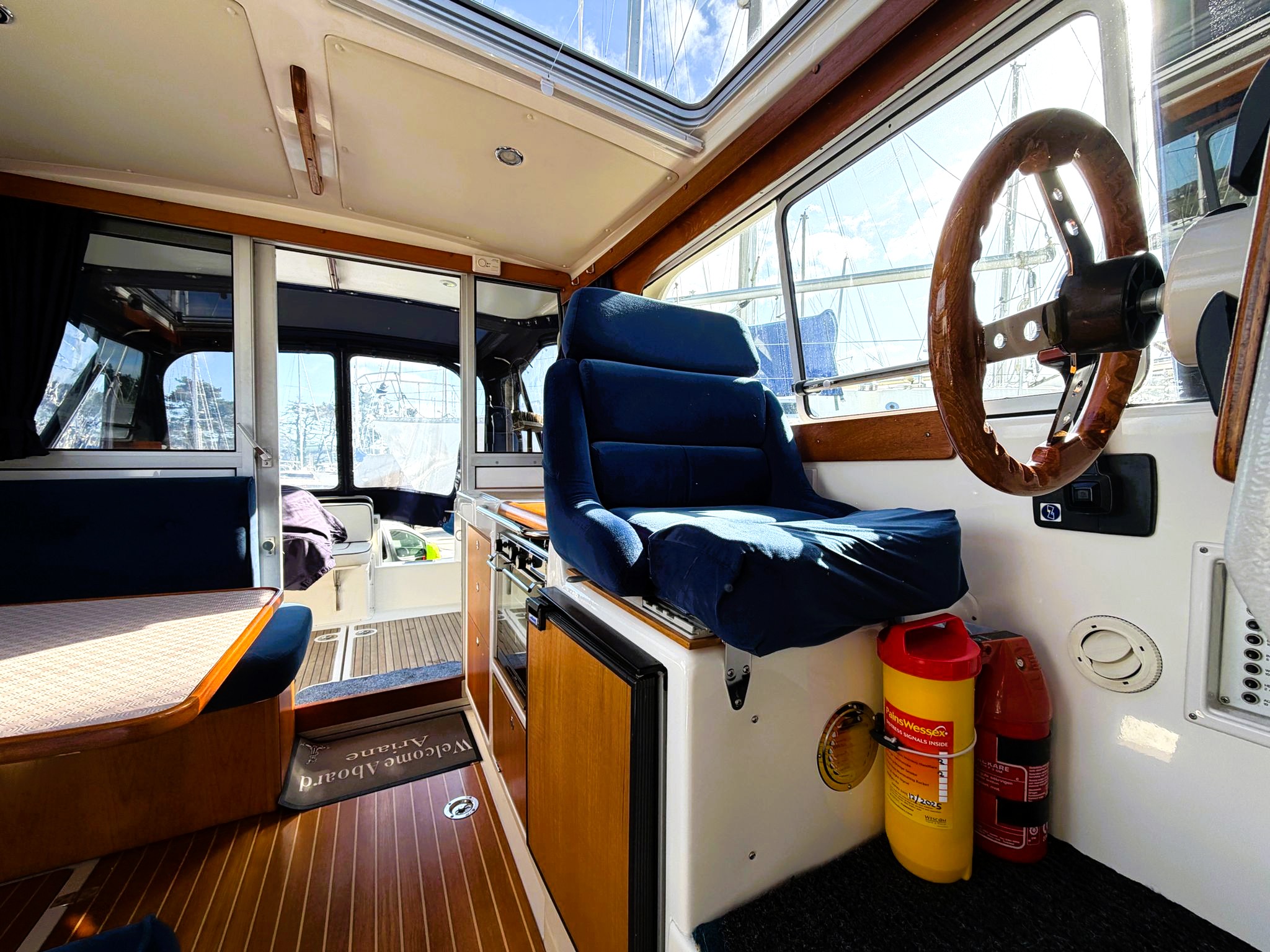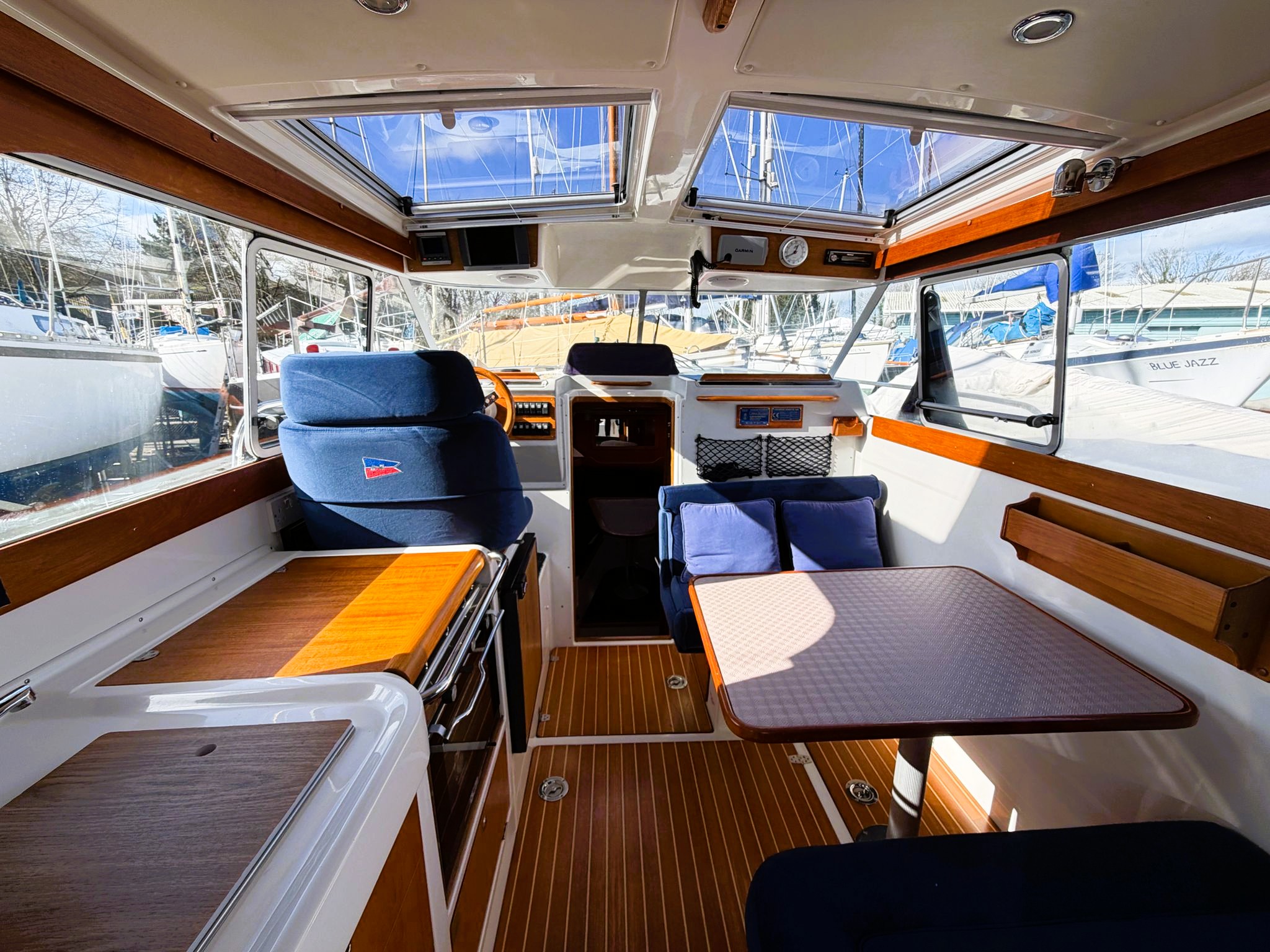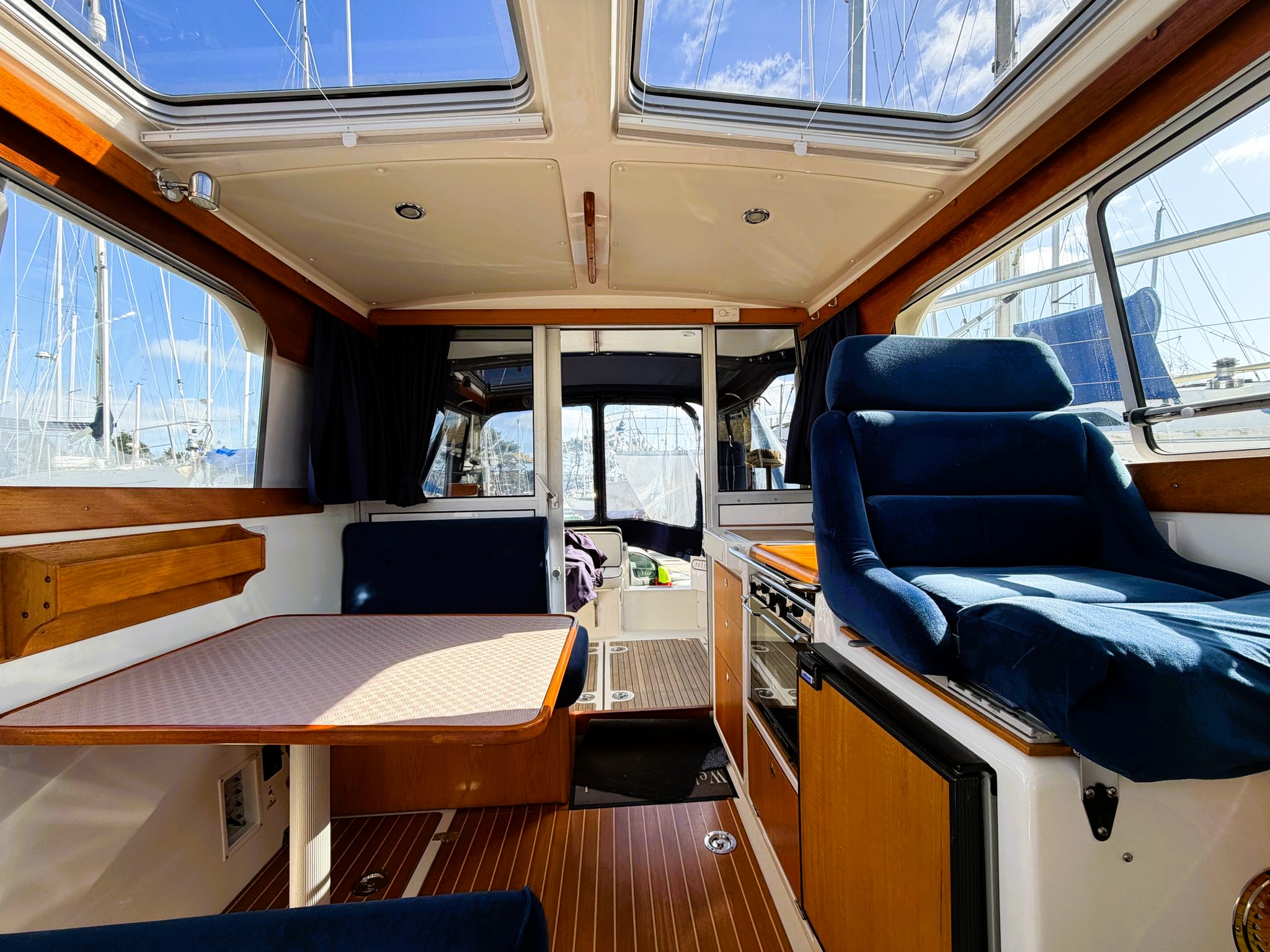 Spacious Cockpit & Saloon – Light-filled, with panoramic visibility and a Scandinavian wood finish