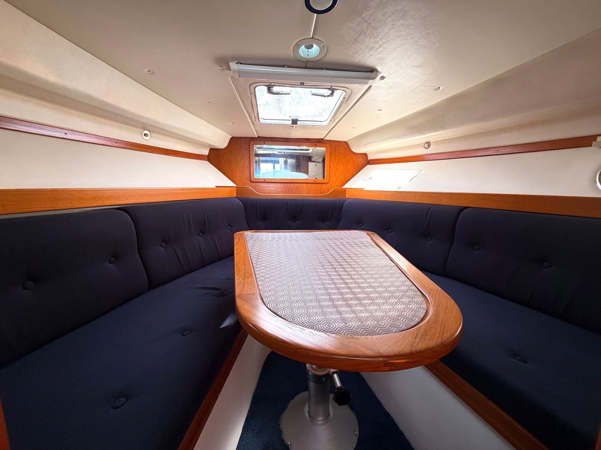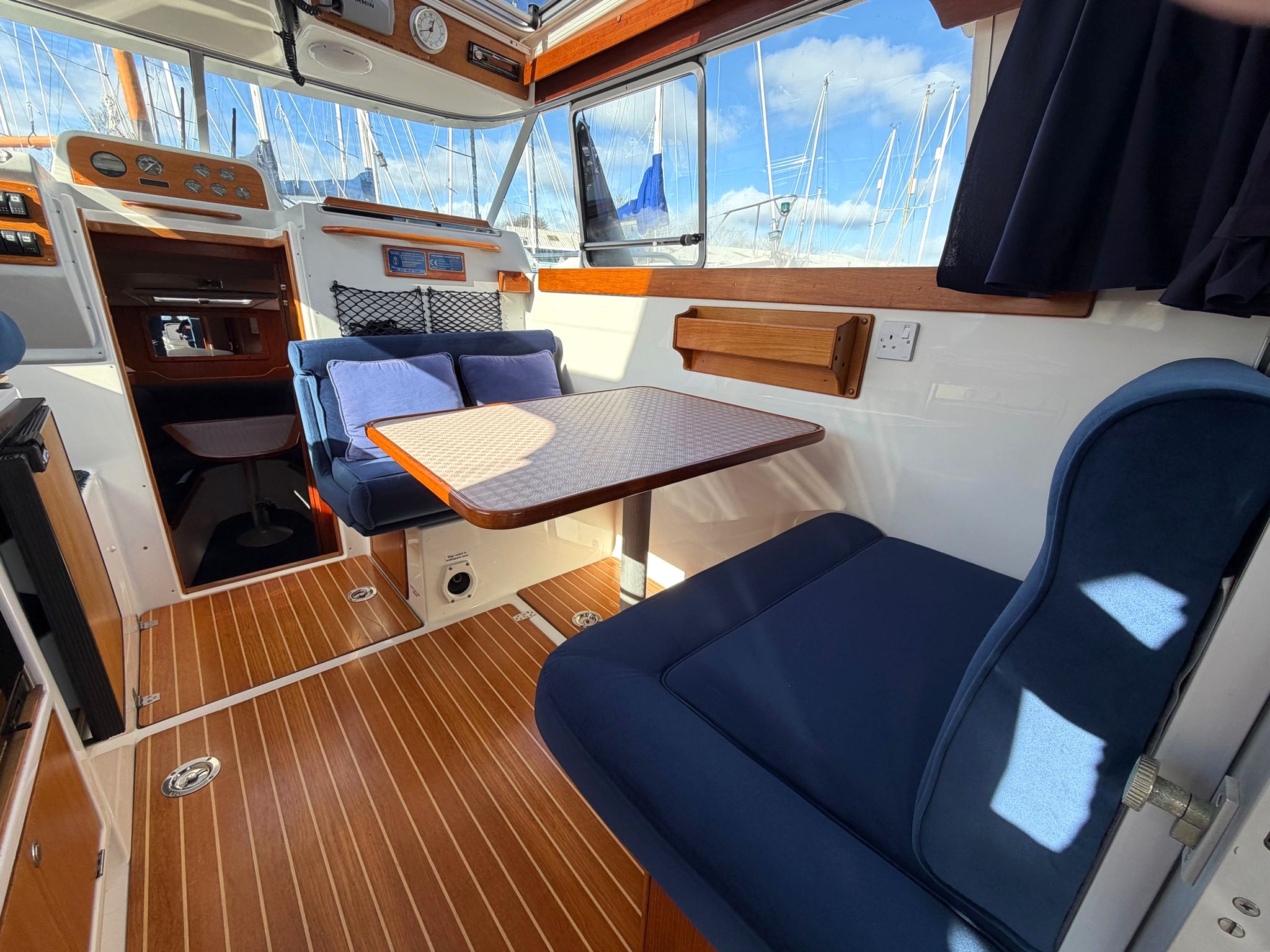 A forward sofa is reversible and serves as passenger seating whilst cruising and converts, with the additional sofa, into a double berth. Teak table, joinery and flooring.