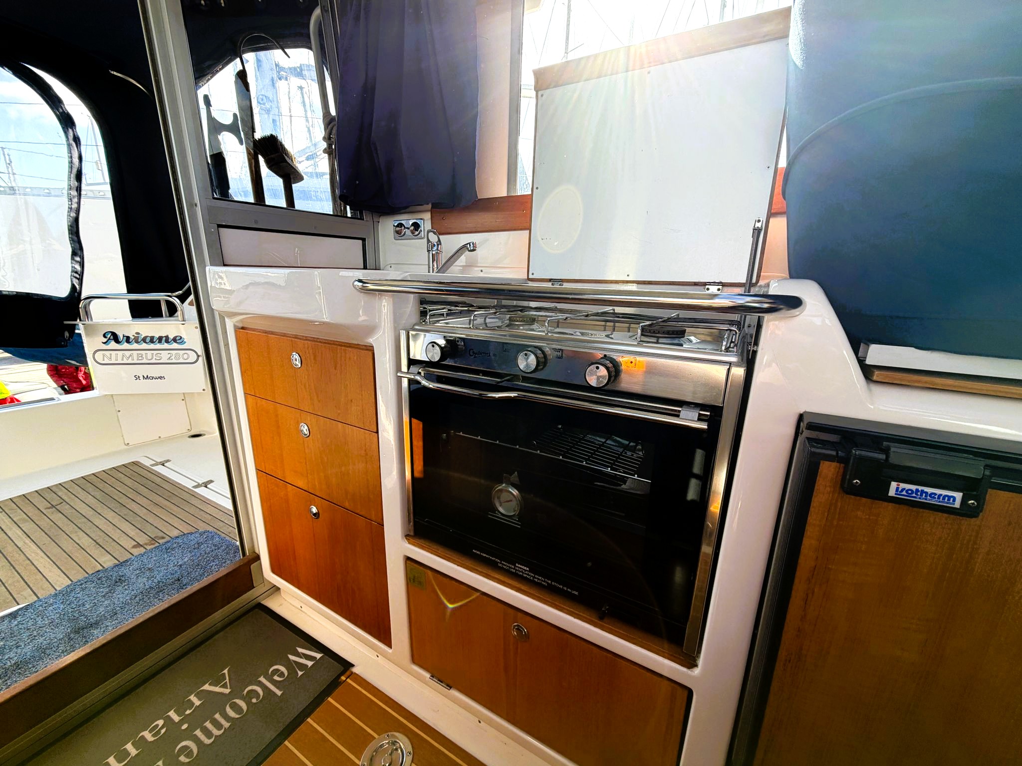 Elegant and functional galley containing a Optimus two burner gas stove with oven, stainless steel sink and Isotherm refrigerator with freezer compartment.