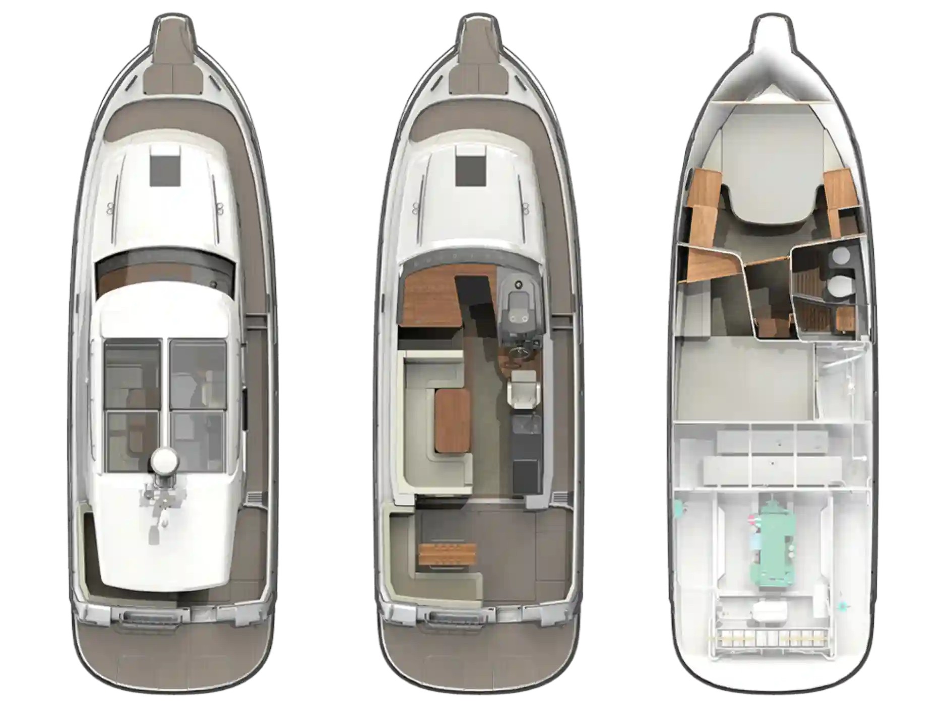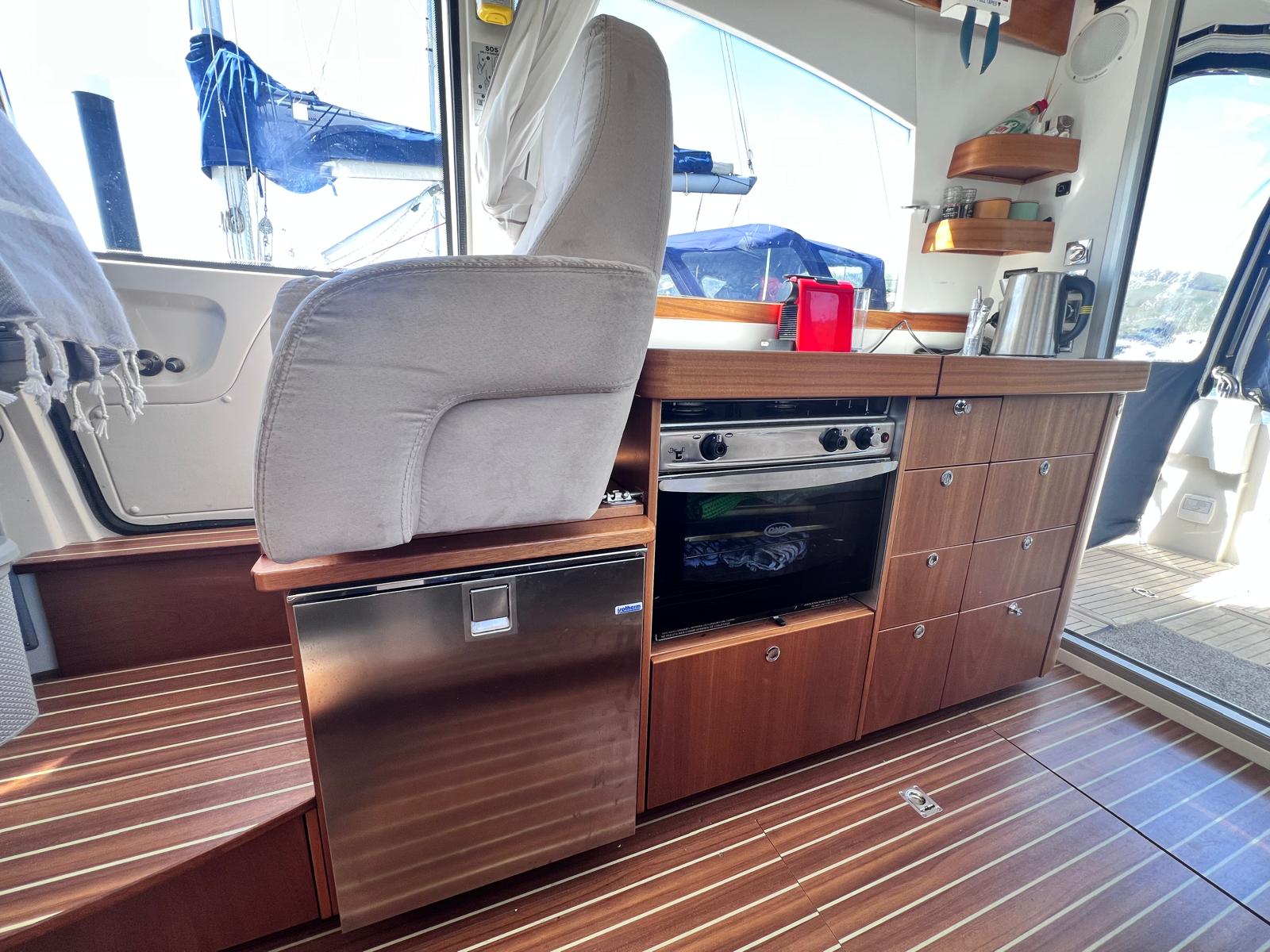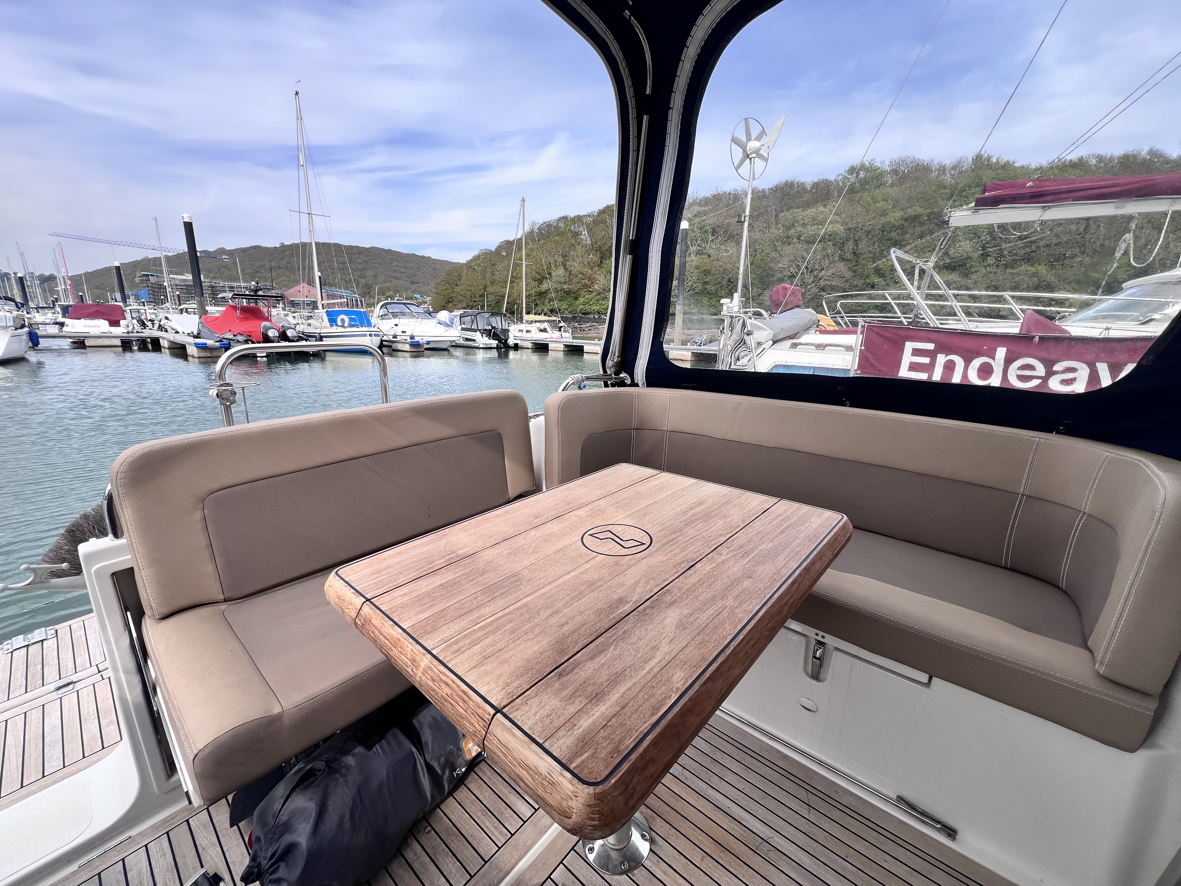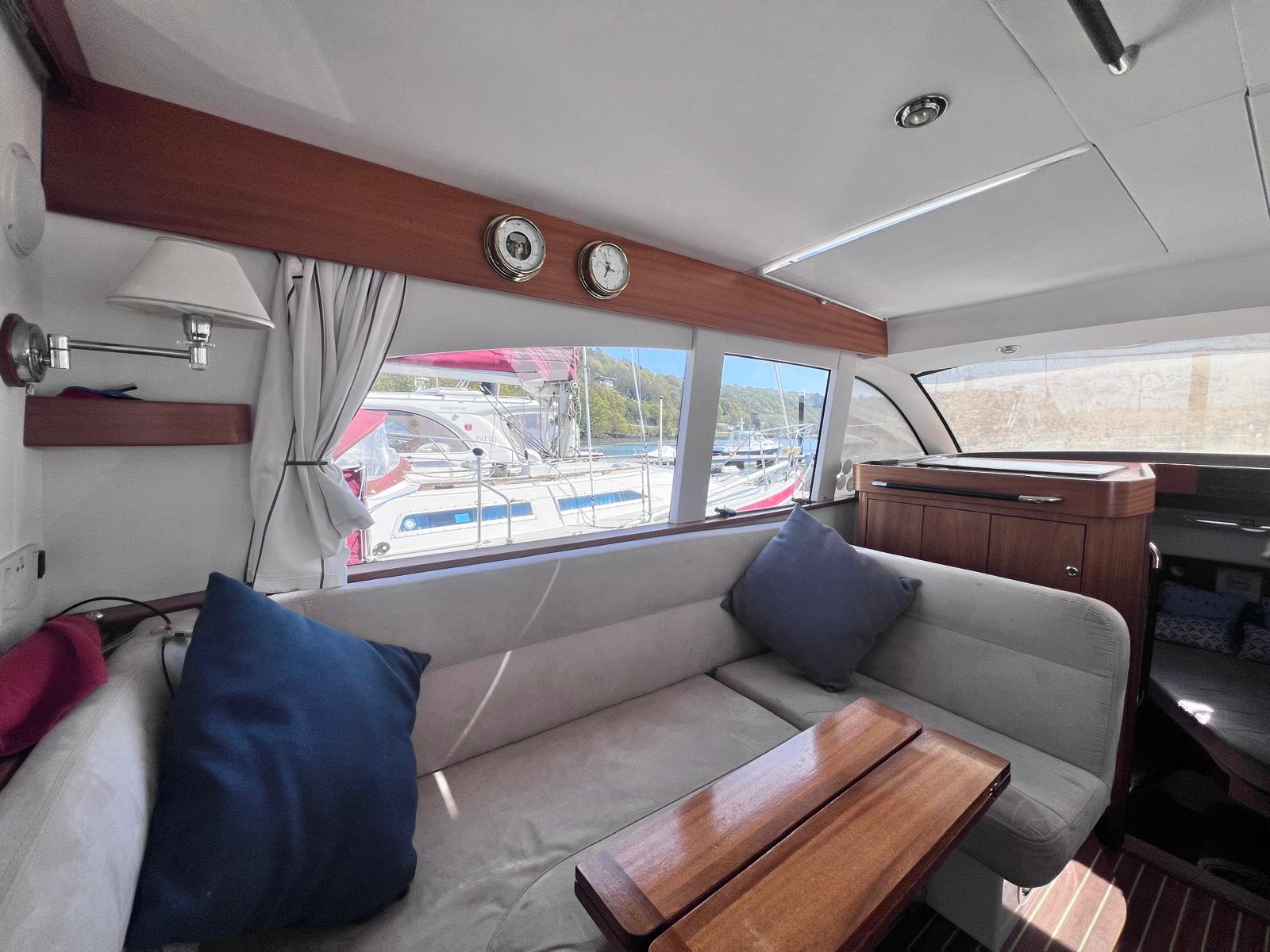 Cockpit with L-shaped seating/double berth with infill, reversable double seat to port, adjustable saloon table, storage to port