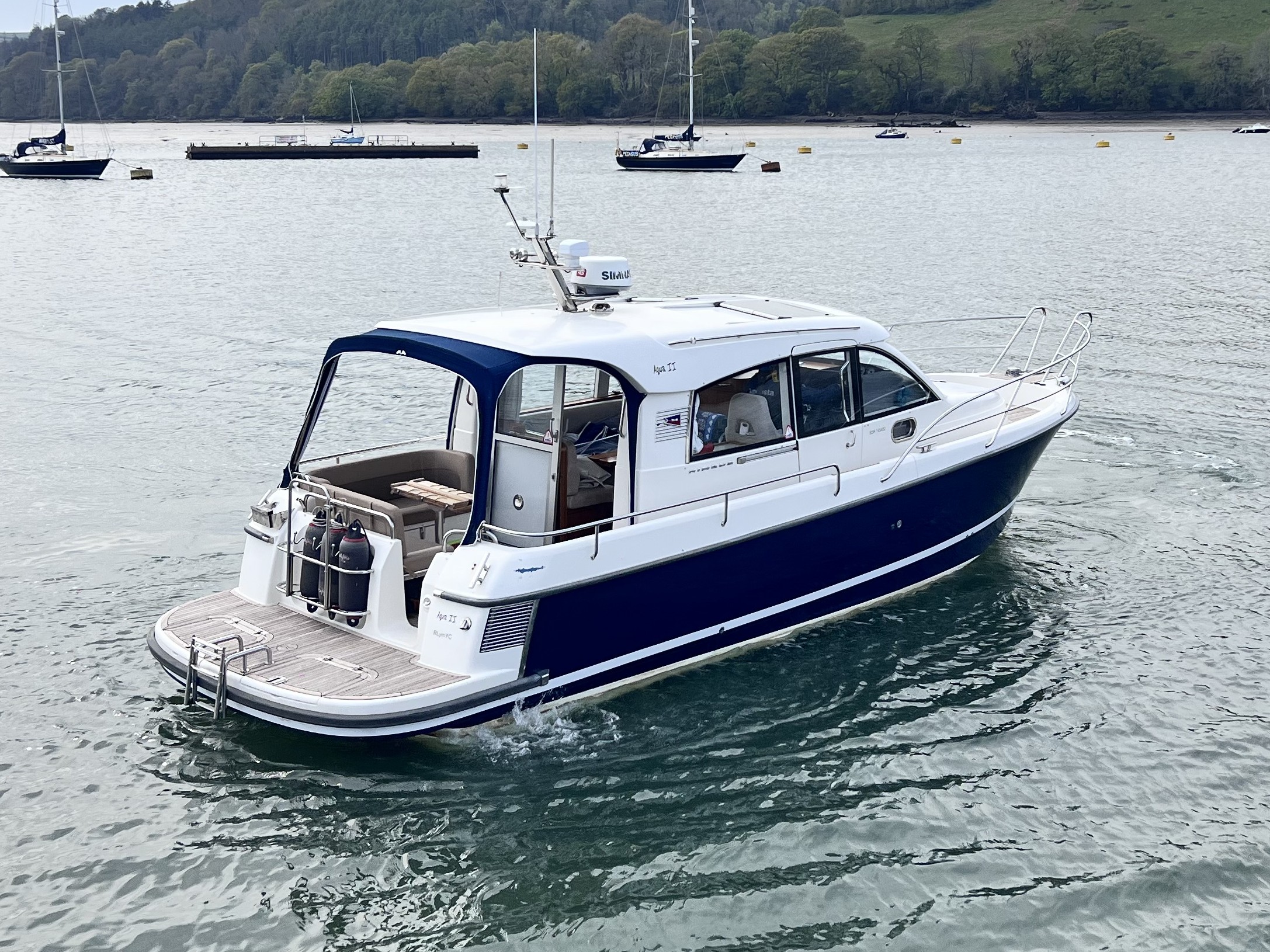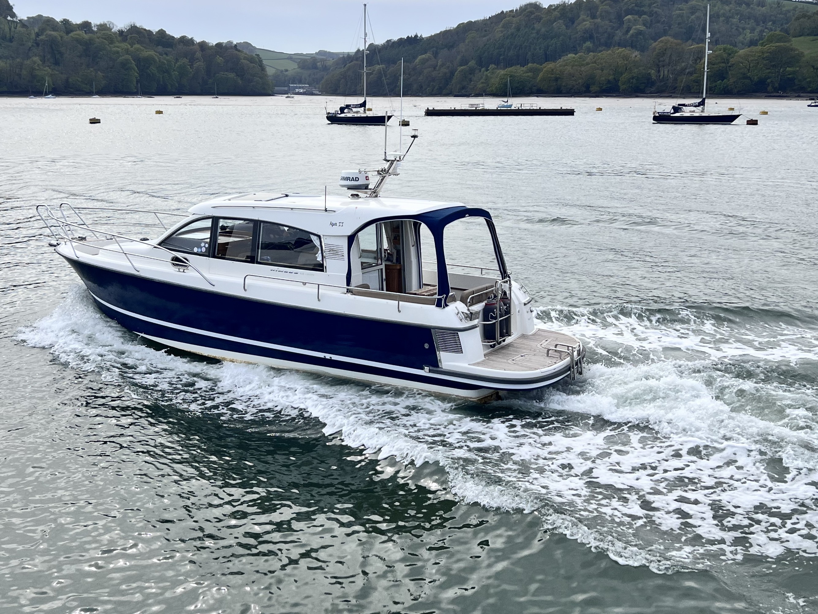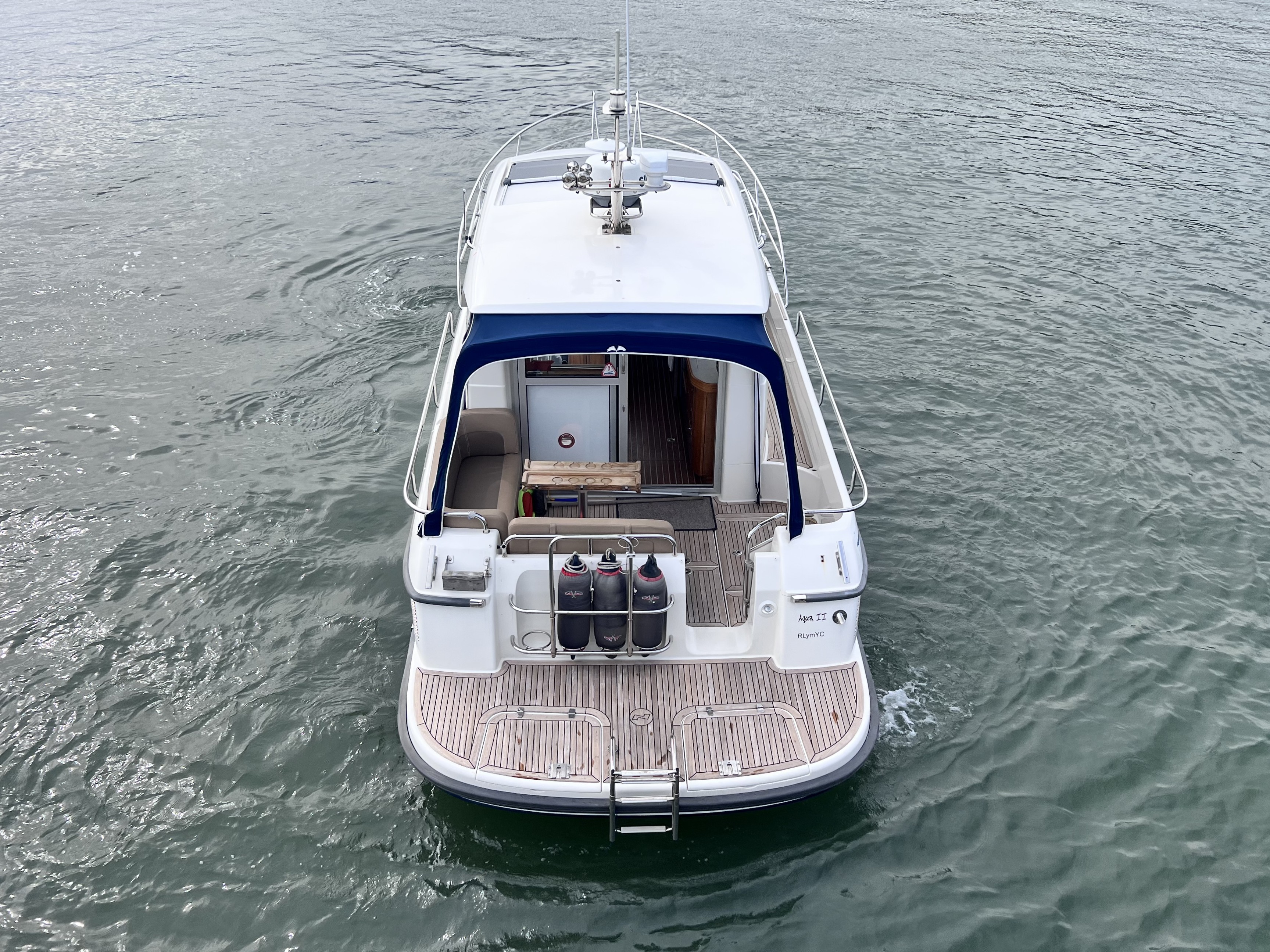 Nimbus 335 Coupe - Aqua II is a popular, well-regarded motorboat known for its build quality and versatile cruising capabilities, with a reputation for good performance and fuel efficiency. The 335 Coupe offers a large saloon wheelhouse with helm, seating around a drop down table, galley and access to the aft cockpit through large sliding doors. Powered by a single D4-260hp Volvo Penta on a shaft drive, there is also a bow & stern thruster to aid manoeuvring.
