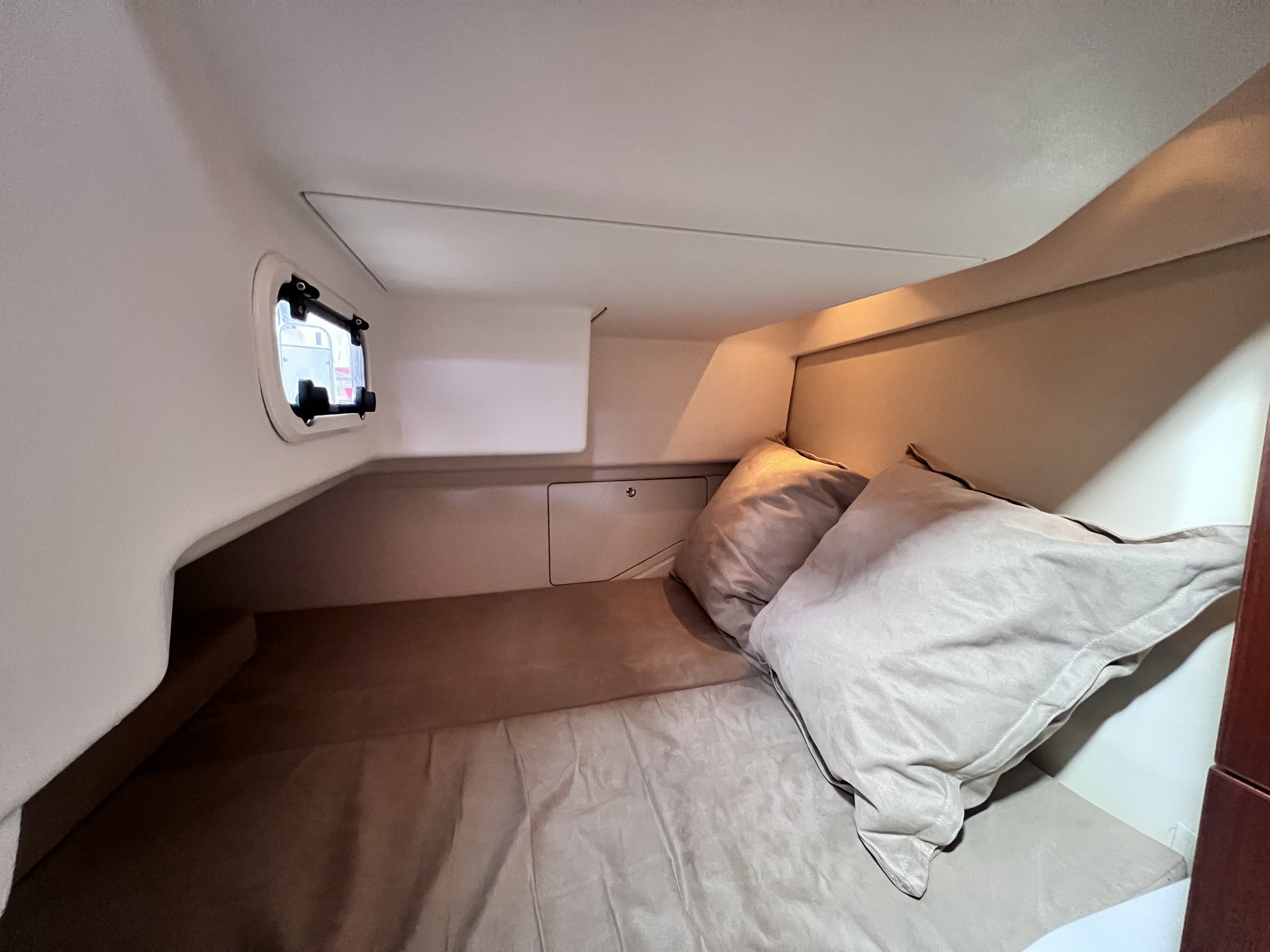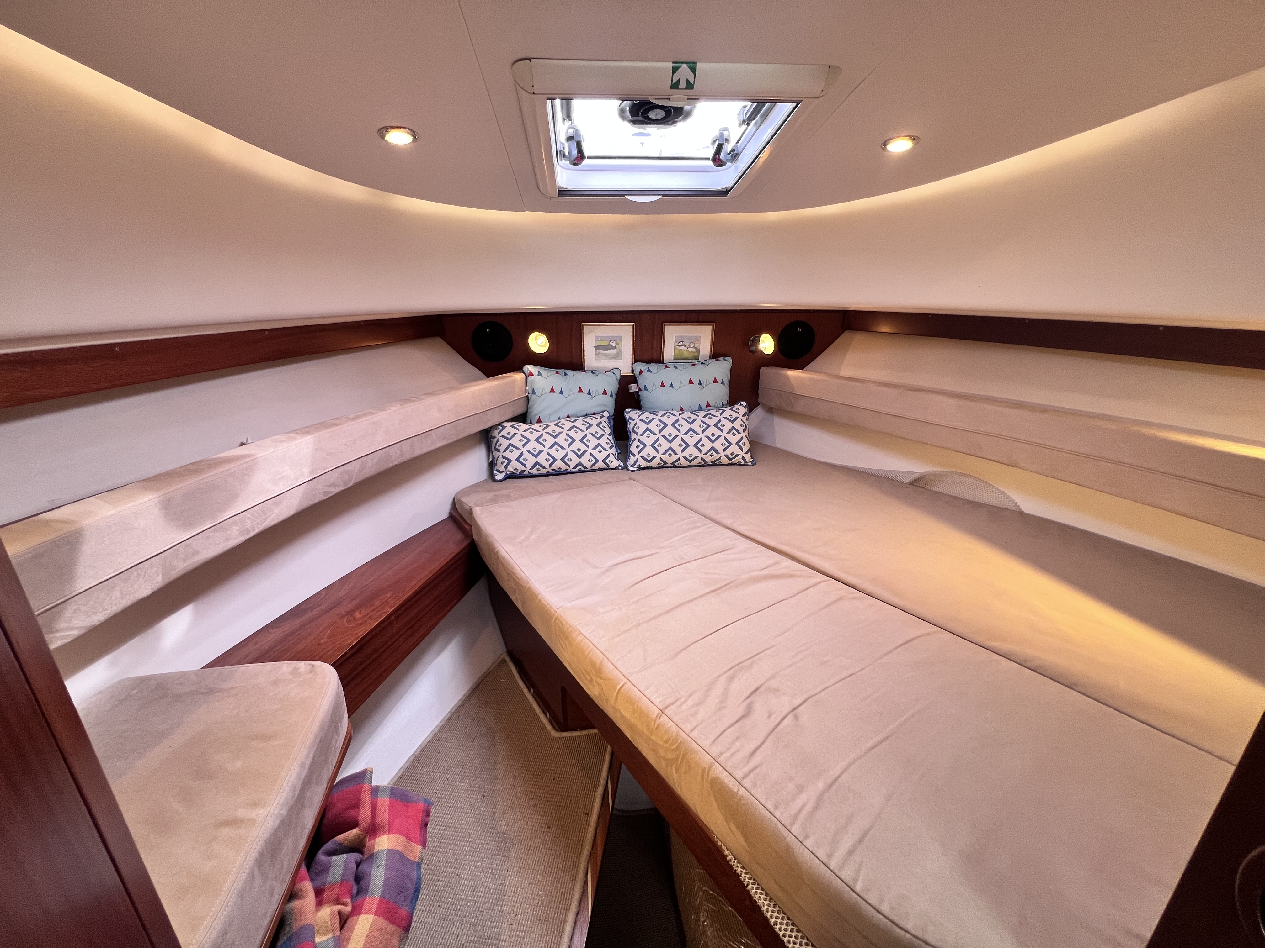 Offset double berth forward with storage, hanging wardrobes & port side cushioned seat