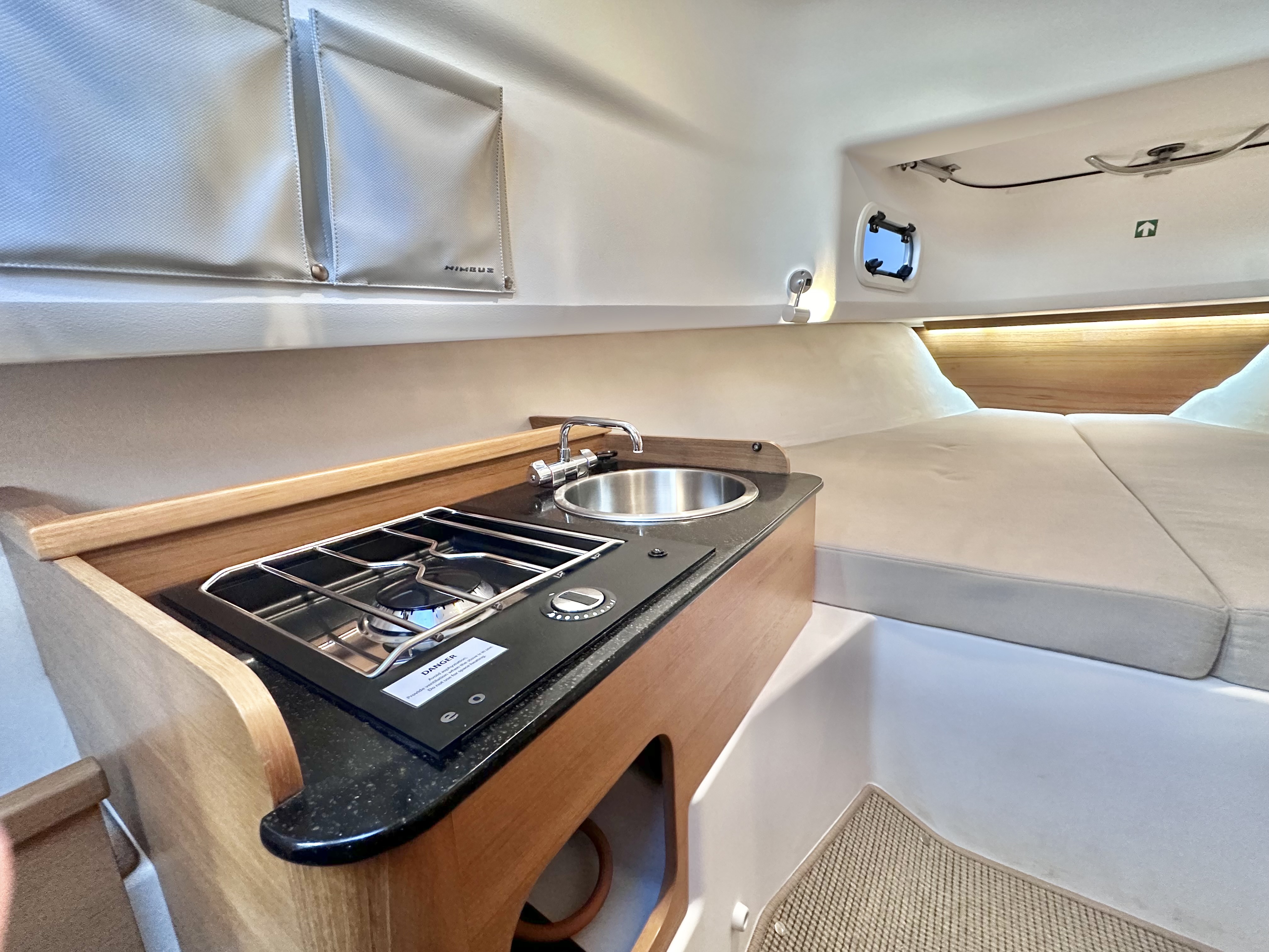 Port side galley with gas burner and freshwater sink