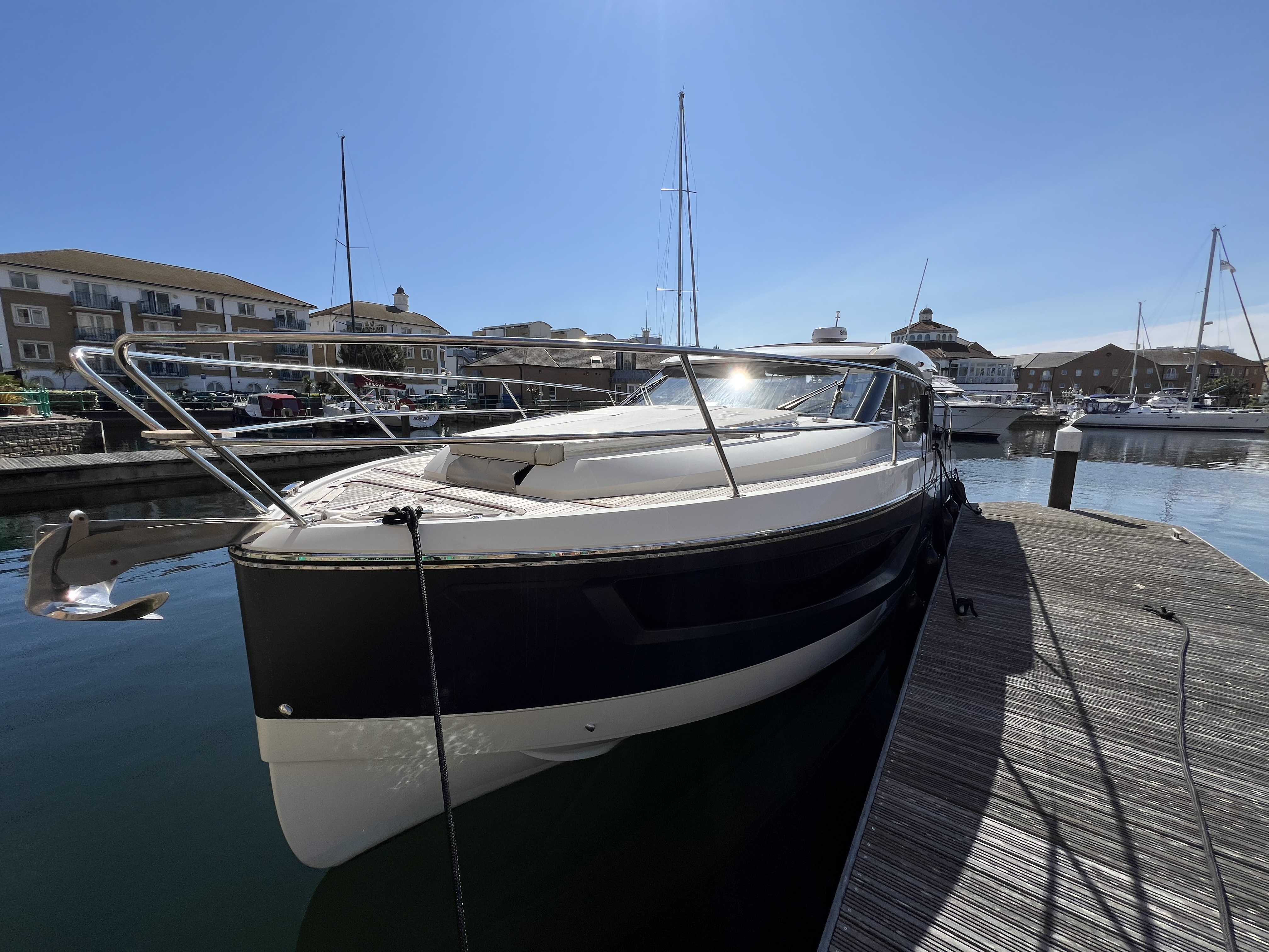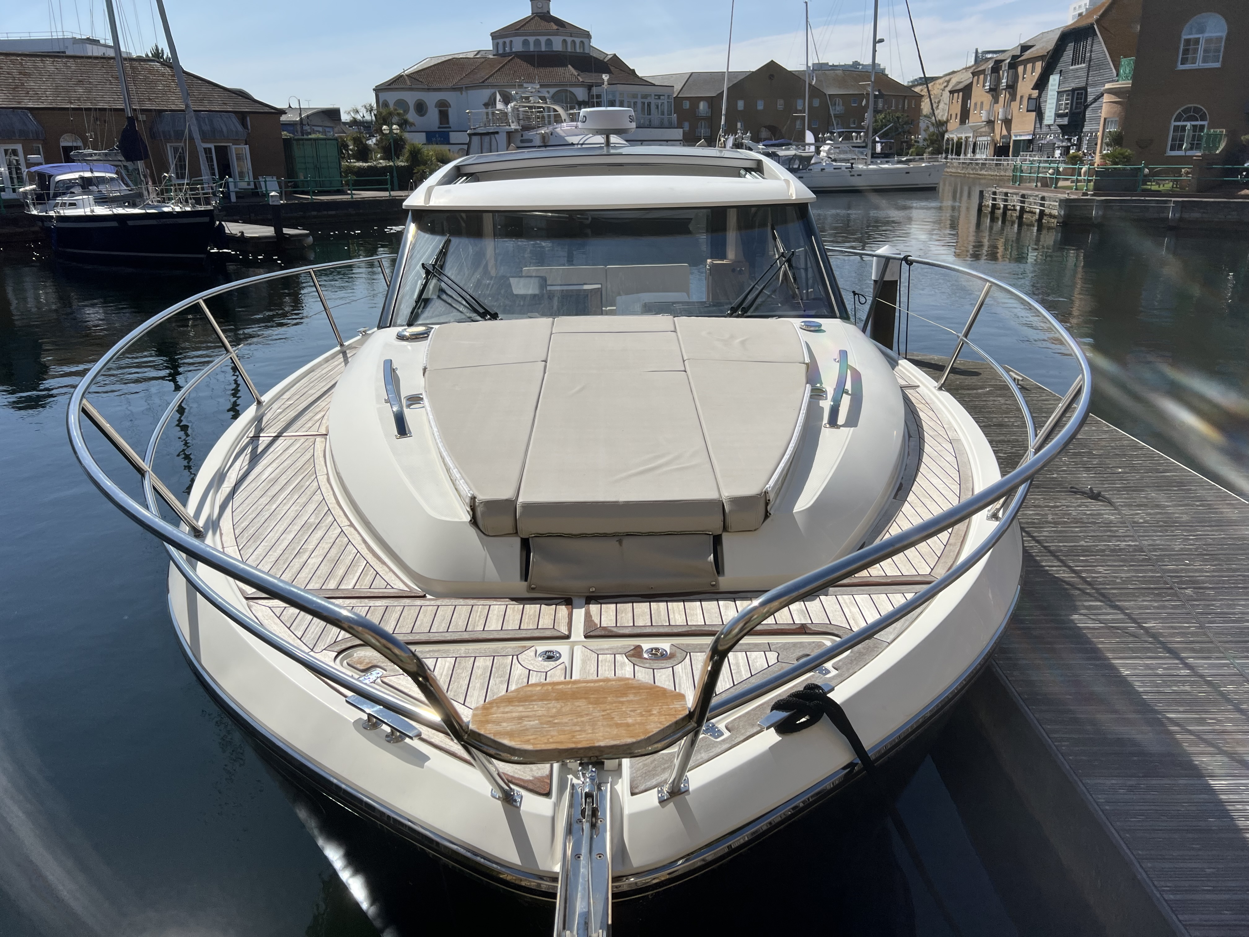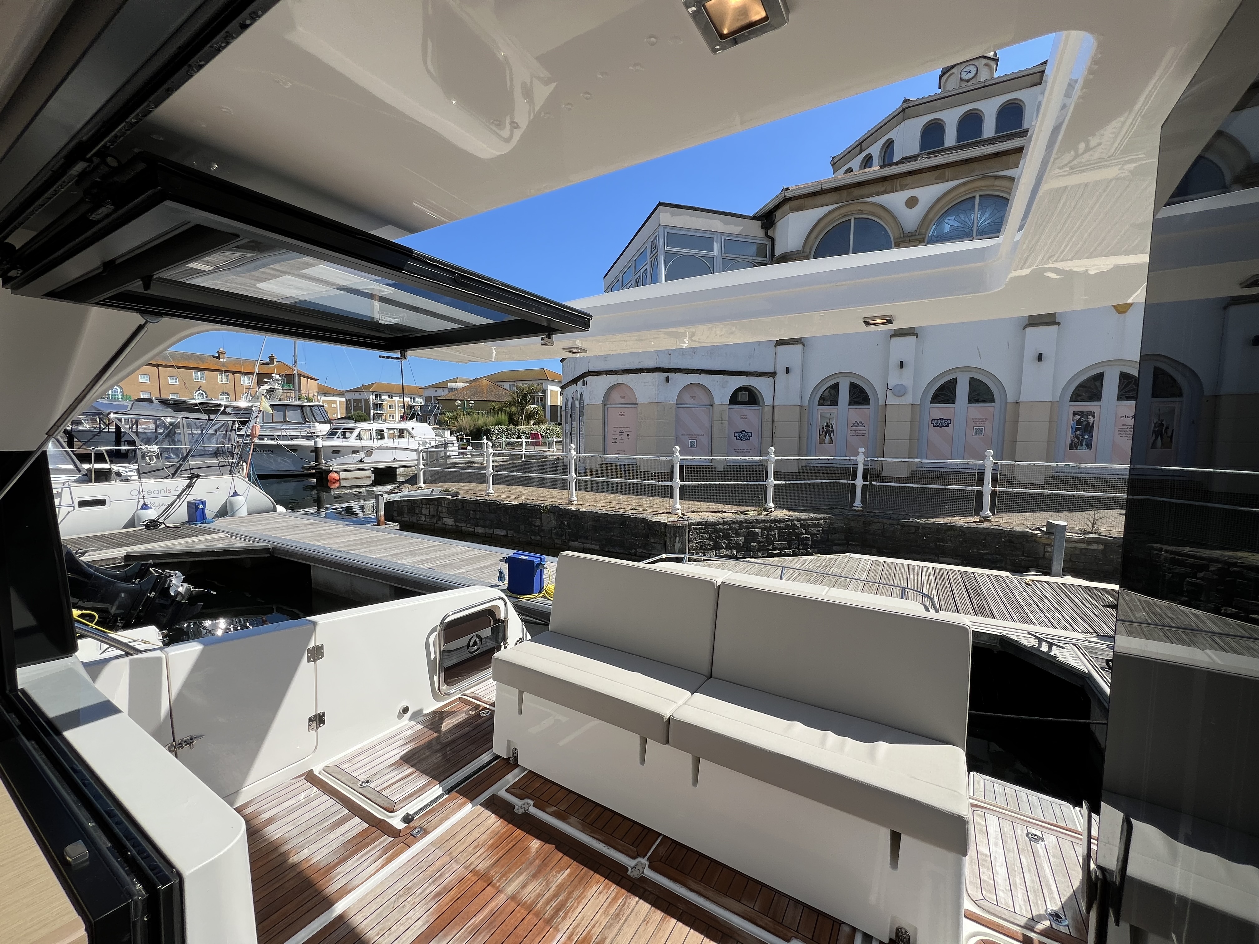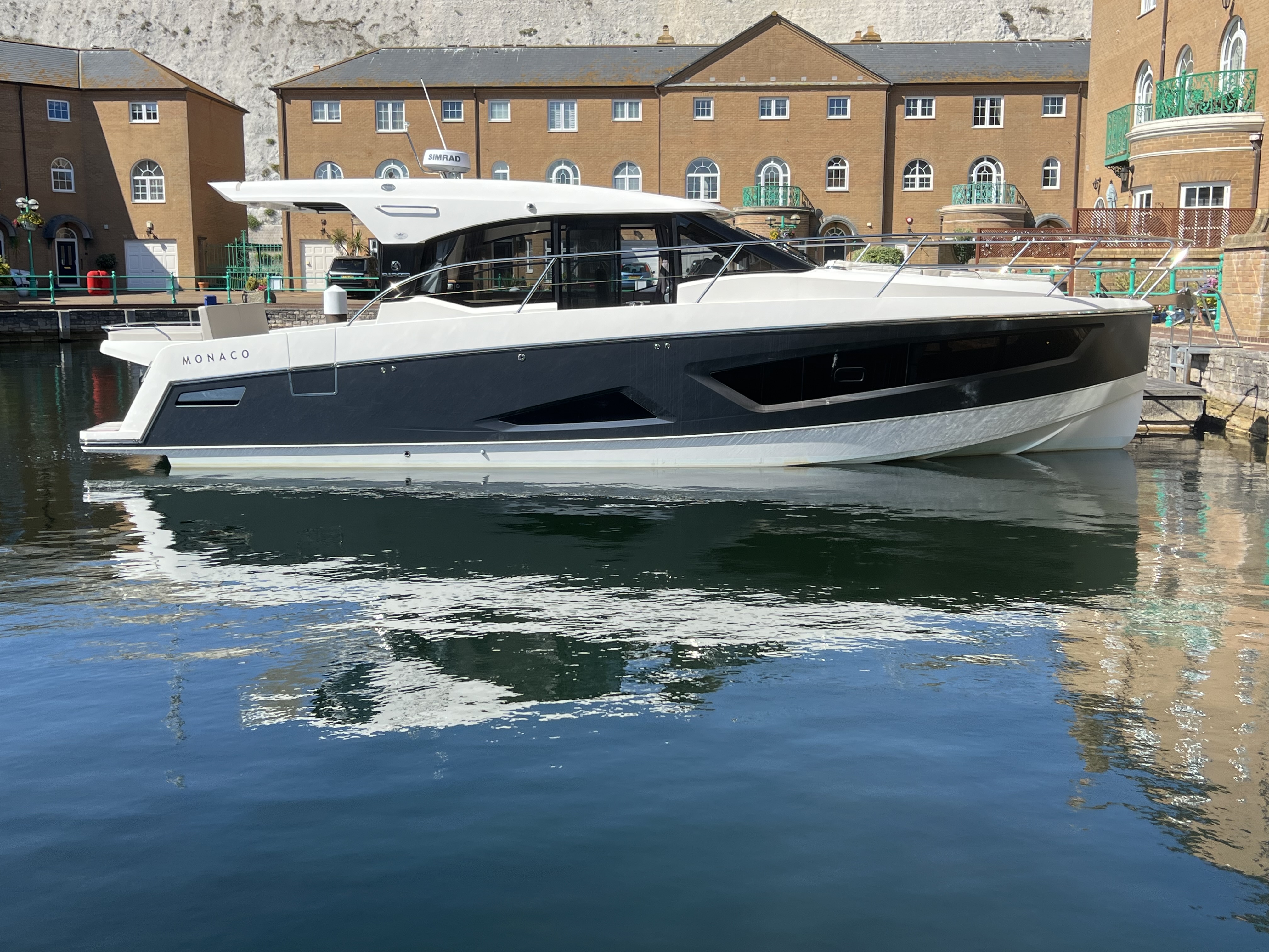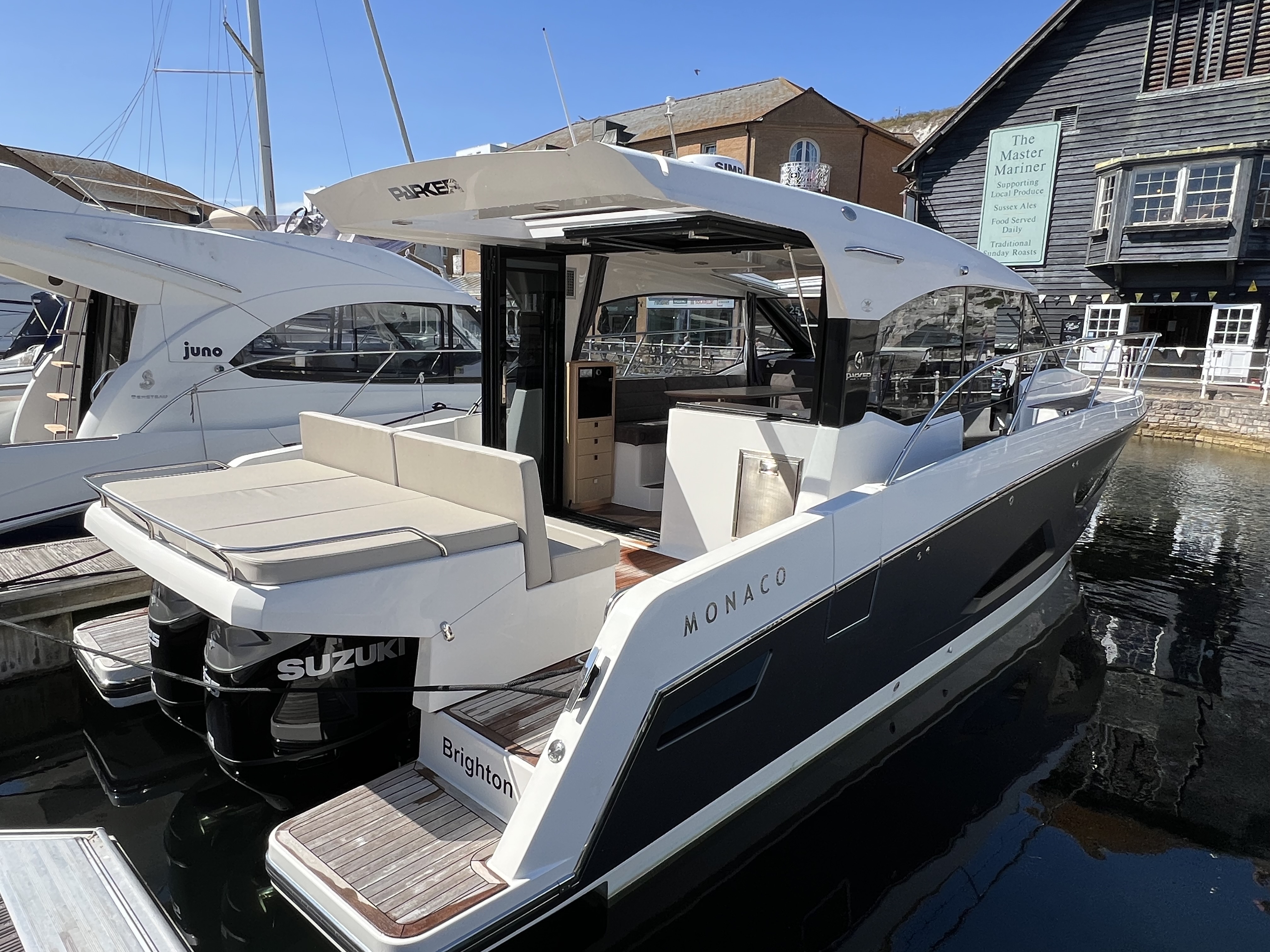 The Parker Monaco 110 design combines the spacious layout of a cruiser with the latest outboard designs. These Suzuki 325hp outboards with duo-props are now very efficient and great value-for-money delivering performance and light weight compared with inboard engines plus giving a quieter ride at sea and less fumes. Raising the outboards allows the props and legs to be clear of the water avoiding the need to antifoul them and spending less time immersed in salt water. This helps enormously with lower cost maintenance. The Monaco 110 offers the perfect alfresco boating experience with performance and style. Open plan spacious living, no difficult covers, large open sliding roof and panoramic windows. Sumptuous cabins, saloon and alfresco galley with a spacious cockpit area, make it a modern design giving easy boating. Reverse cycle Heat and cold Air Con, new Webasto diesel fired heating, Generator, Bow Thruster, ZipWake trim tabs, Radar and so much more on the inventory. 50 hours on clock, she almost a new boat. Never been slept in, the boat is immaculate.