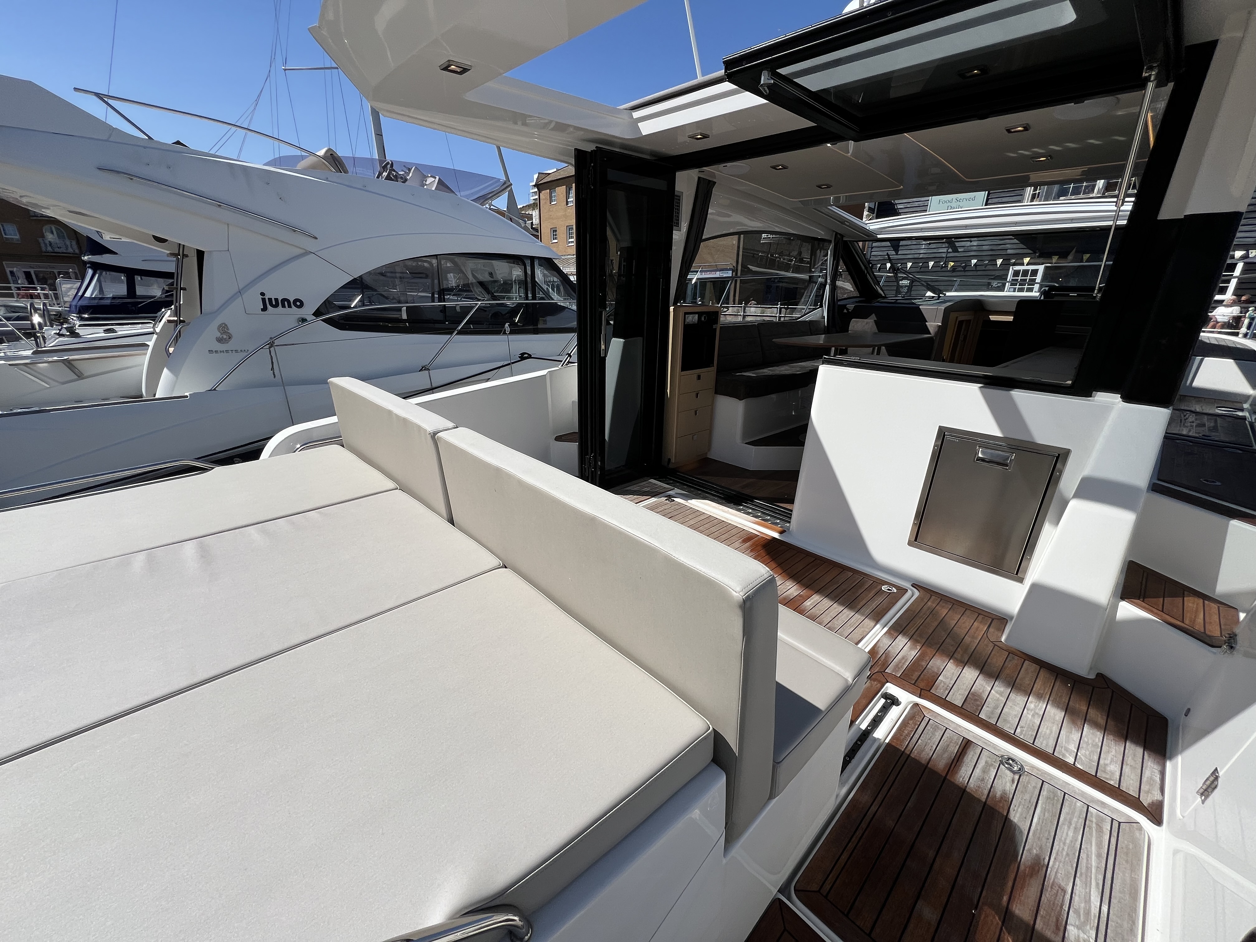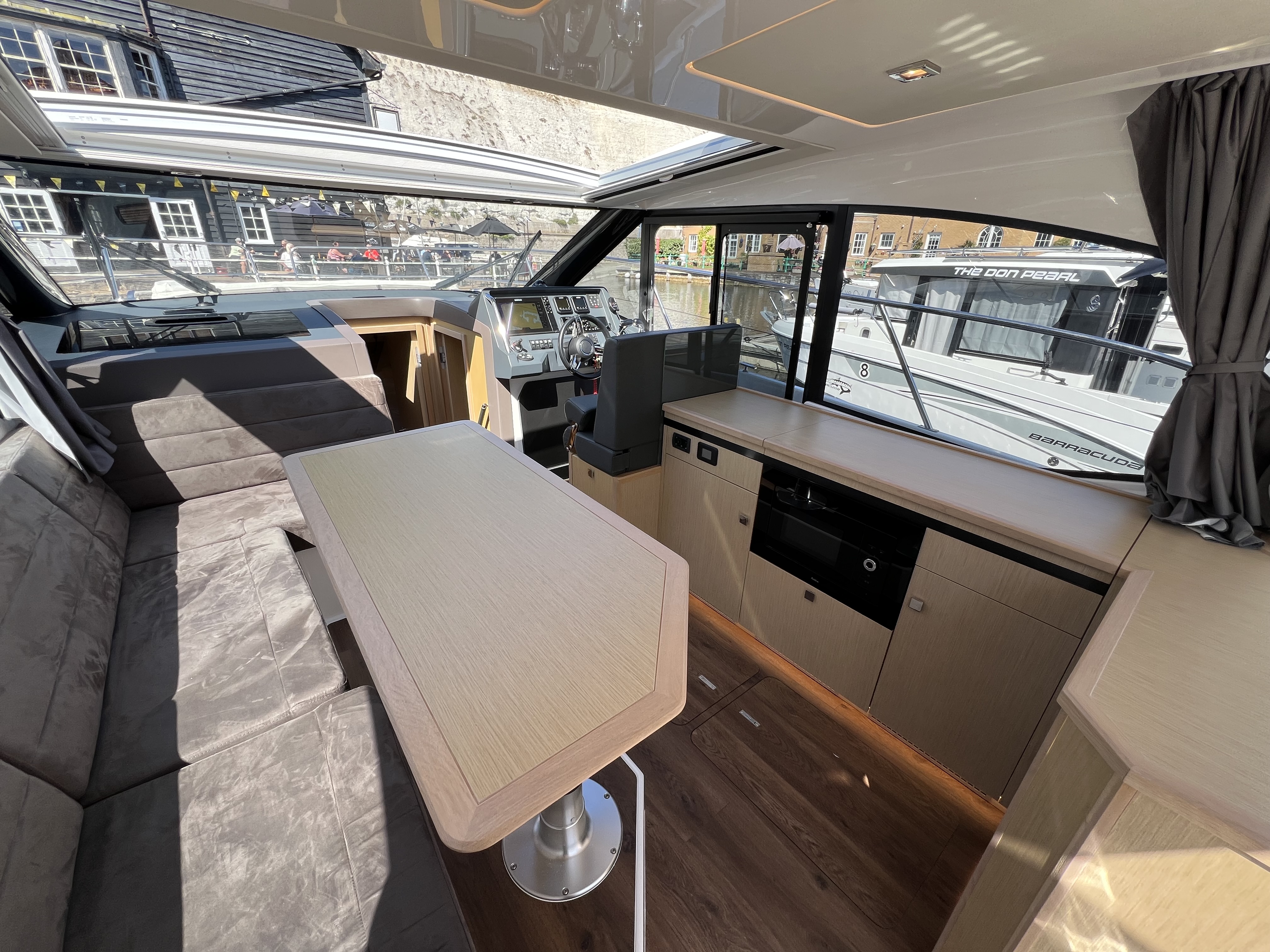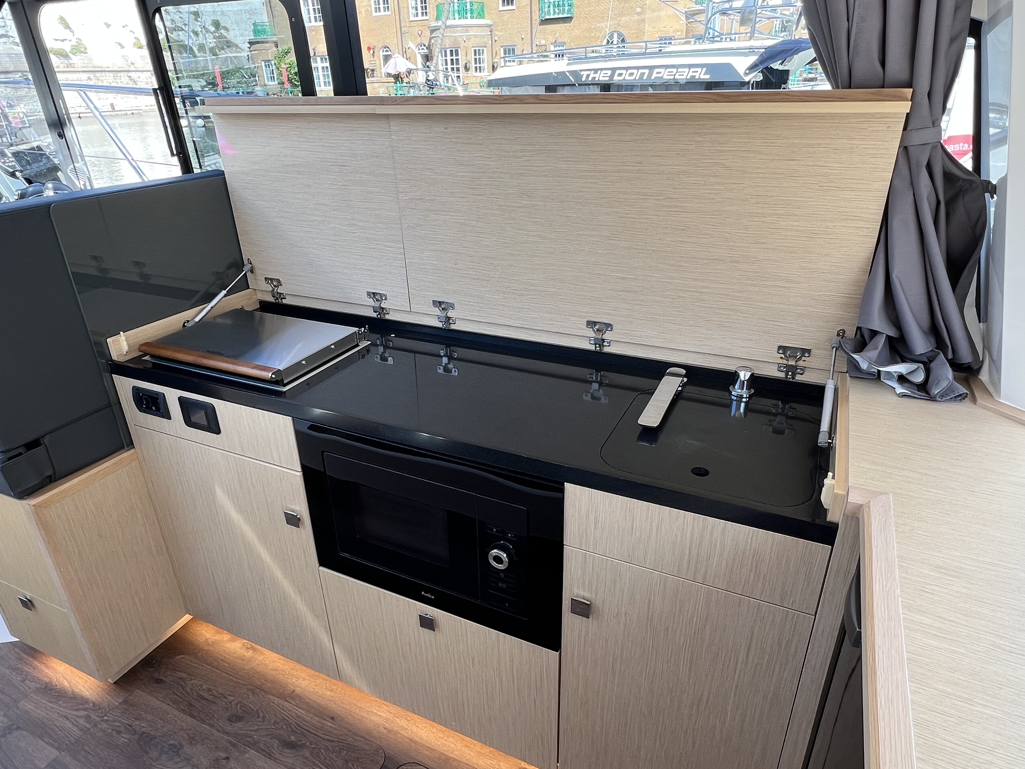 On the main deck a large seating area and galley with a drinks cooler fridge accessible from the cockpit.
