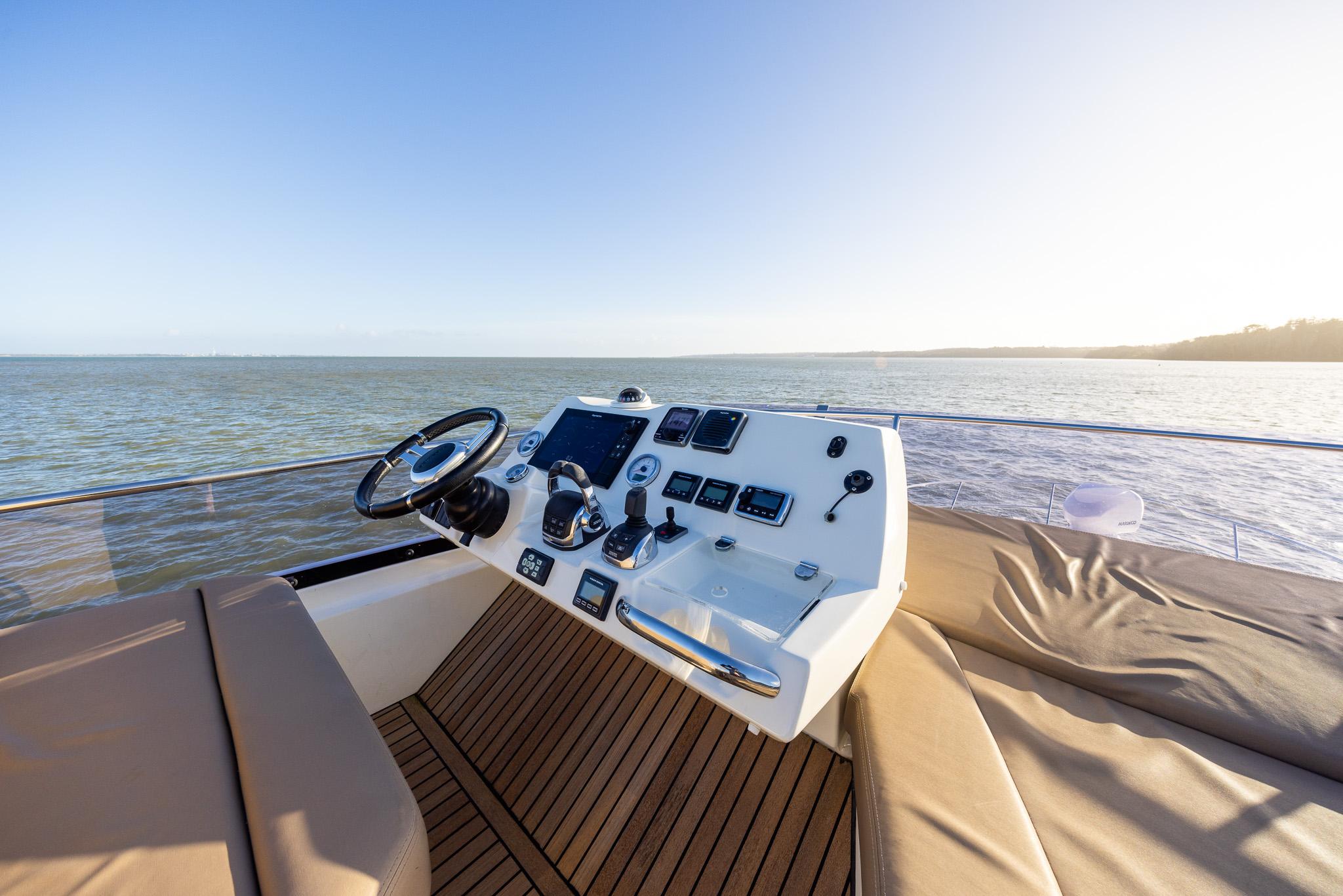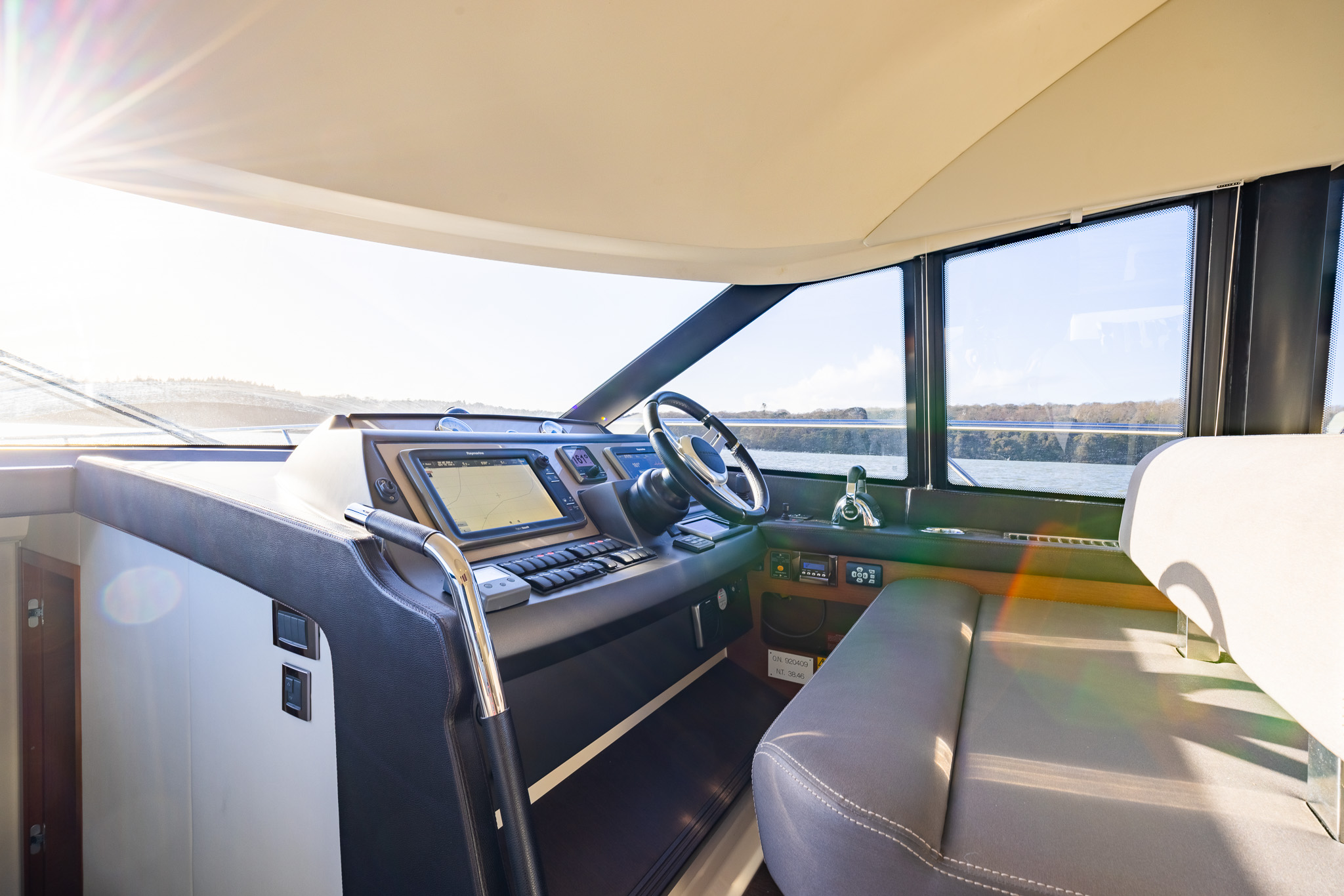 Lower helm station with double seat to port, steering wheel with throttles, joystick and bow thruster, Raymarine navigation suite, Volvo Penta engine display, trim tab controls, anchor chain counter.