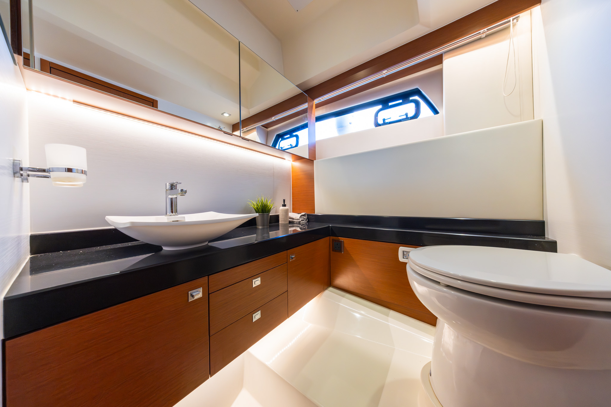 Day heads located to starboard equipped with wash basin, electric flush toilet, separate shower stall and mirror with storage.