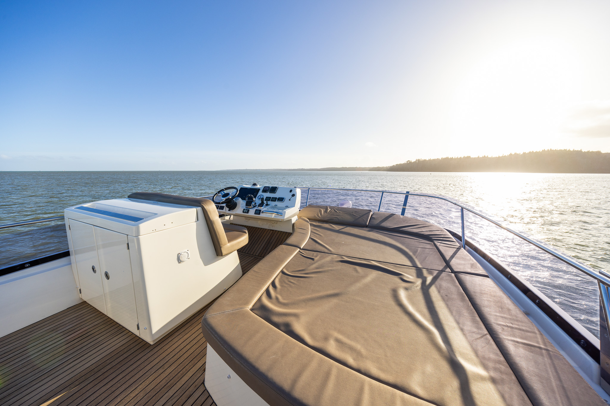 Flybridge accessed via cockpit steps, seating around solid wood table, large sun pad forward of console, wetbar with Kenyon BBQ grill and sink, top-loading cool box, Upper helm station with double seat, mirrored controls including joystick and bow thruster, Raymarine electronics suite.