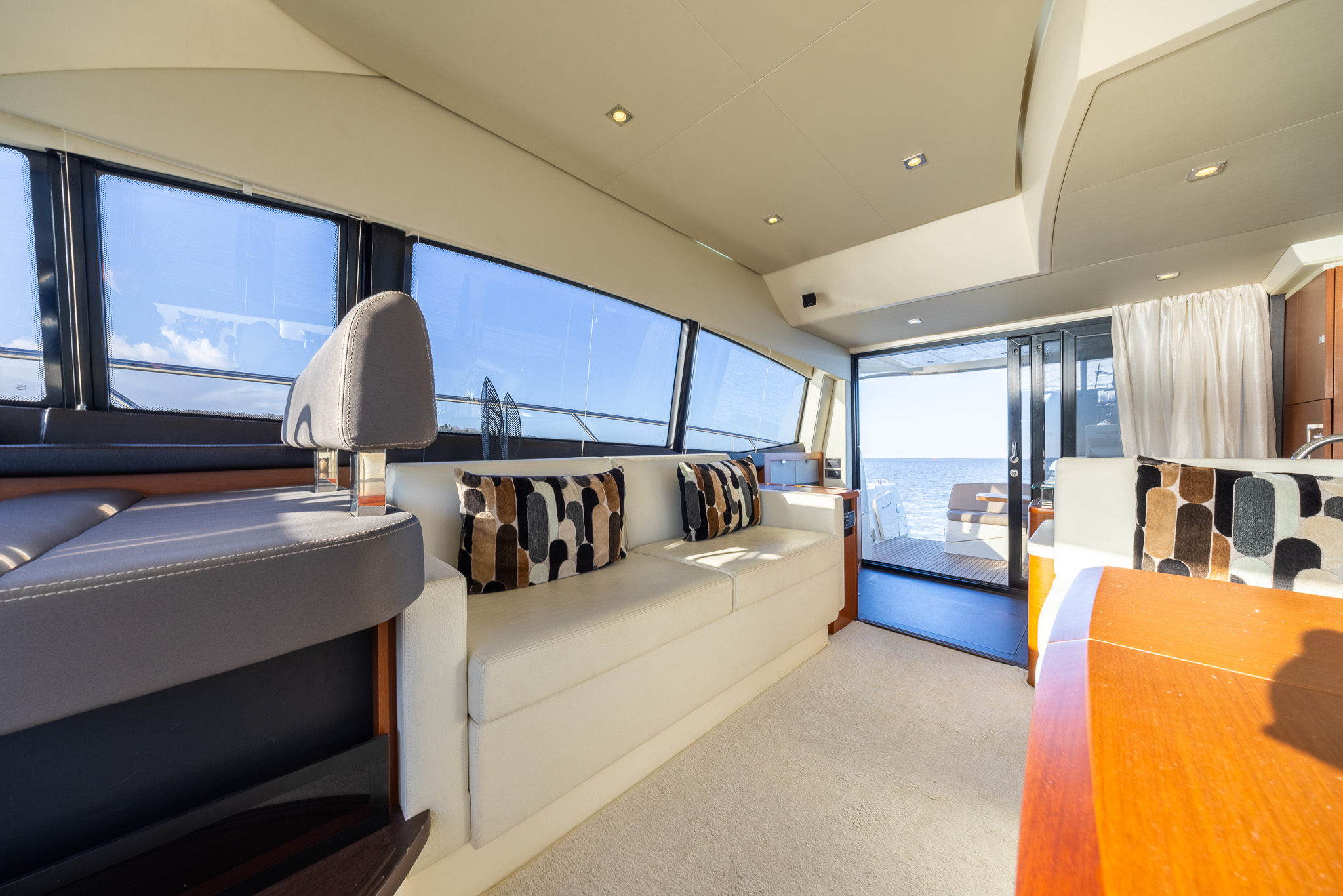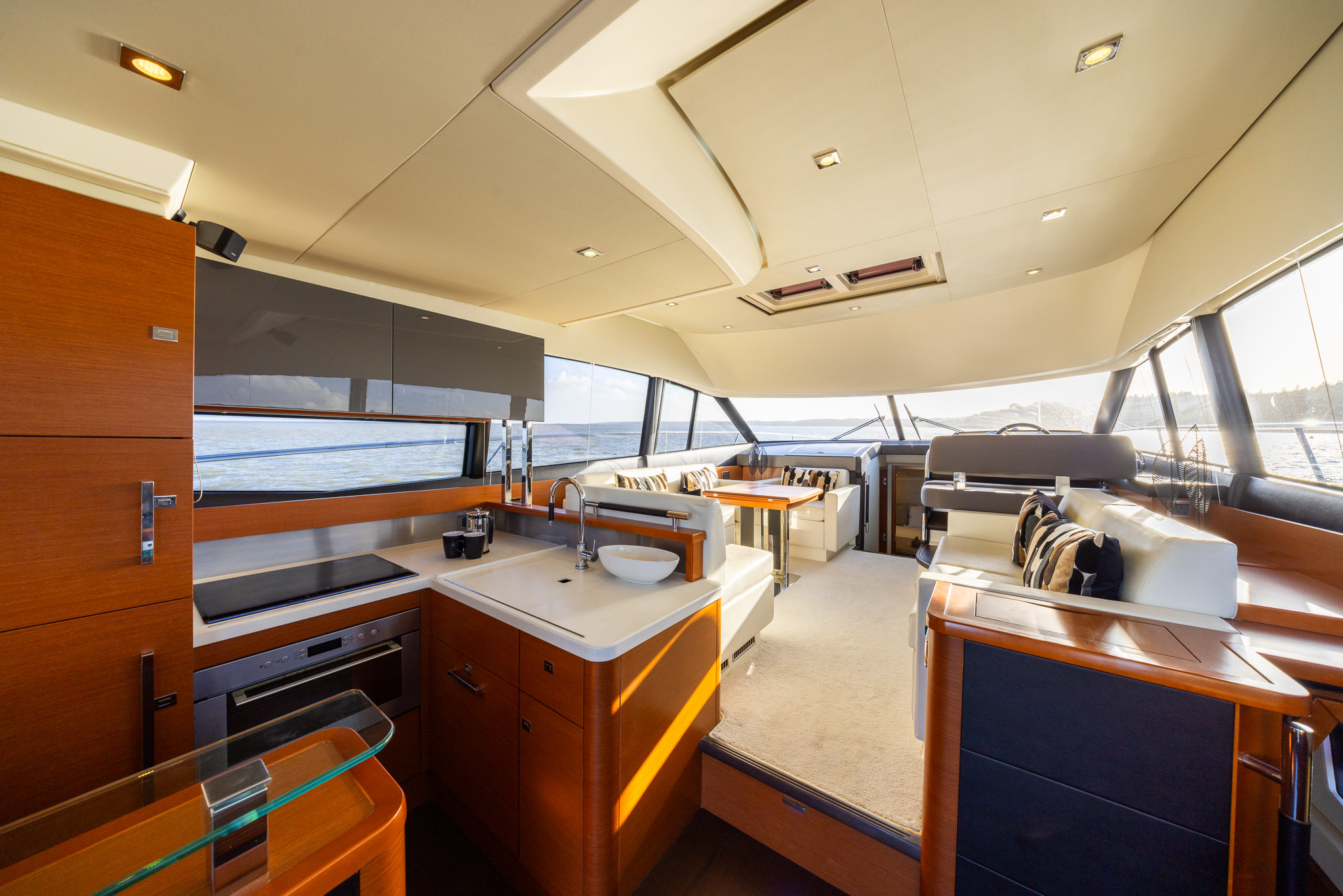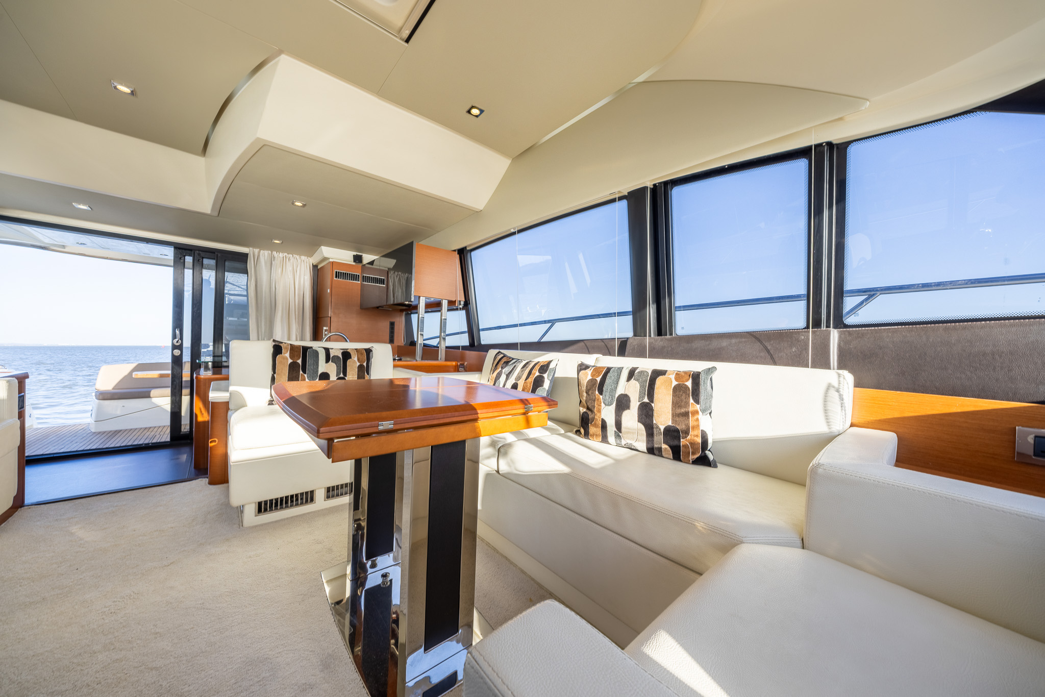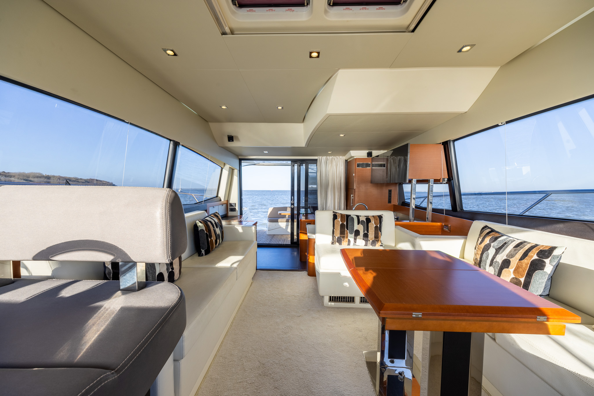 Comfortable seating around a central fold out table with folding leaves, retractable LED TV, Fusion entertainment system with Bose speakers, electrically opening windows to port and starboard, sky light with blinds and blinds to side windows.
