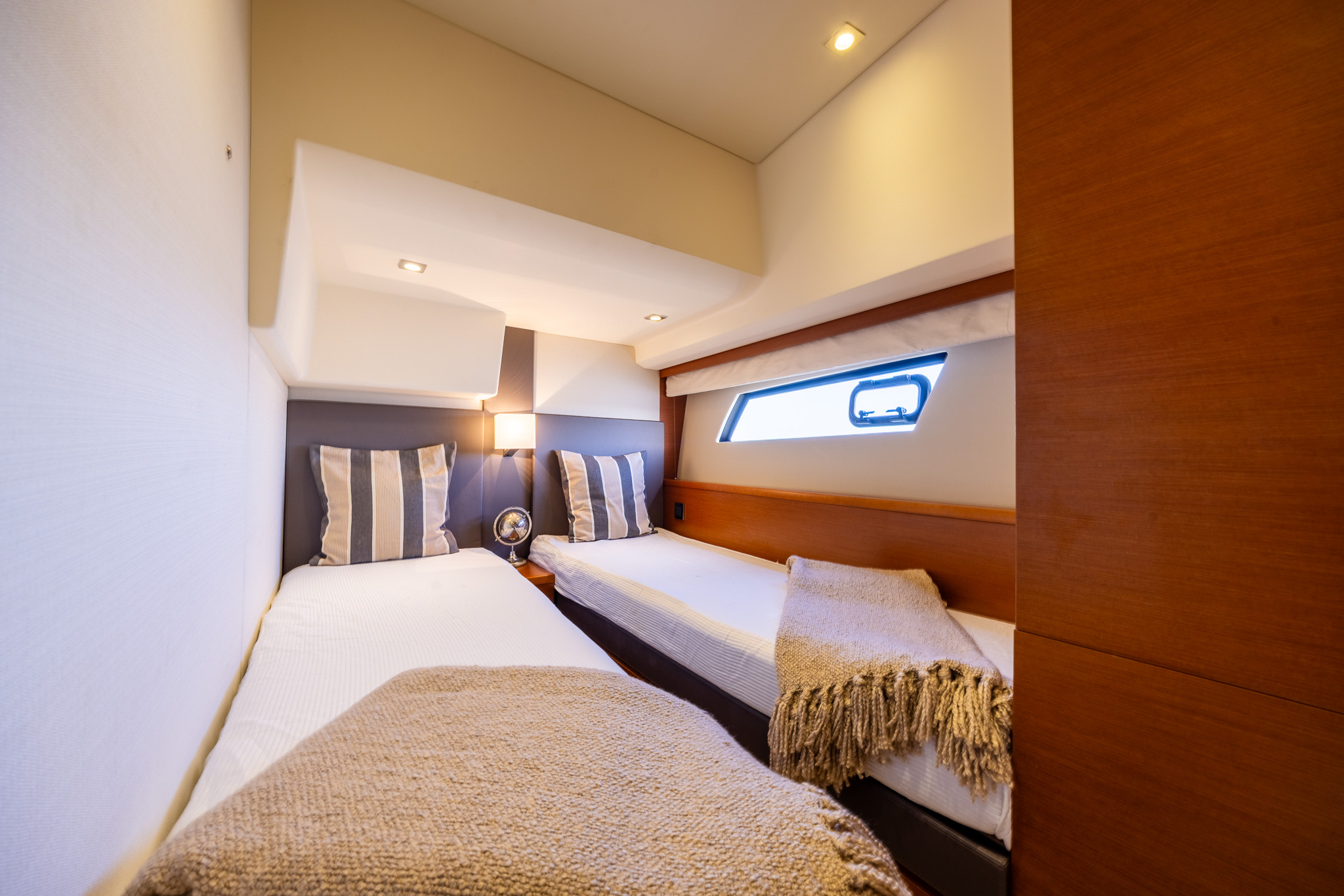 Second guest cabin to port with twin single berths that can convert to a double, under bed storage, large hanging locker and large hull window.