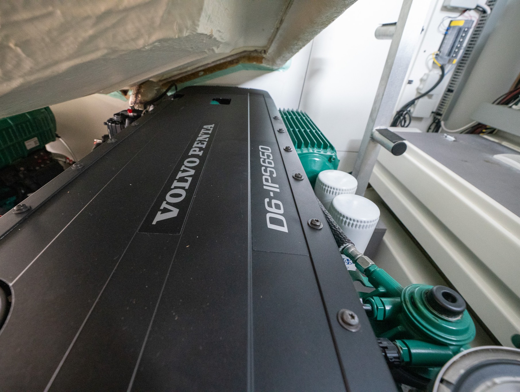 Fitted with the upgraded twin Volvo Penta IPS650 480hp engines to pod drives, she is a joy to handle, both at close quarters and underway.