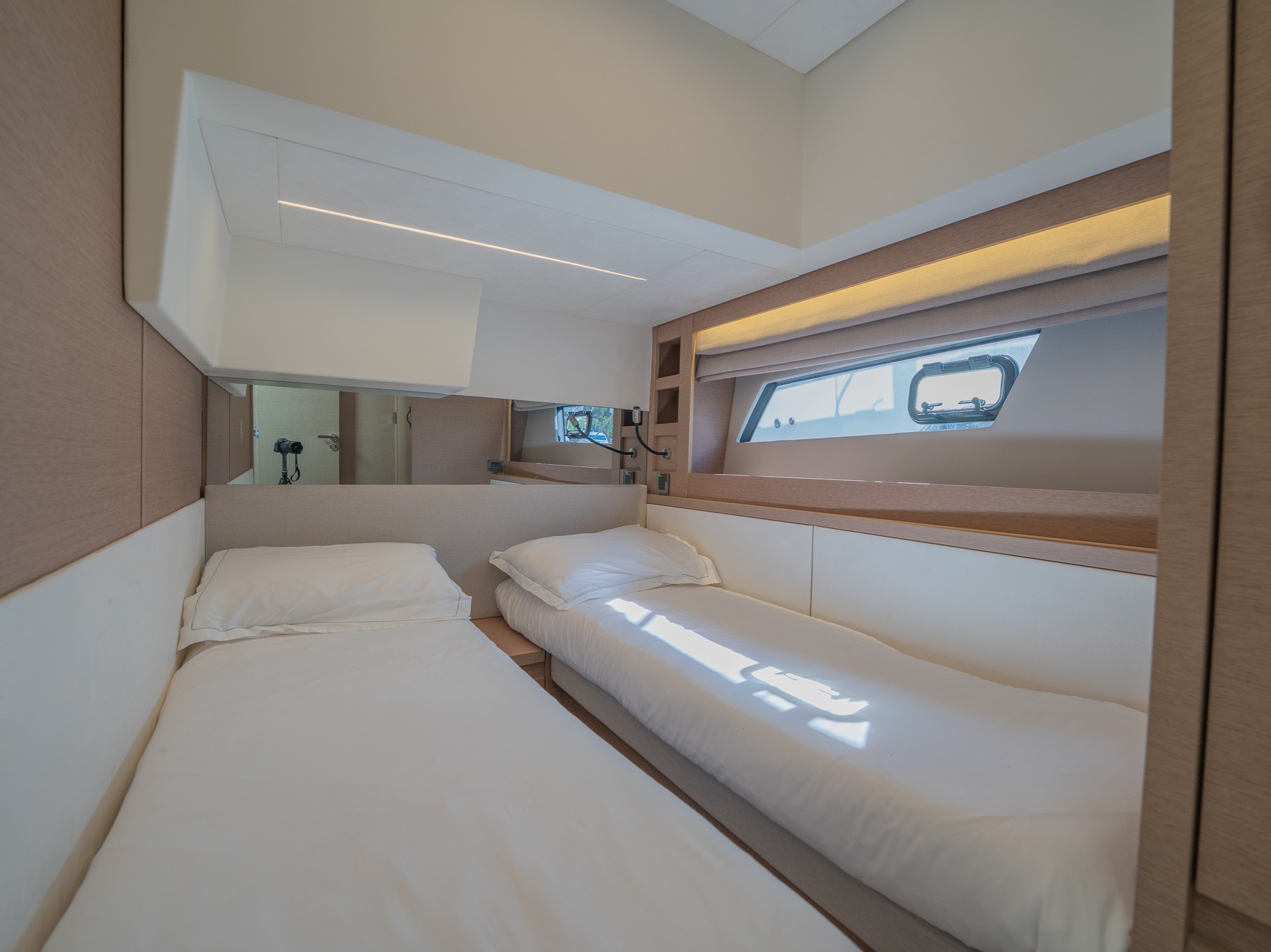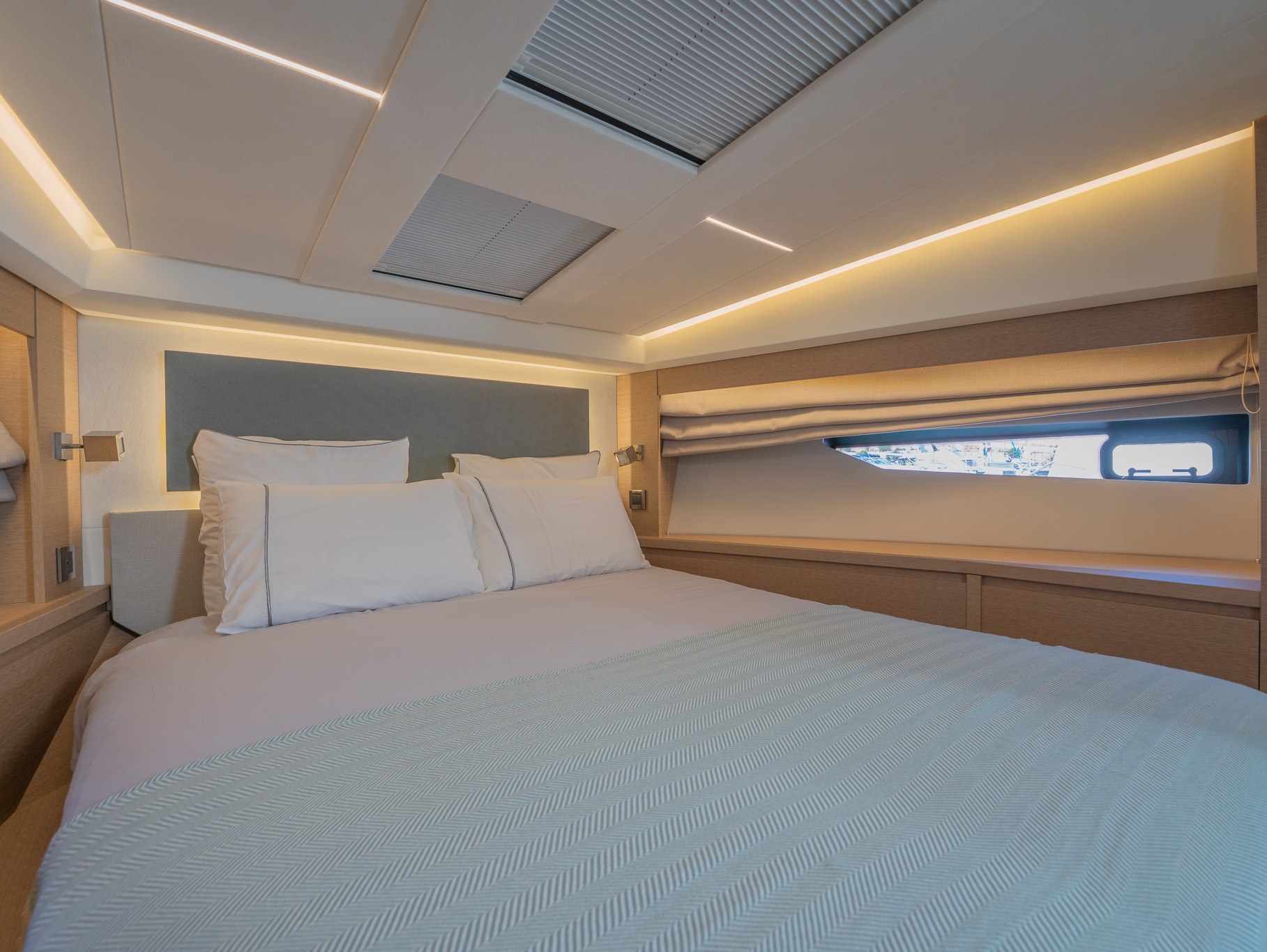 Full beam master stateroom with separate access, island berth, sofa, ample storage including hanging storage. Attached to ensuite master heads with electric toilet, separate shower and washbasin.