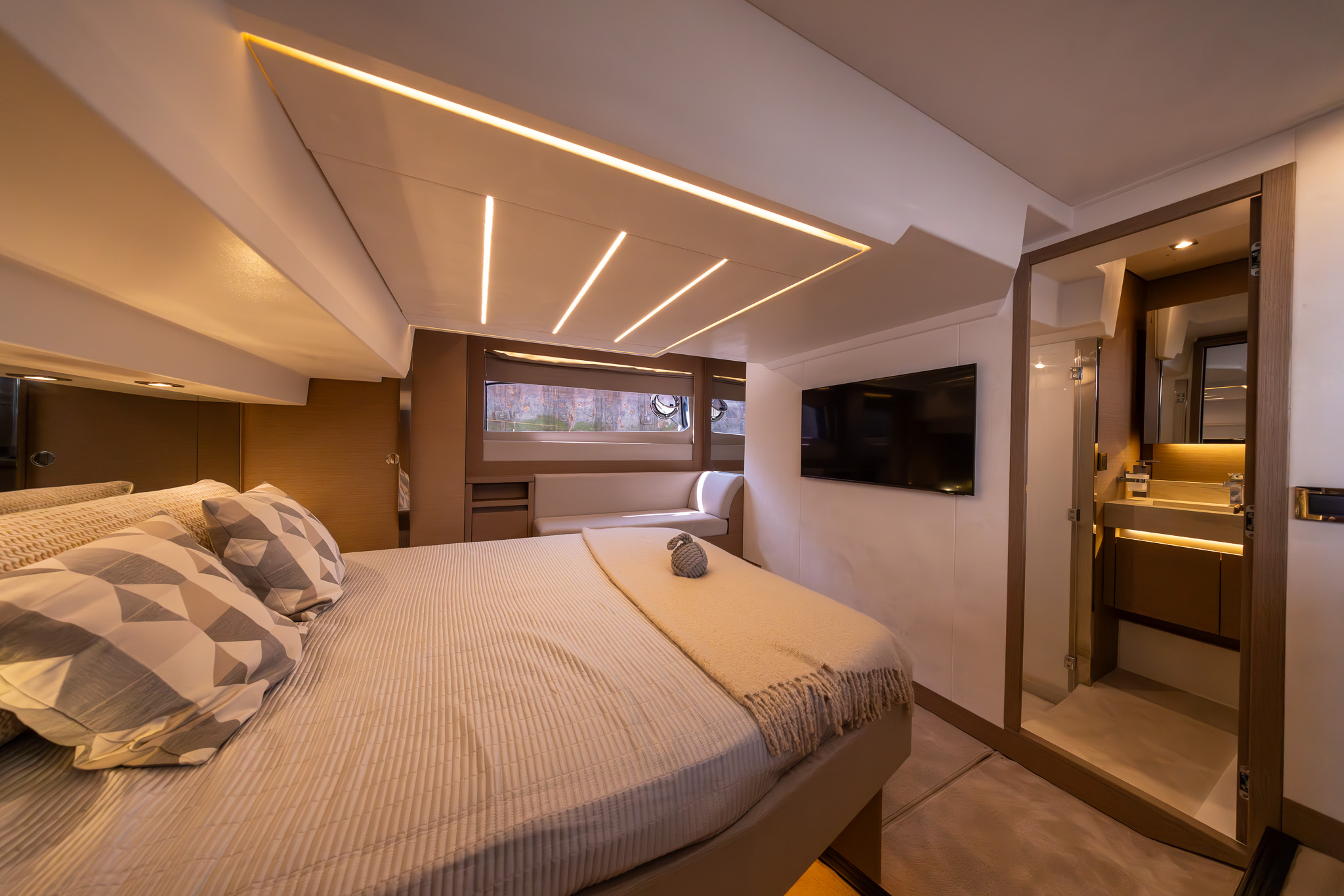 Full beam master stateroom amidships with separate access. Island berth with inner sprung mattress, sofa and ample storage including hanging space