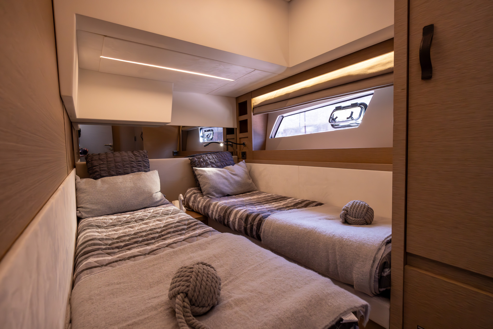 VIP guest cabin forward with double berth (scissor bed for twin berths option) with storage