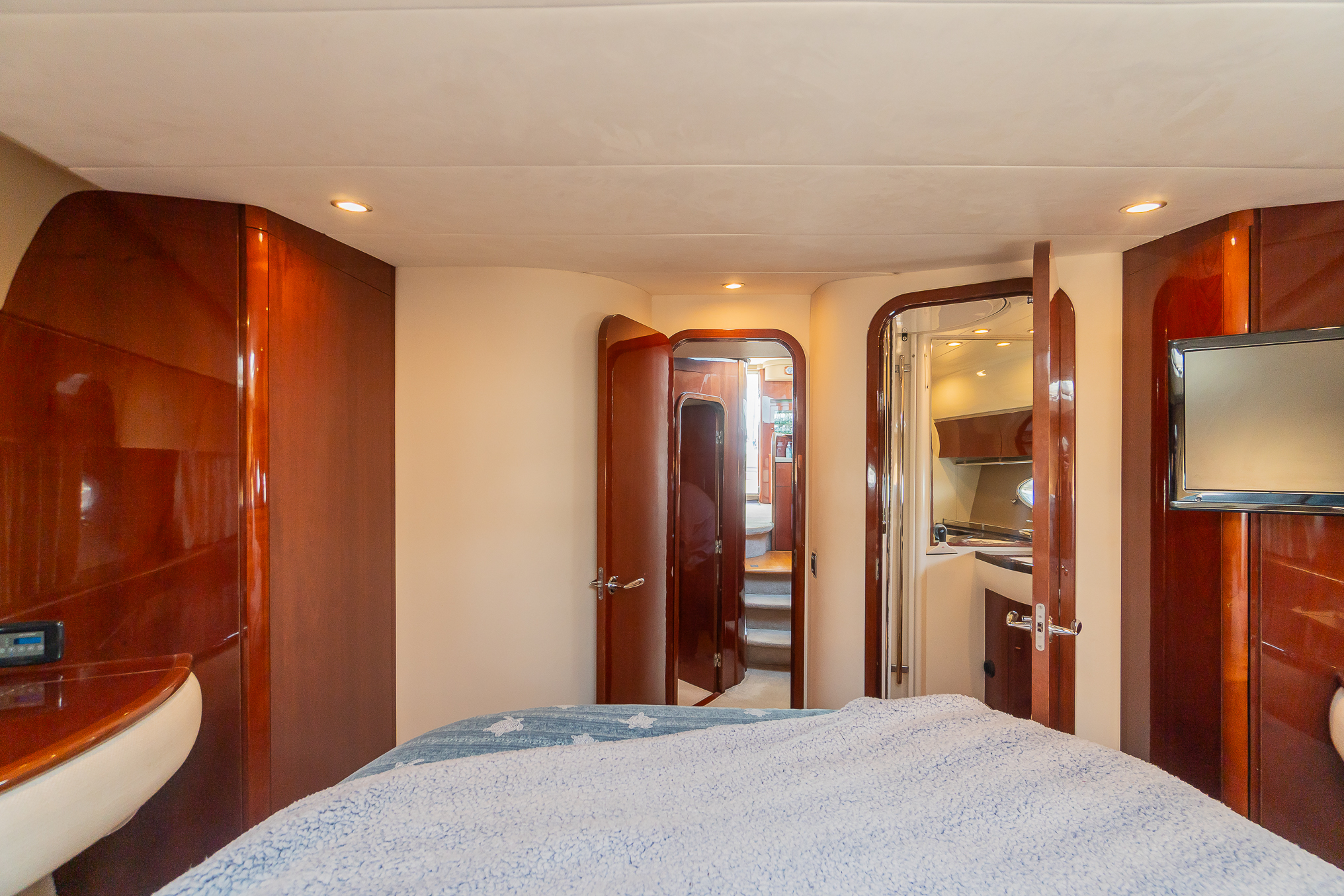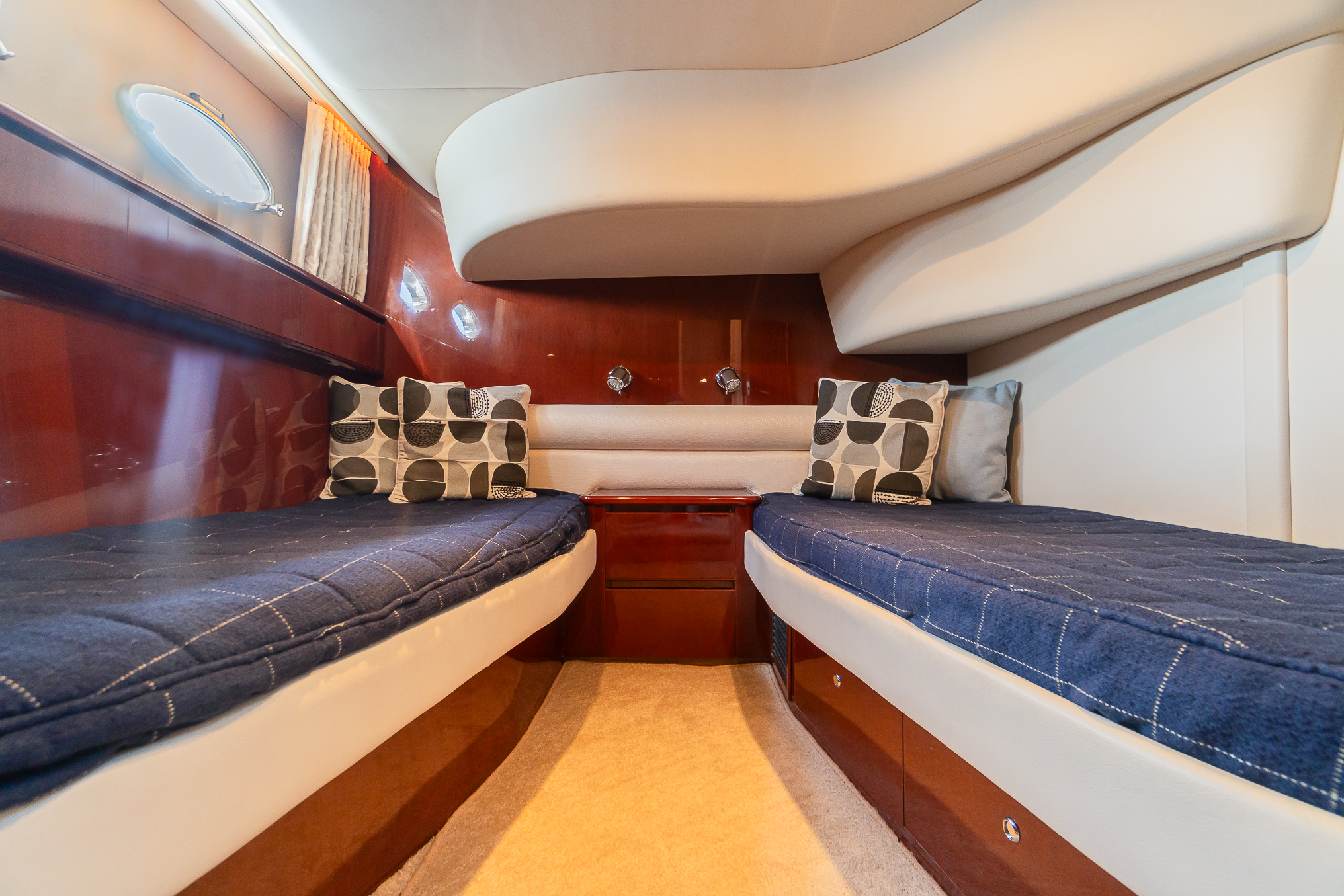 Spacious VIP Guest cabin to starboard with twin berths, storage and ensuite access to the day heads
