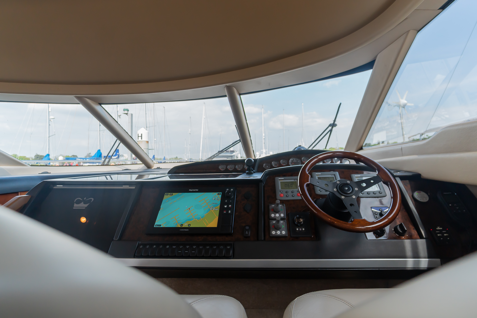 Powered by twin Volvo Penta D9 575hp engines she cruises comfortable and is easily manoeuvred in marinas with bow and stern thrusters. Her extensive specification includes air conditioning, heating, Raymarine Axiom chart plotters to both helms and a 7kW generator.