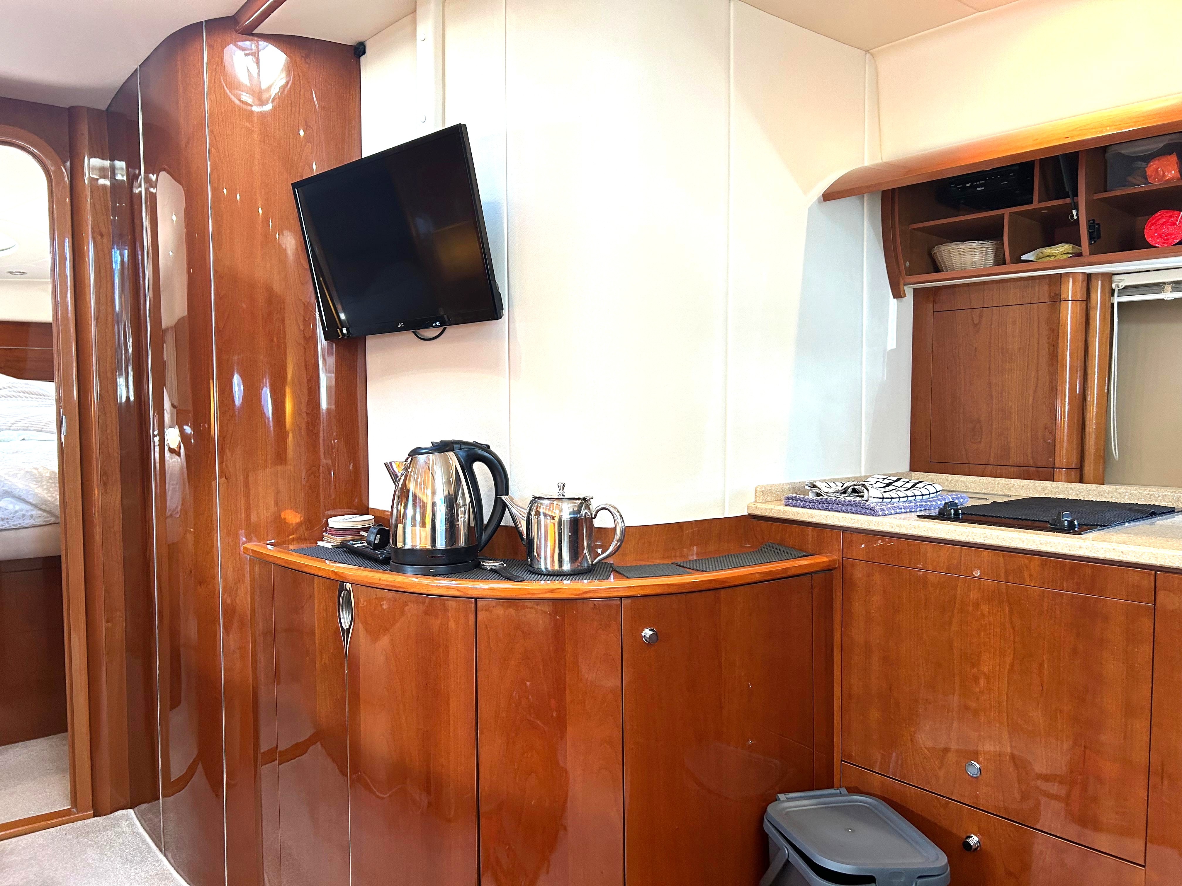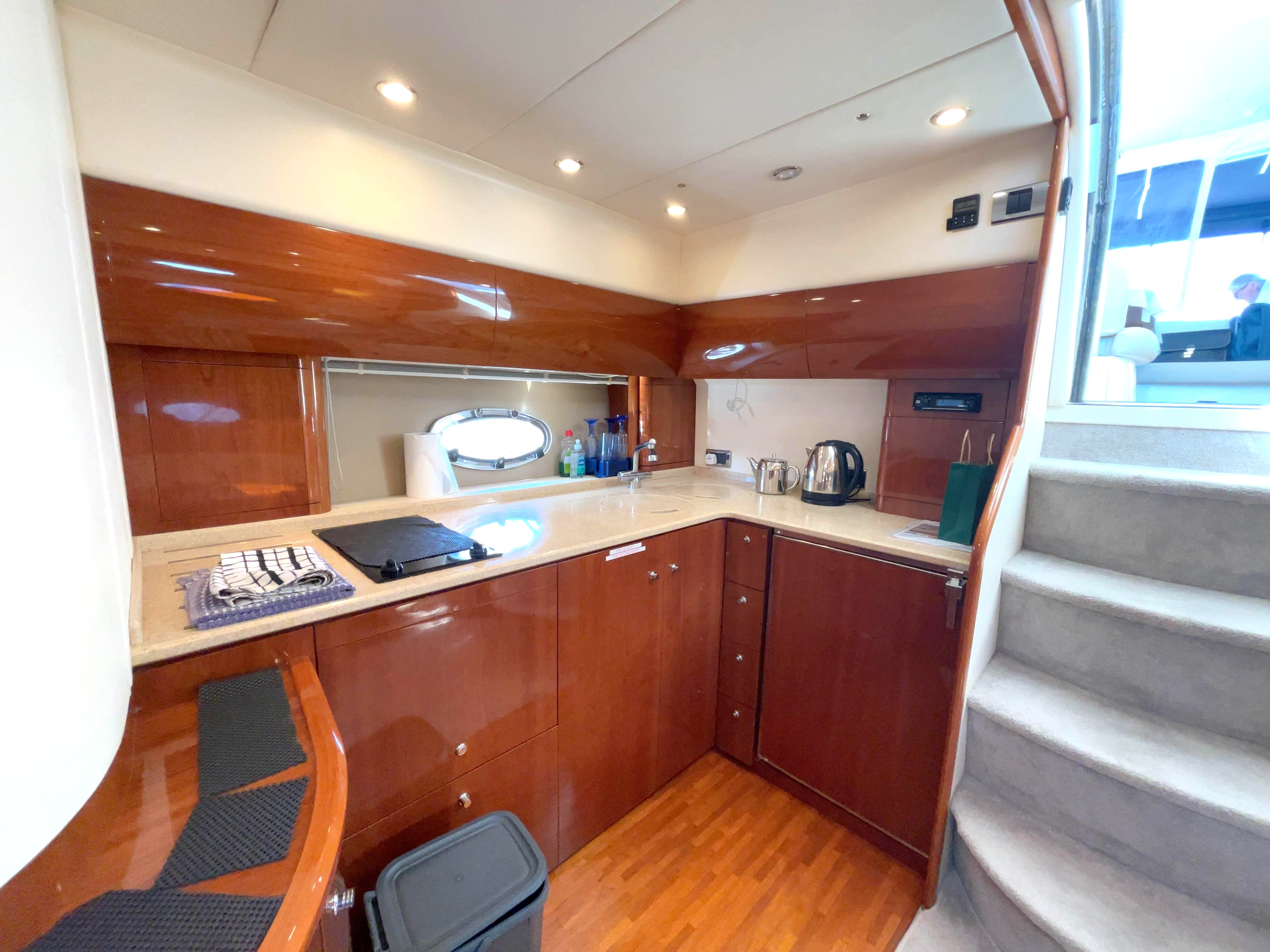 Saloon has a large u-shaped seating arrangement in beautifully stitched cream leather which is situated port-side opposite the well-appointed galley and Smart TV and AV system. The dining table allows this area to convert to a double berth.