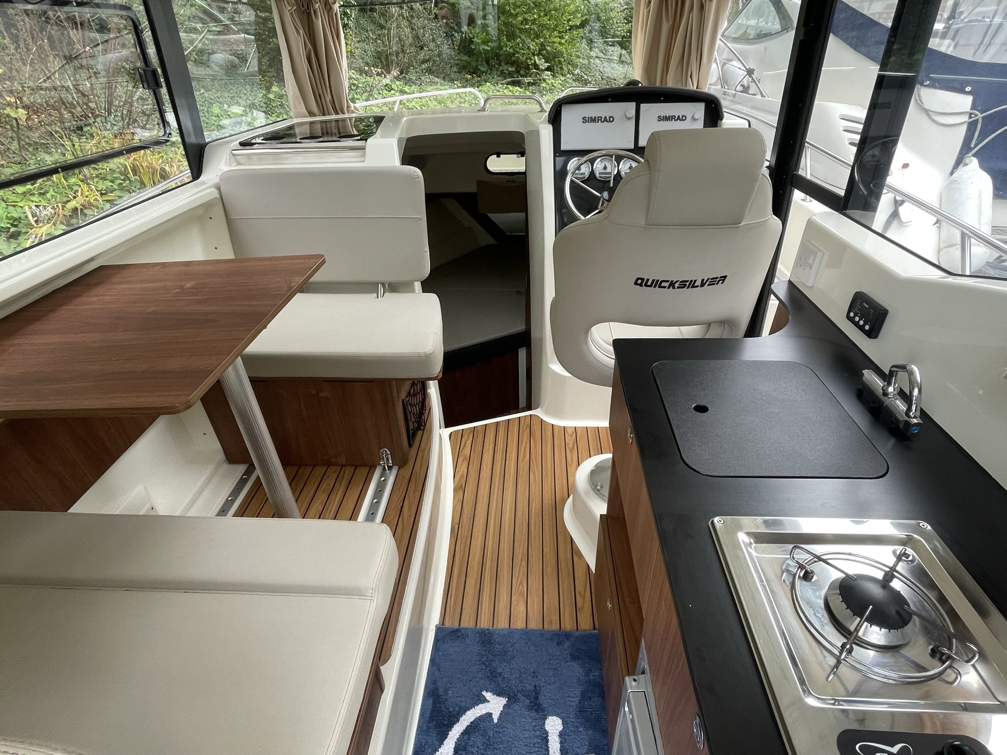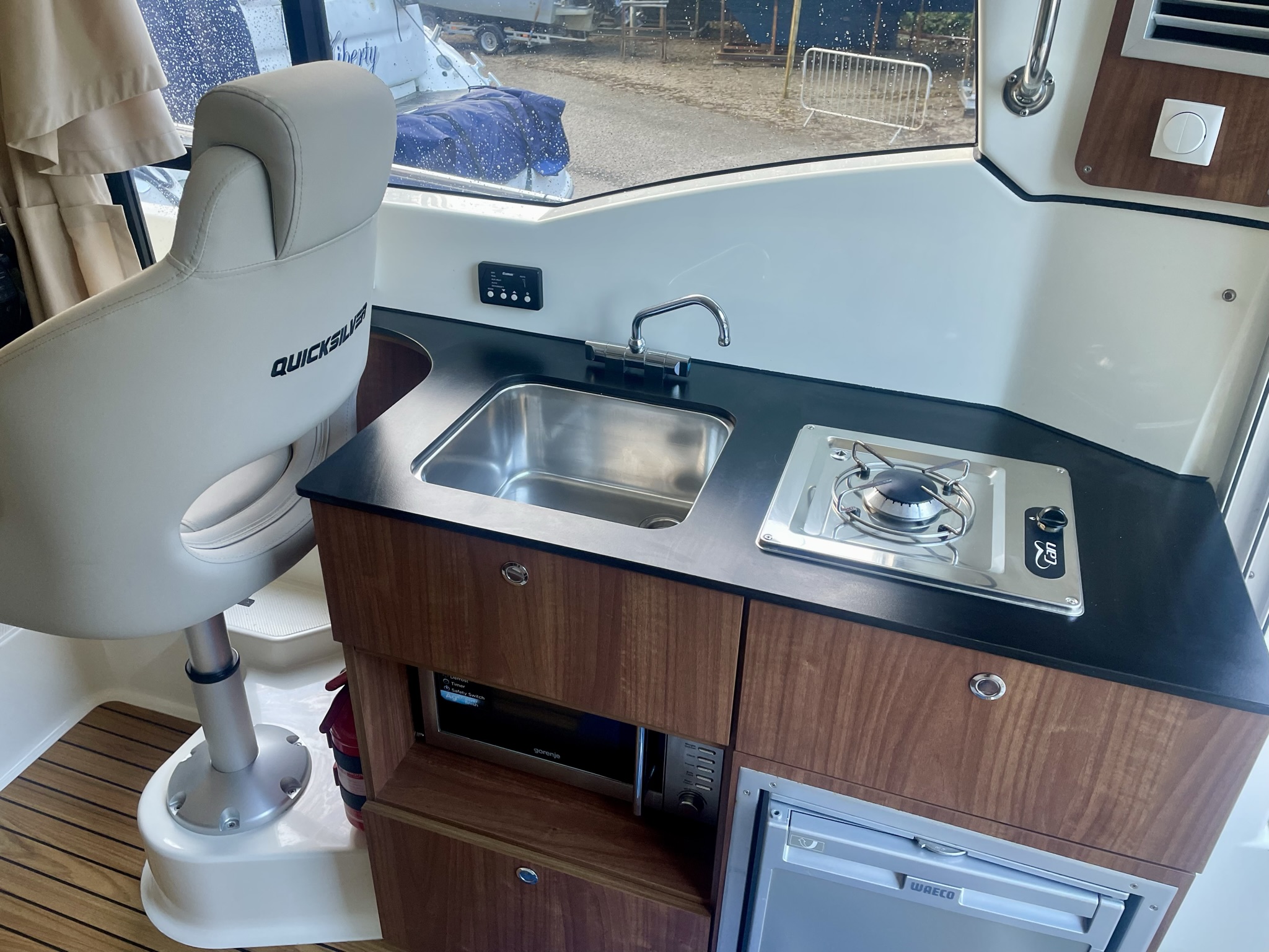 Galley positioned behind helm is equipped with single gas hob, 12v fridge, sink and tap & storage
