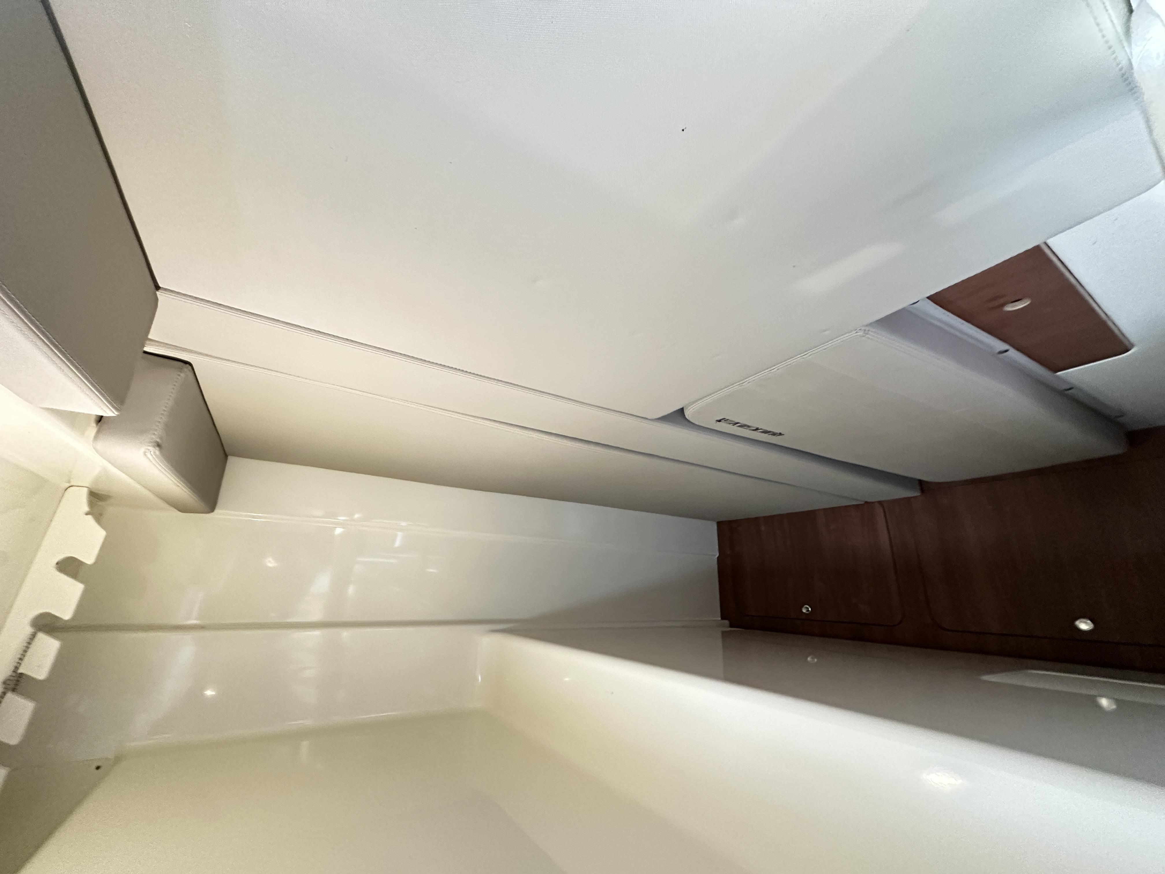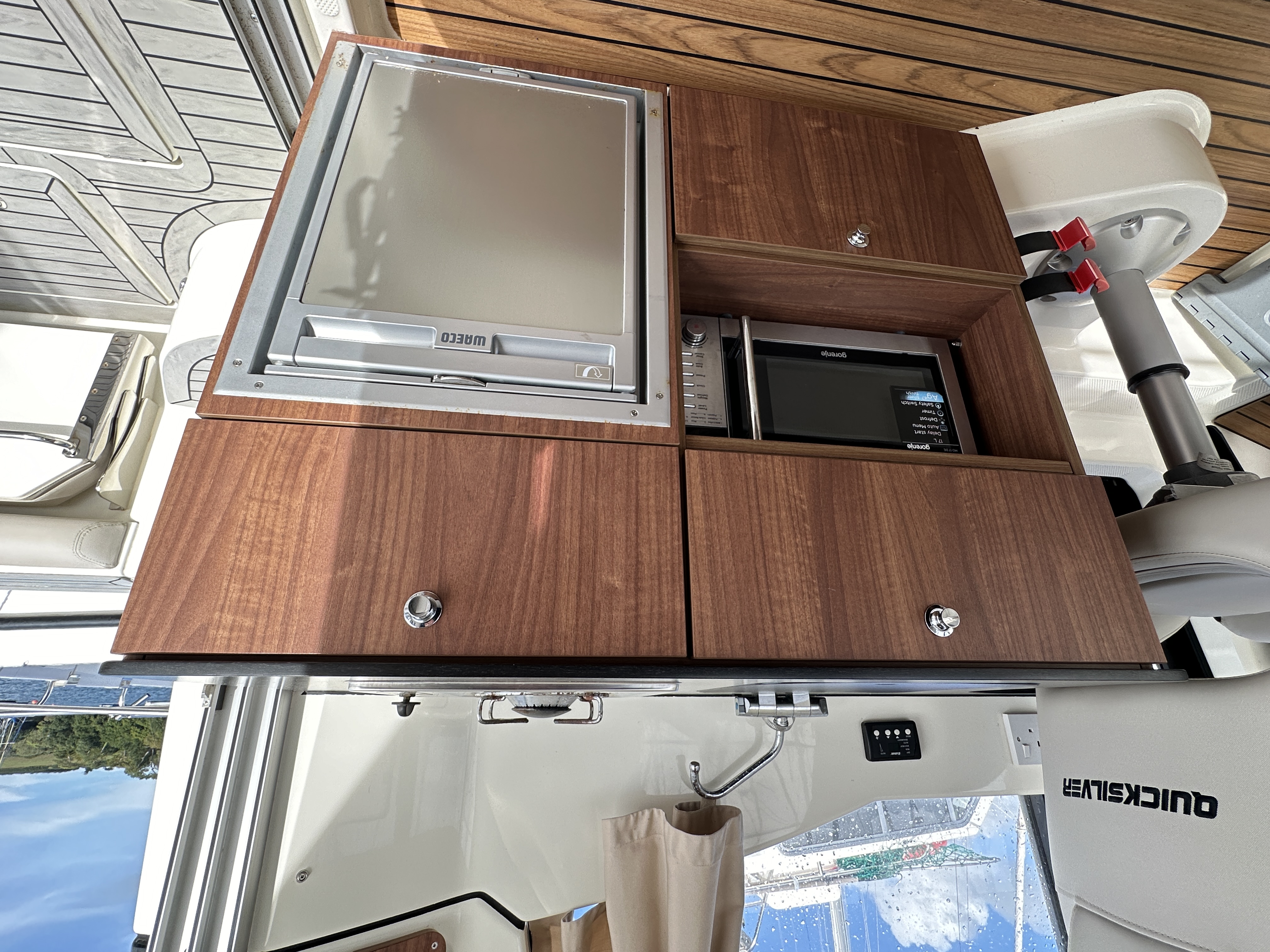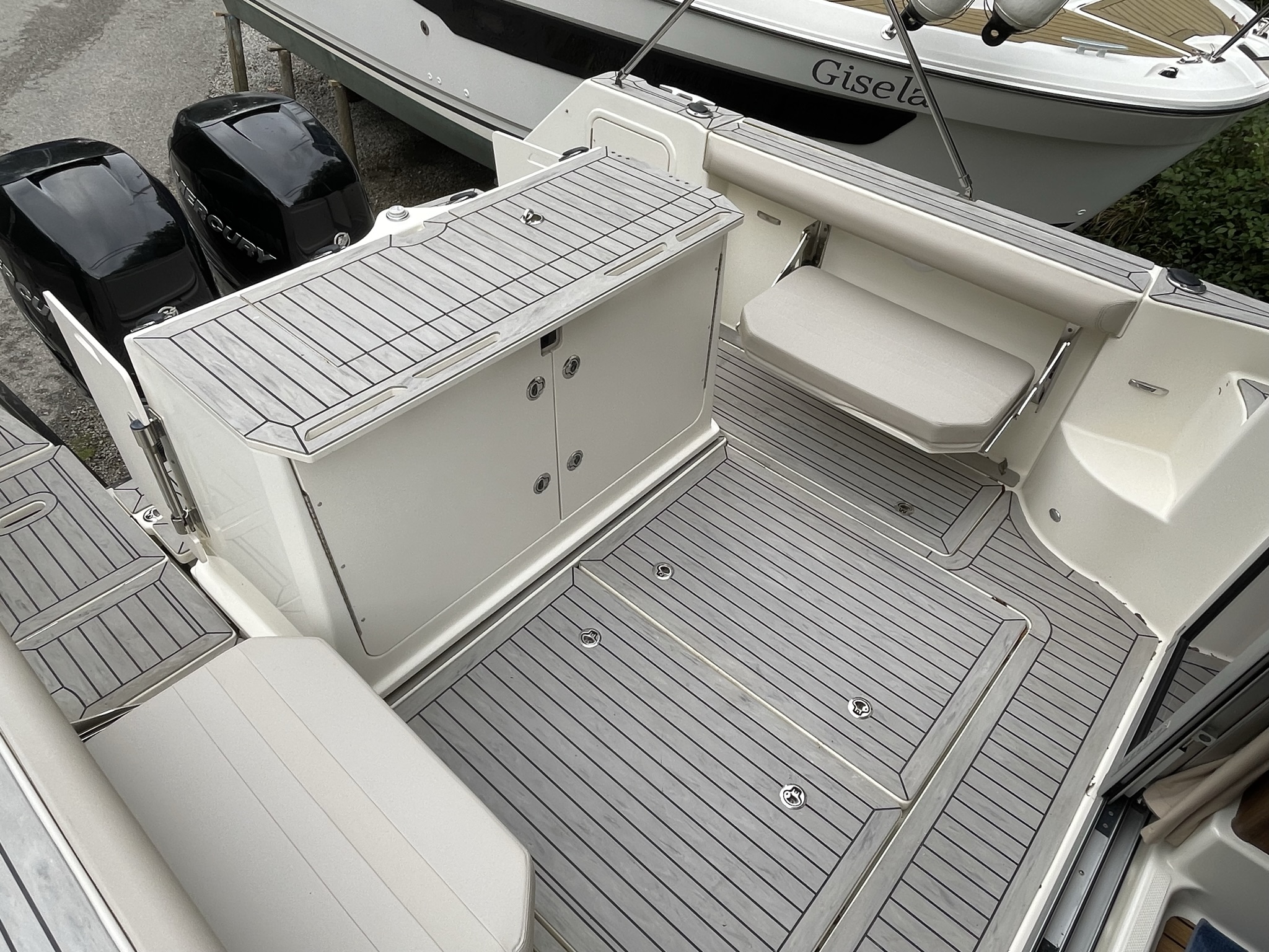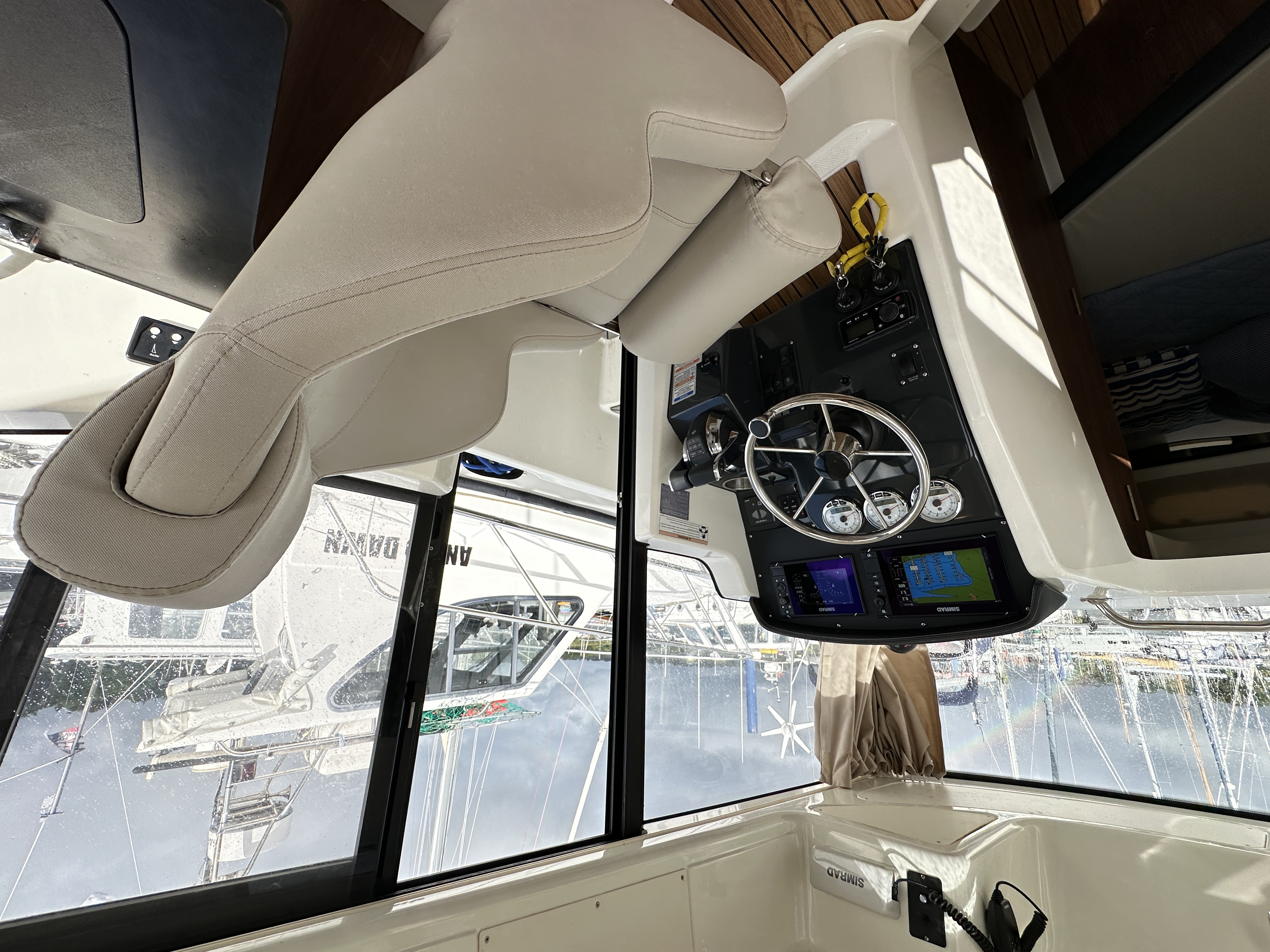 The days you had to choose between comfort and performance, between fishing and cruising are gone. With the 905 Pilothouse you can have both! Designed without compromise for fishing, adventure & fun, and all in perfect safety and comfort. The 905 Pilothouse is suited for offshore cruising and carries up to 10 people. It features a comprehensive fishing station, live bait tank, rod racks, a complete enclosed canvas, swimming platform extension, fridge, microwave oven, bow thruster, electric windlass, holding tank, Simrad plotter, GPS, VHF, radar and more.