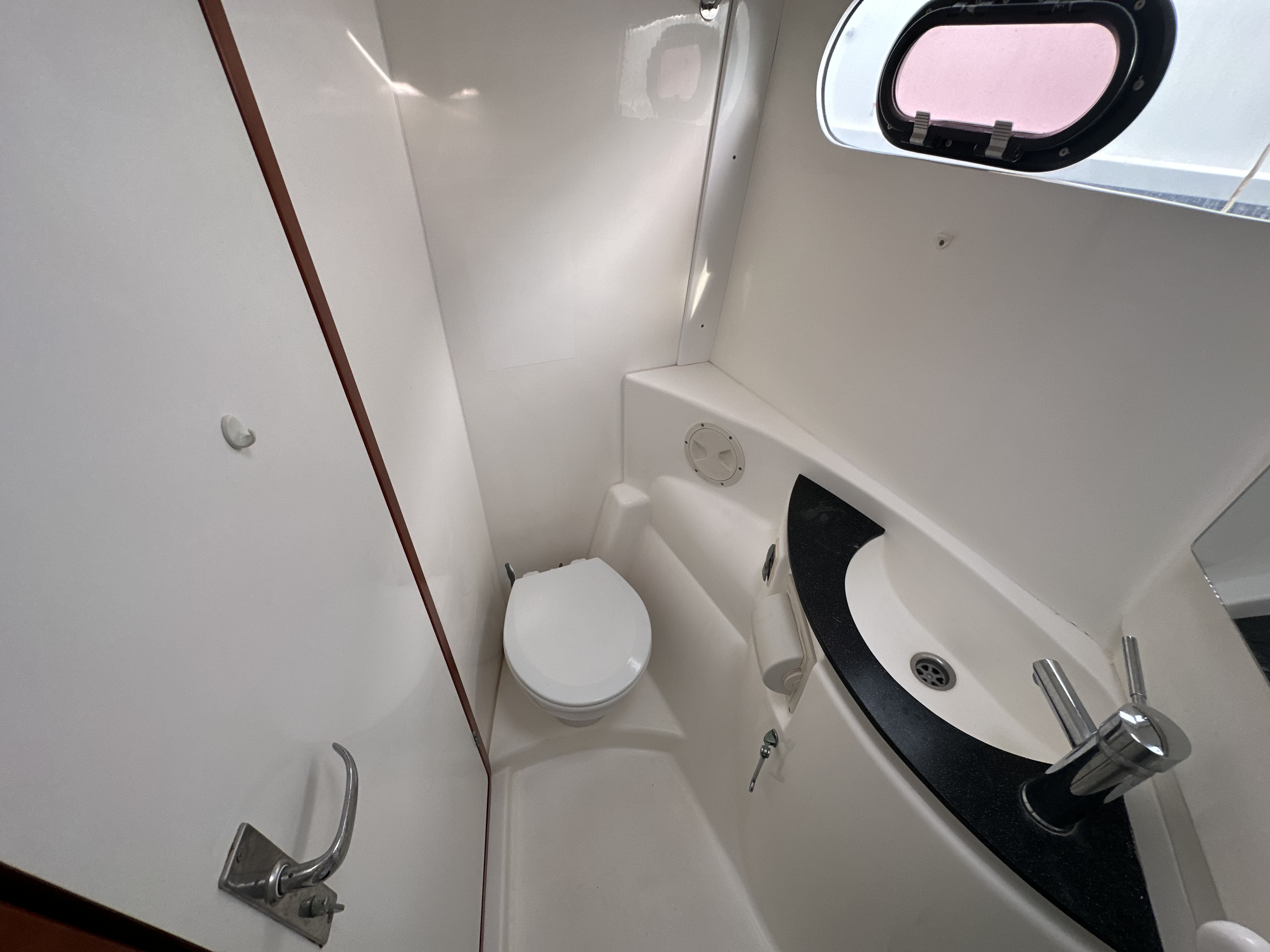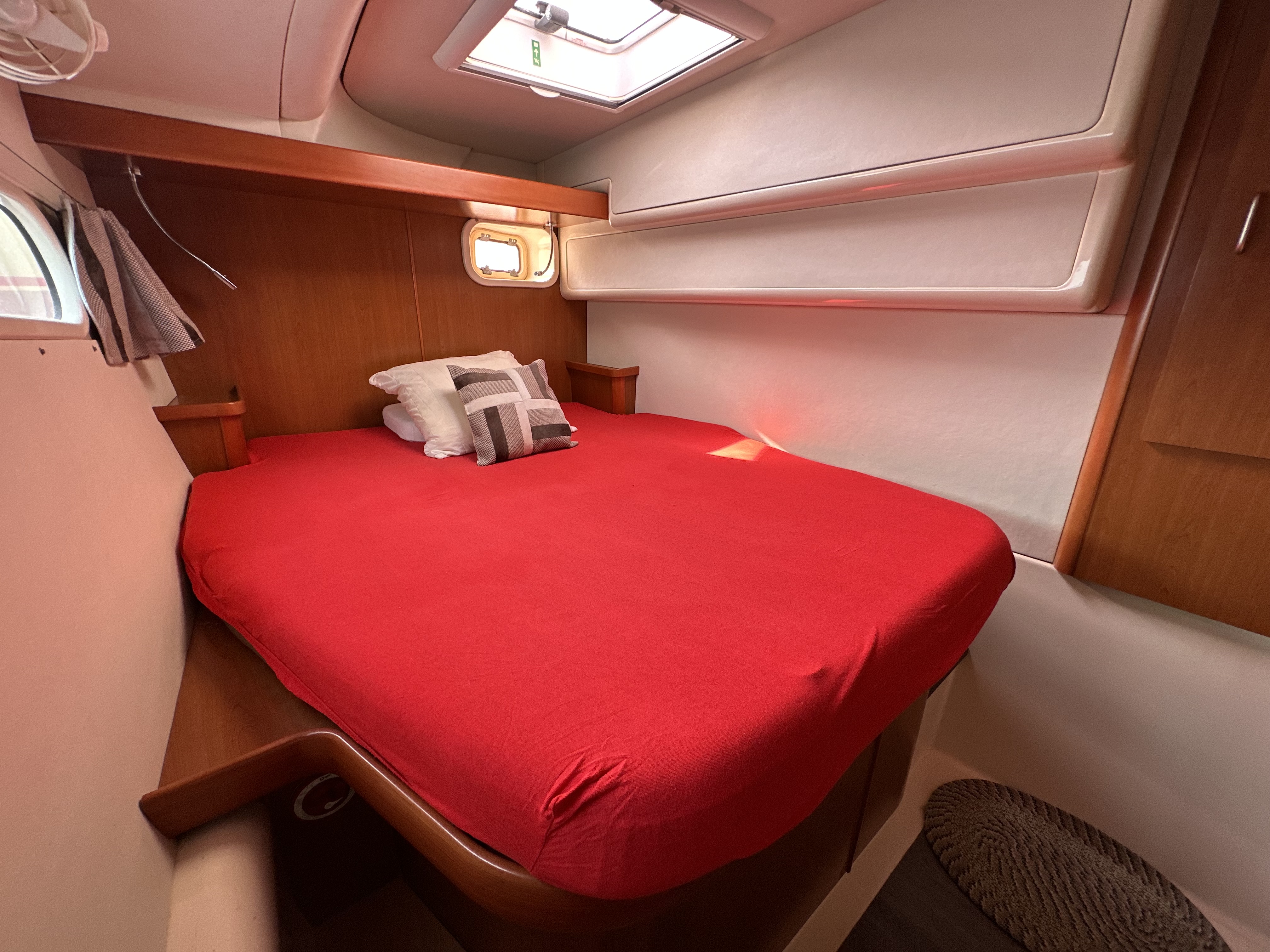 The galley to starboard is very well equipped and practical and comes with an FORCE 10 three-burner stainless stell stove with grill, double fridge below the electrical panel, microwave oven ESSENTIEL B, twin stainless steel sinks with mixer tape and plenty of work surfaces.