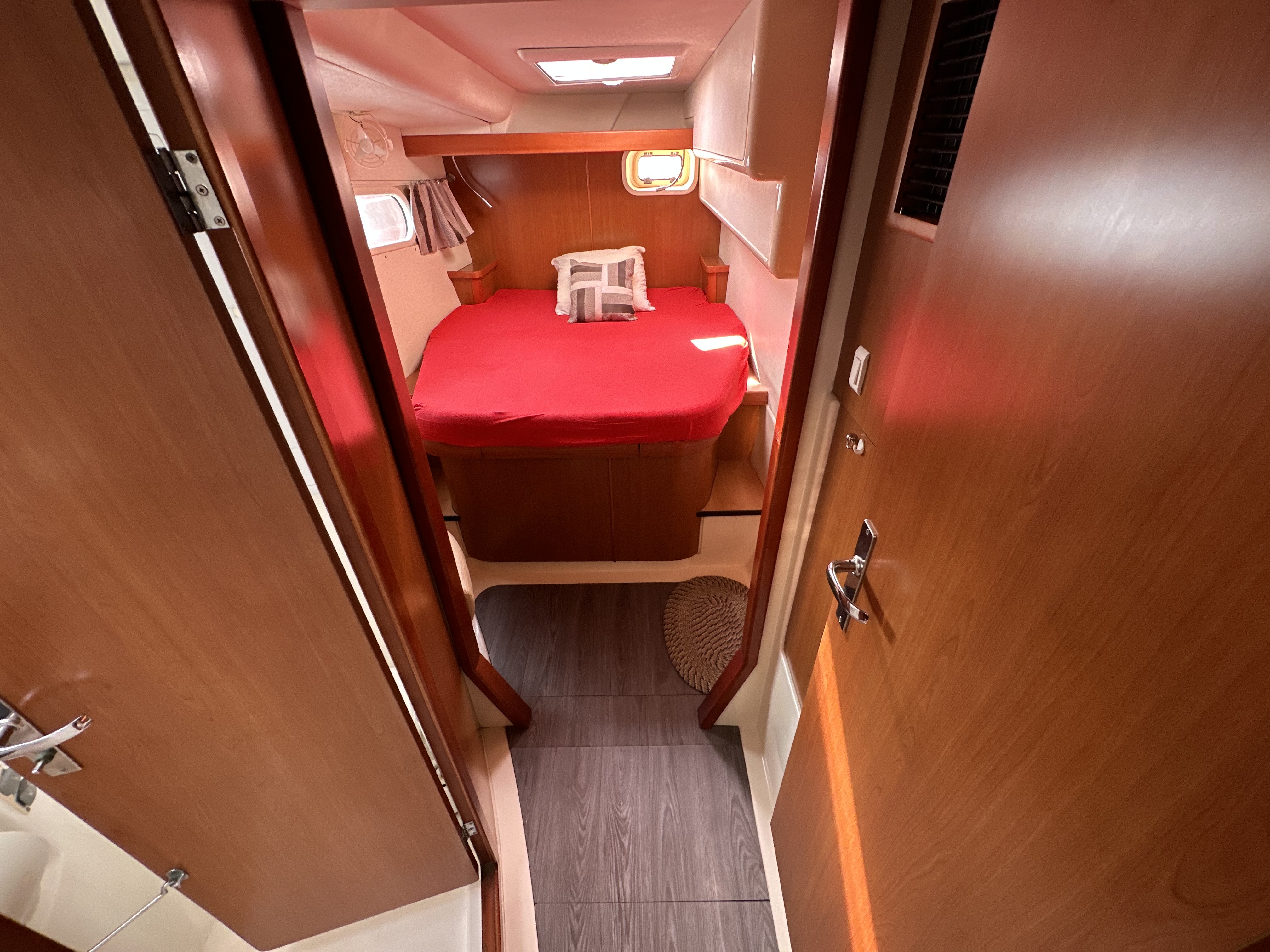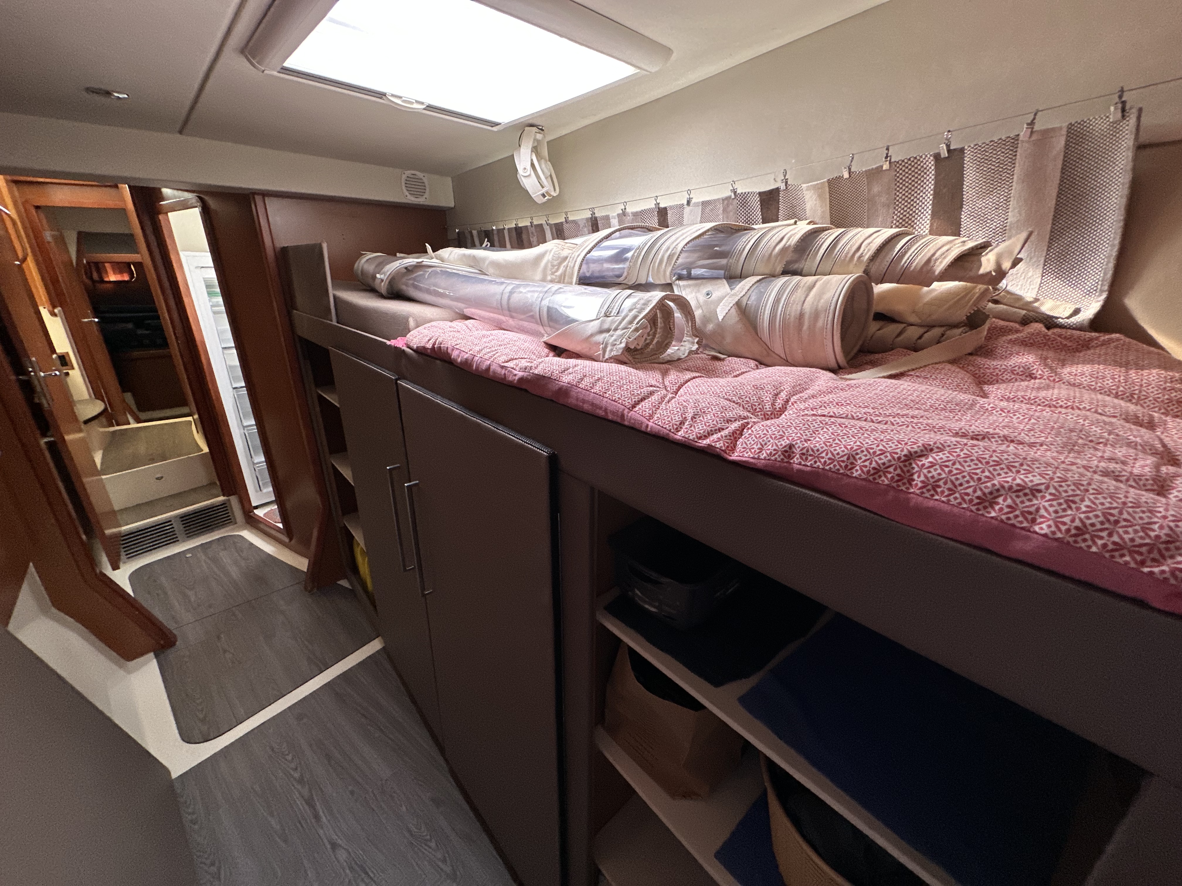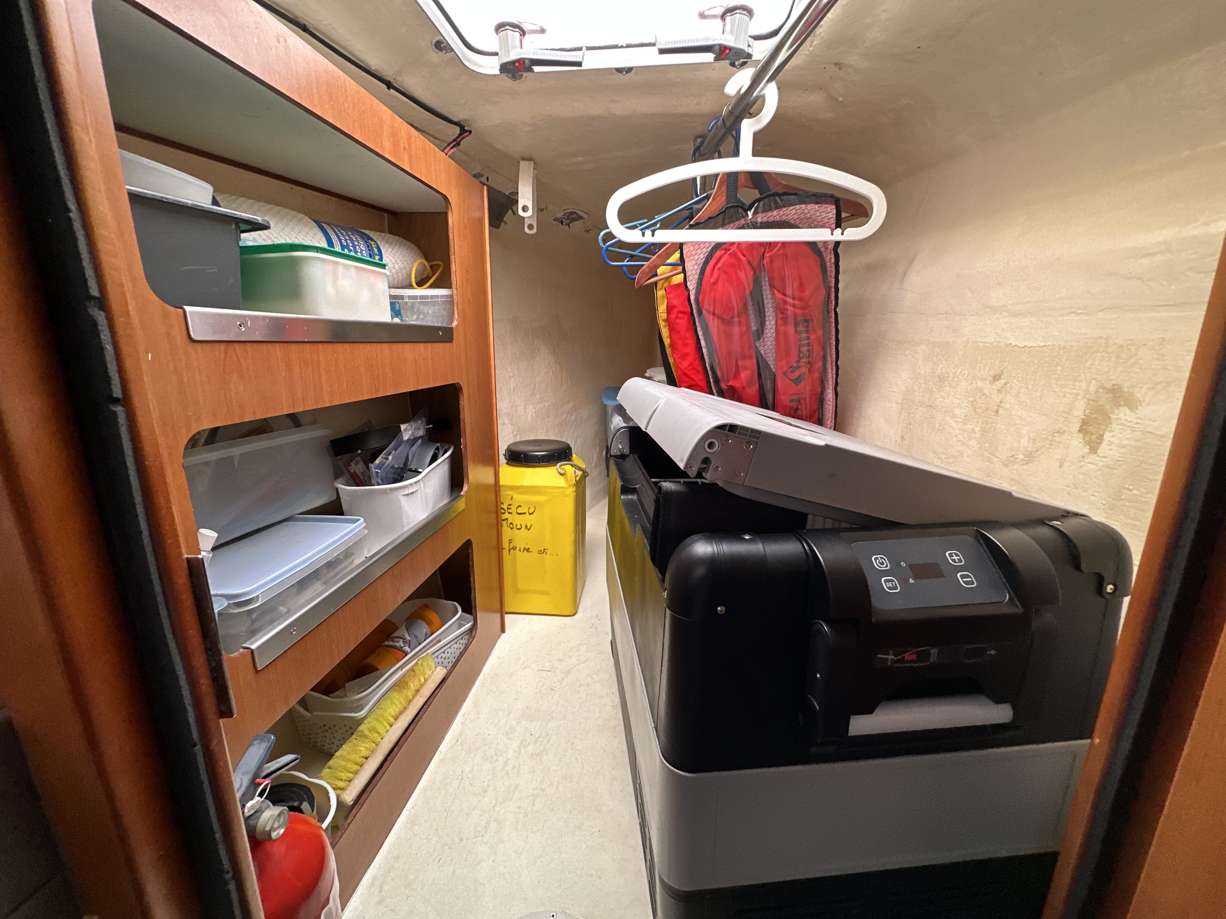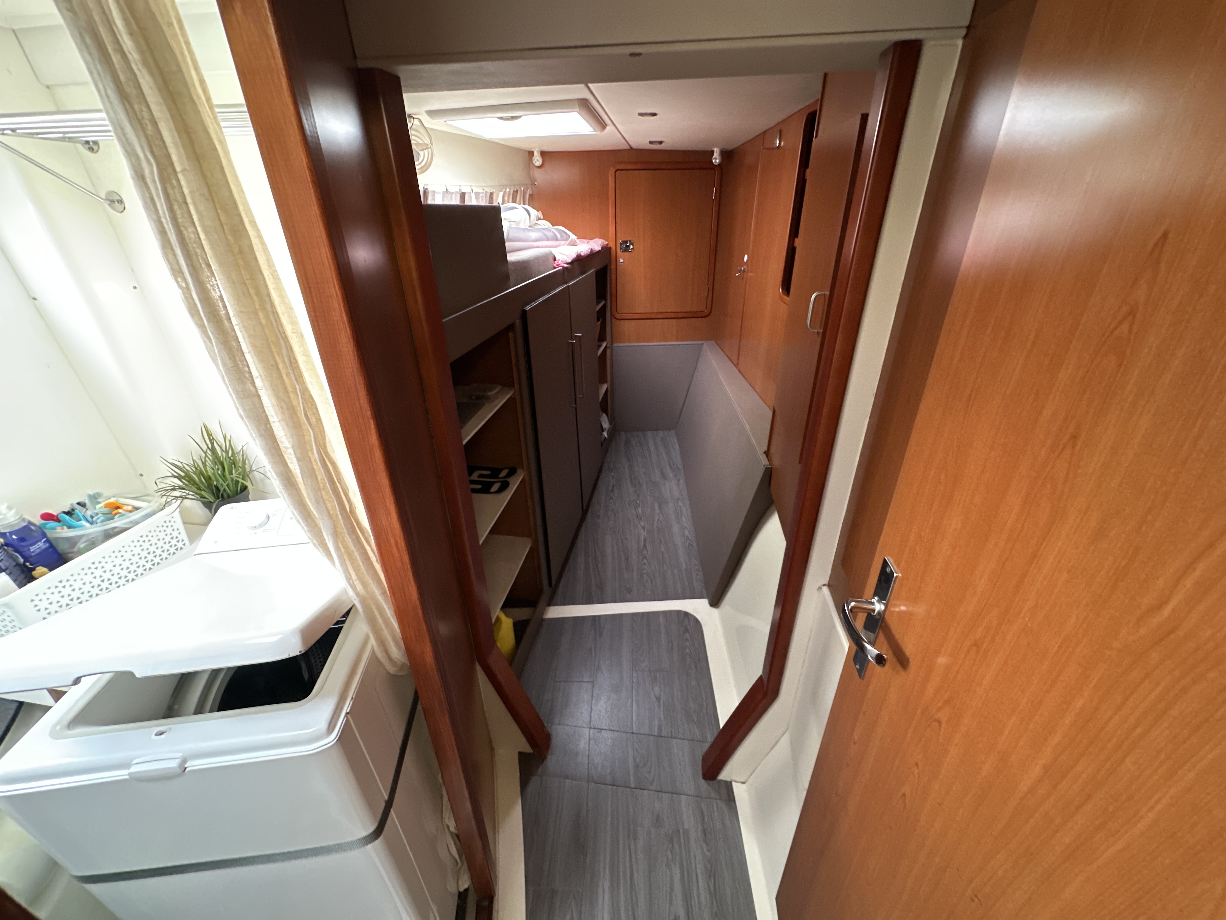 Converted forward port cabin to a utility room with storage racks and a berth. The ensuite head from this cabin is used as a laundry room with a washing machine dryer and a freezer with 5 drawers.