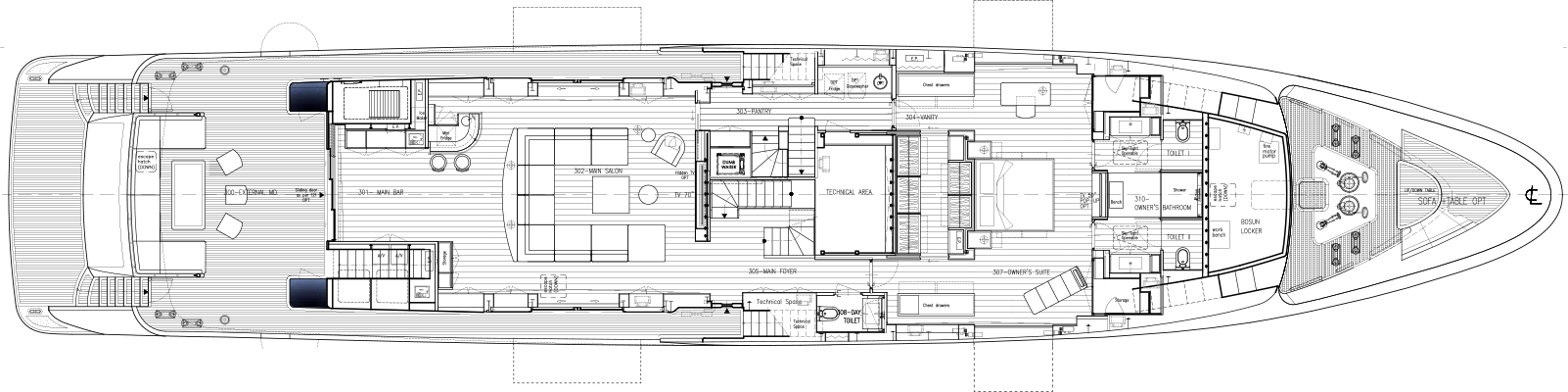 Full-beam suite on the main deck level with lateral balconies on both port and starboard, large double bed with under bed storage, night stands with reading lights, chest drawers, built in TV, large walk-in closet behind the headboard, lounge chair, vanity desk to port, working desk to port, his and hers bathrooms with marble finishes and skylights, large central shower
