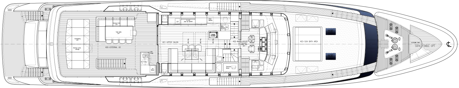 Located on upper deck, U-shaped sofa that doubles as dining area with up & down sliding table, three single dining chairs, dumb waiter access, bar area with mini fridge, sink, glass washer, storage, pop up TV system with cabinet storage, wine cooler, three large skylights, access to aft deck of flybridge through dual glass sliding doors with curtains